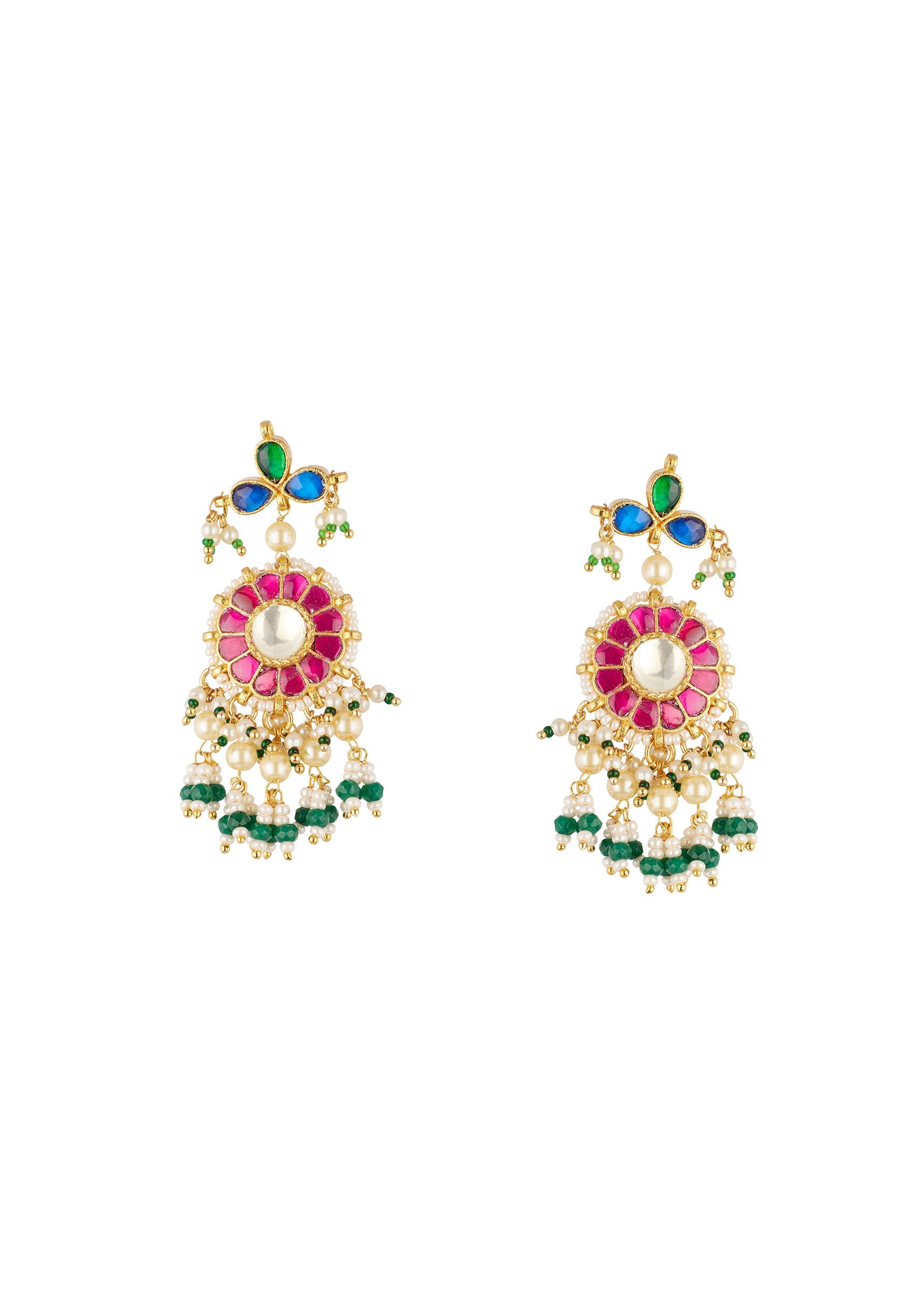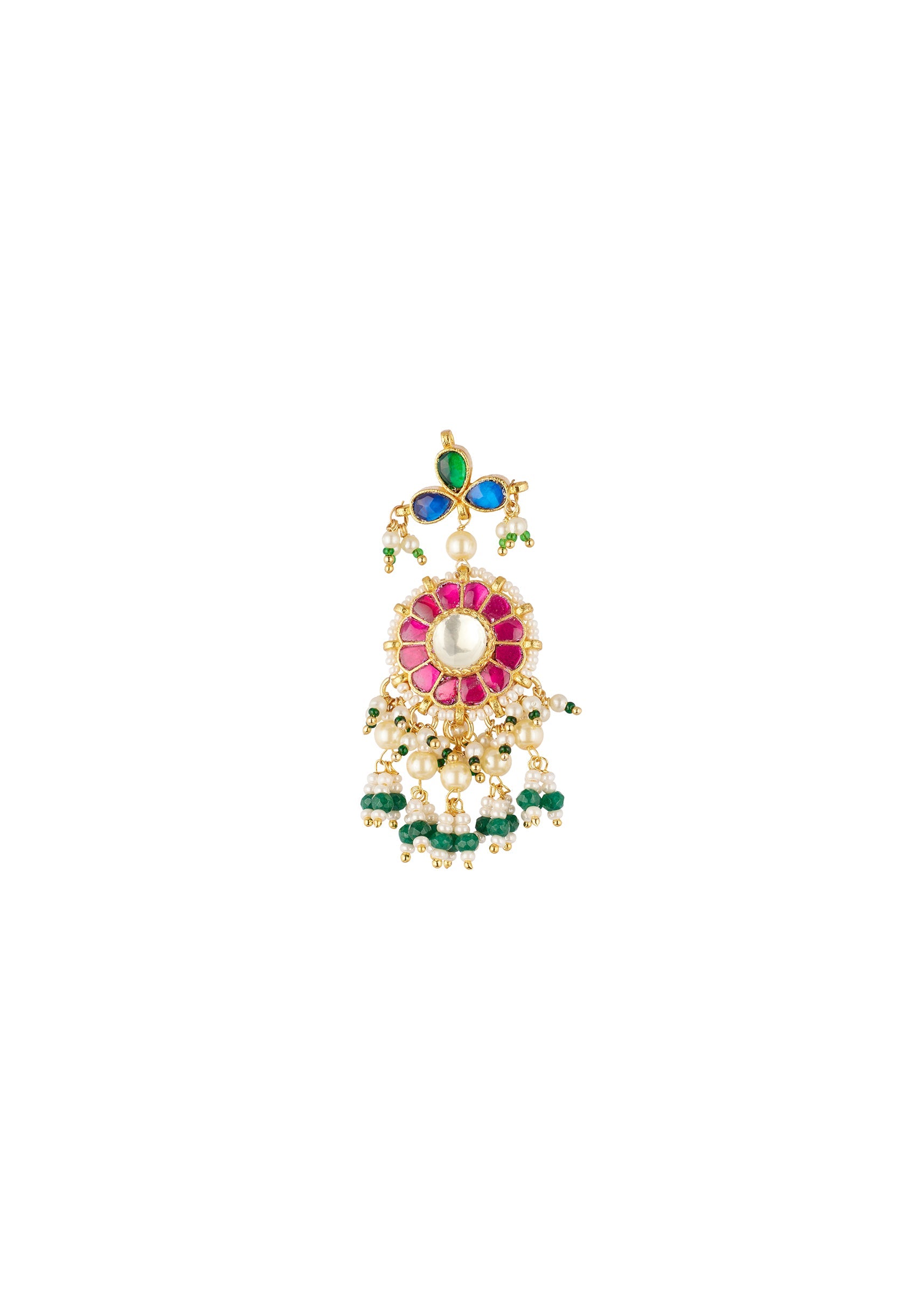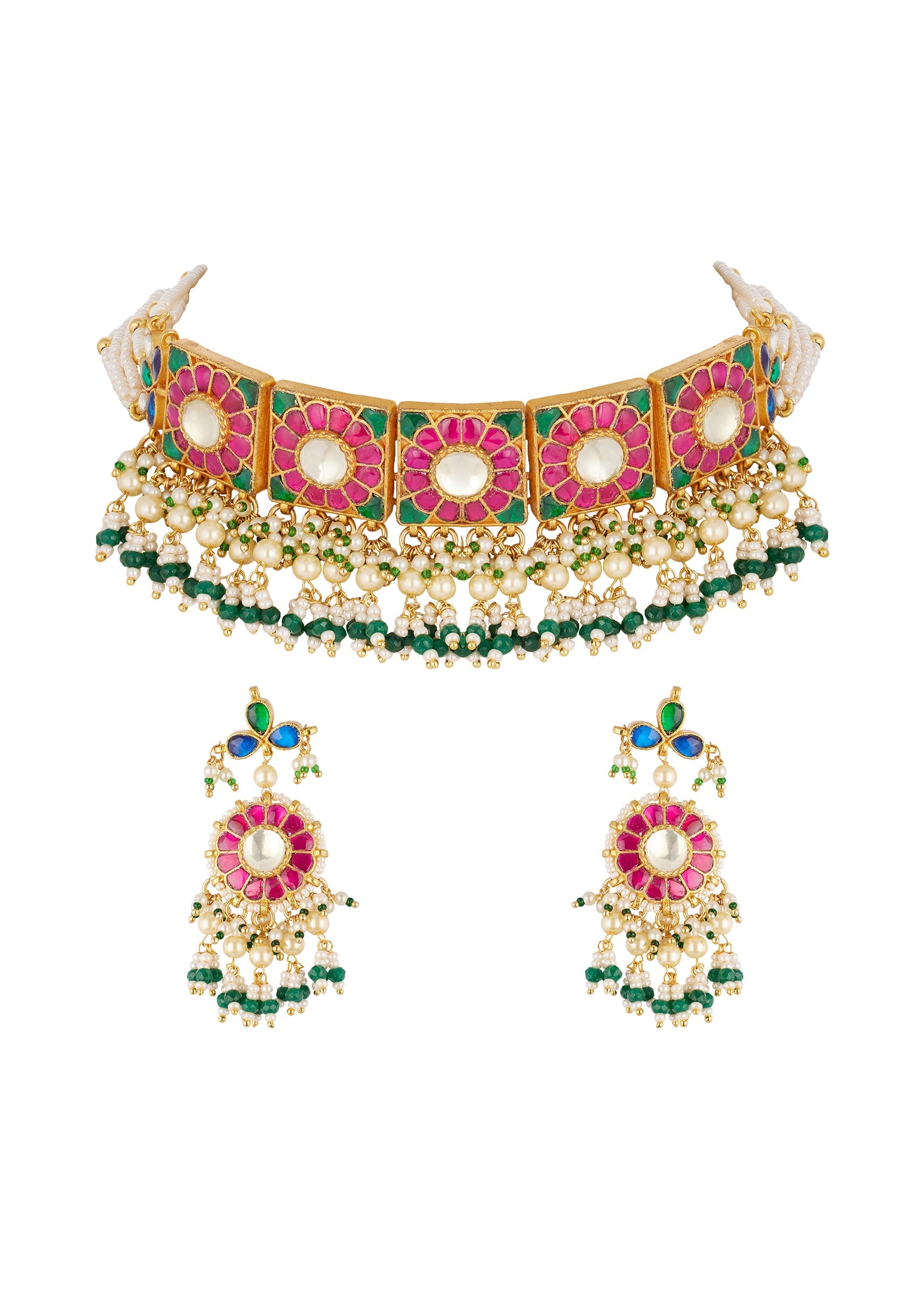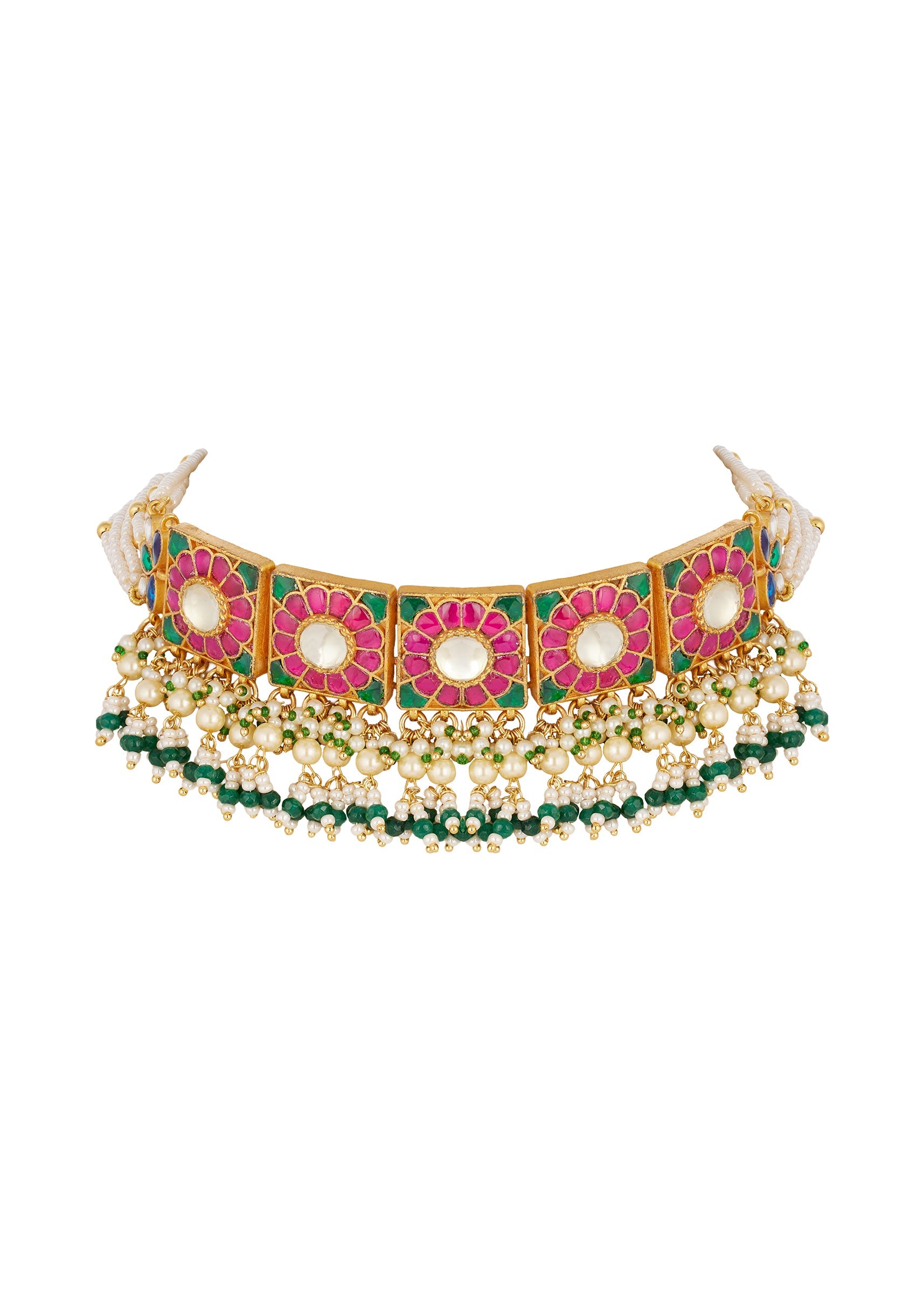 Pair this choker with a bright lehenga, floral saree, or a classic anarkali to highlight the Rani pink and green stones and pearl fringe.
