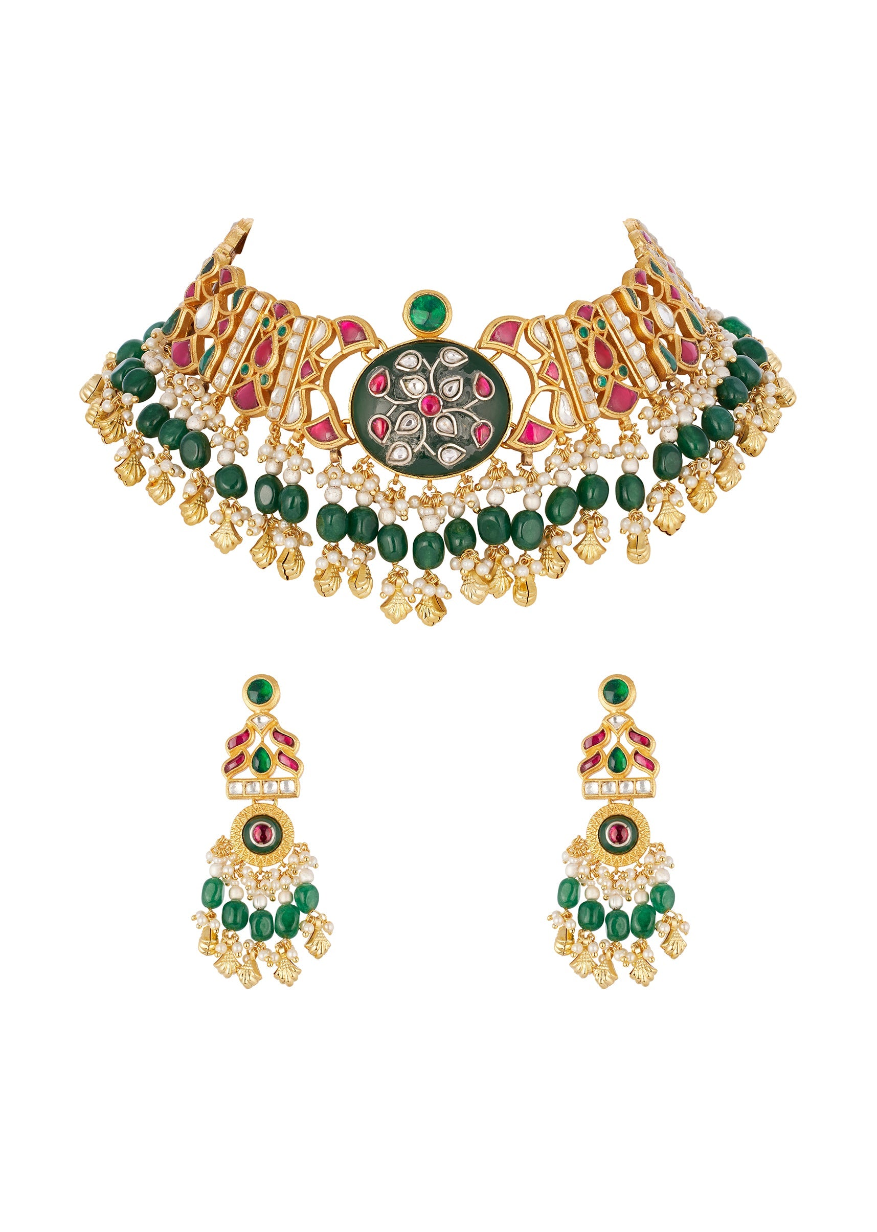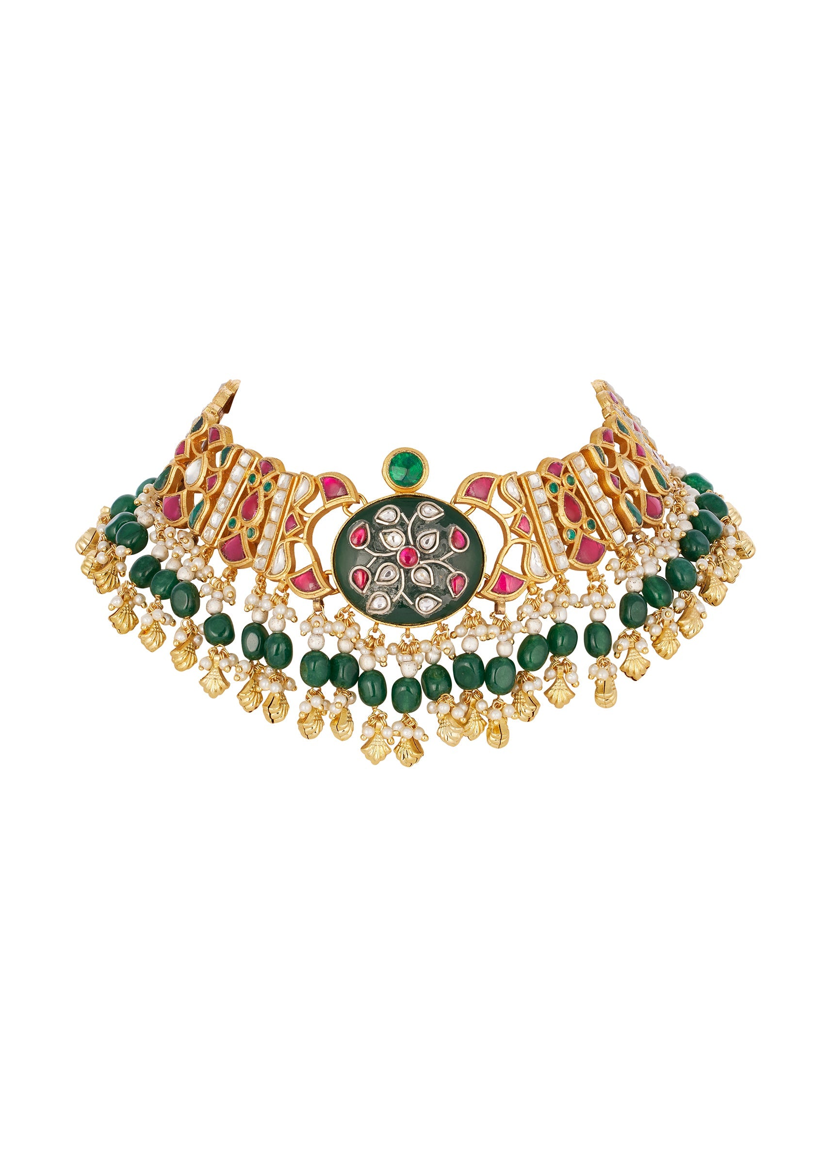 Gold Finish Choker Necklace Set In Mix Metal With Traditional Kundan Style And Red Green And White Simulated Stones And Emerald Style Bead Fringe