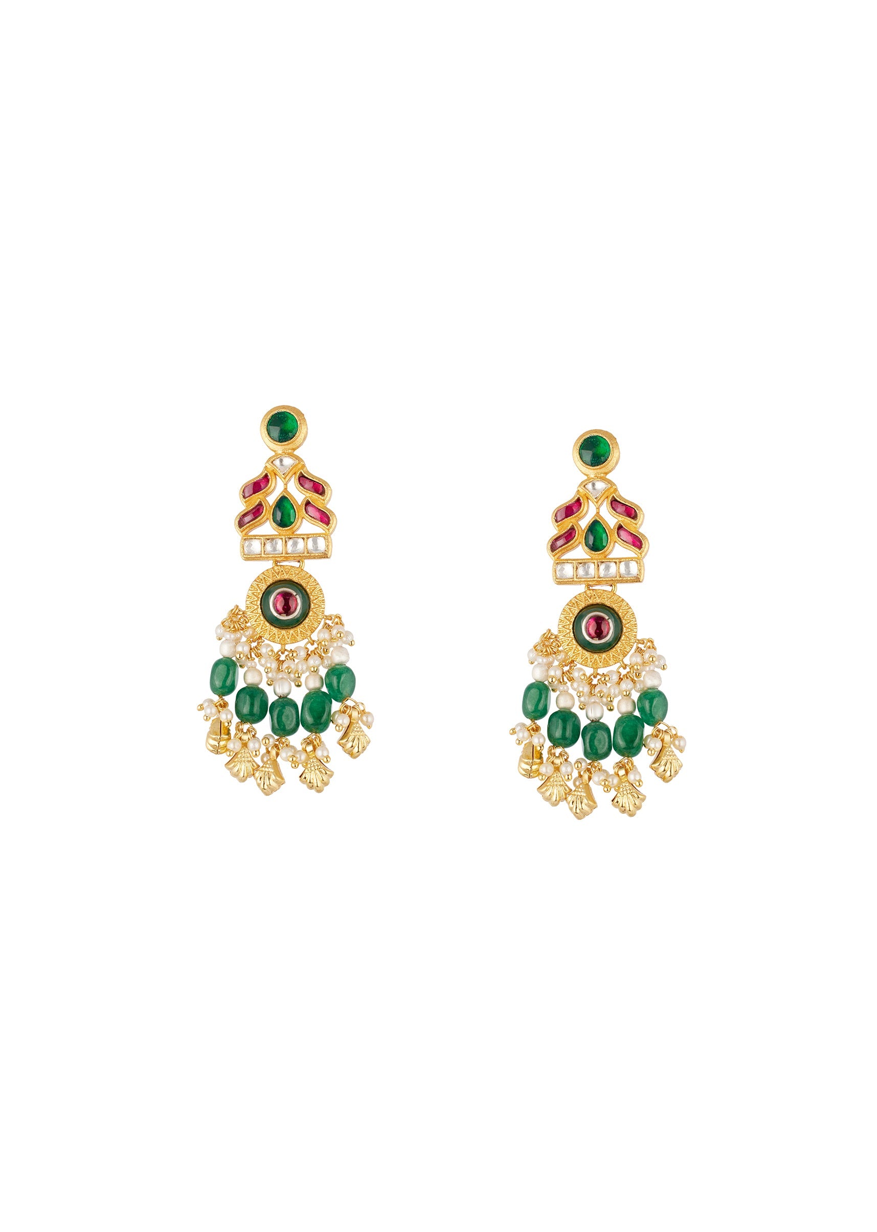 This traditional gold finish choker necklace set is crafted in mix metal and features a kundan style design with intricate filigree detailing. Accented with red green and white simulated stones and highlighted by a green enamel centerpiece, the necklace is finished with an emerald style bead fringe that adds richness and movement, making it a striking choice for wedding and festive occasions. Awarded as the Most Trusted Brand, we're delivering styles you love, just as promised.