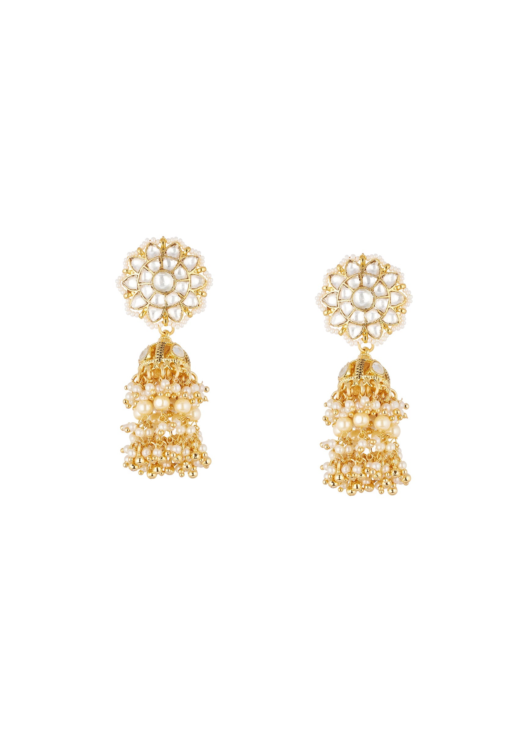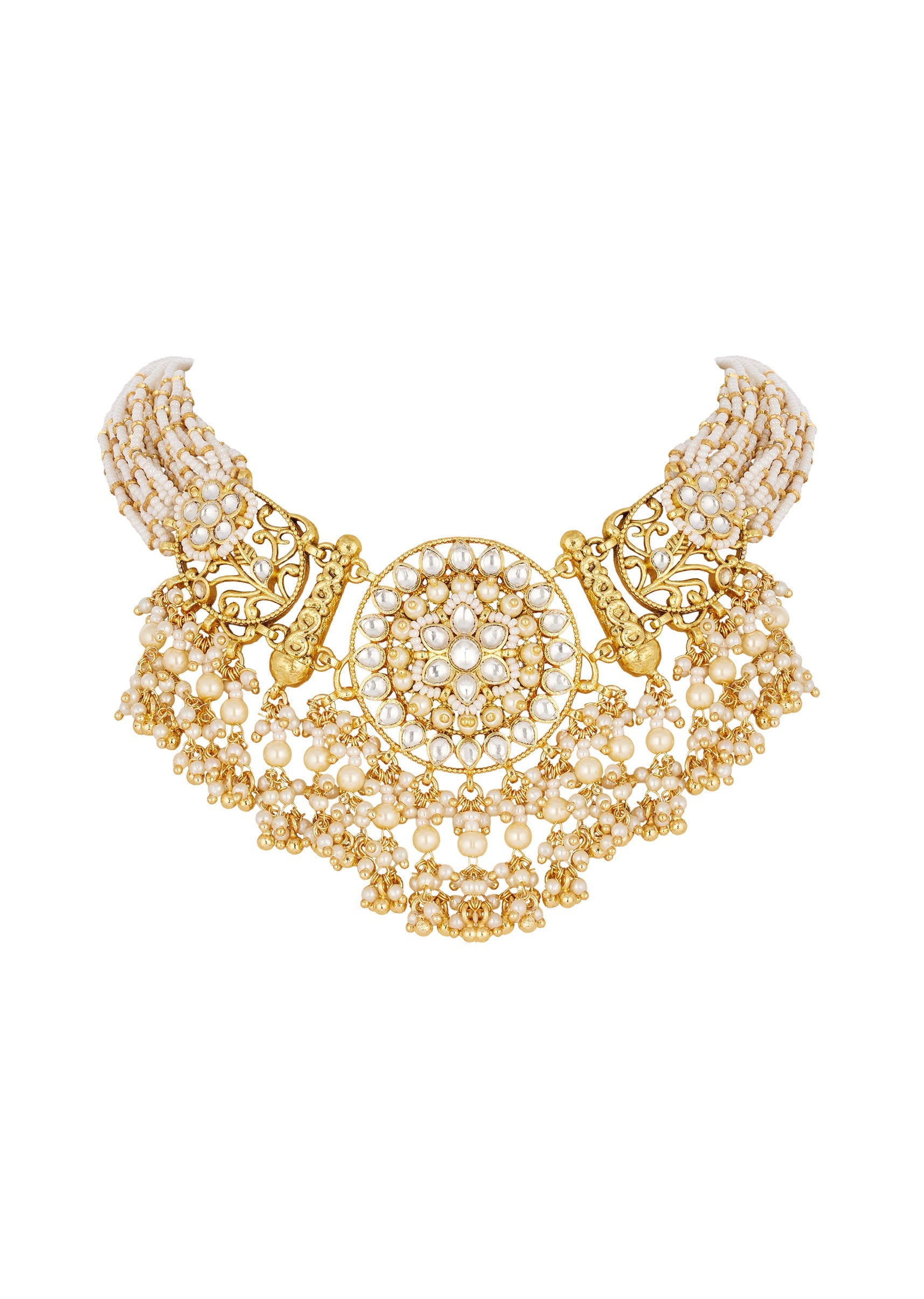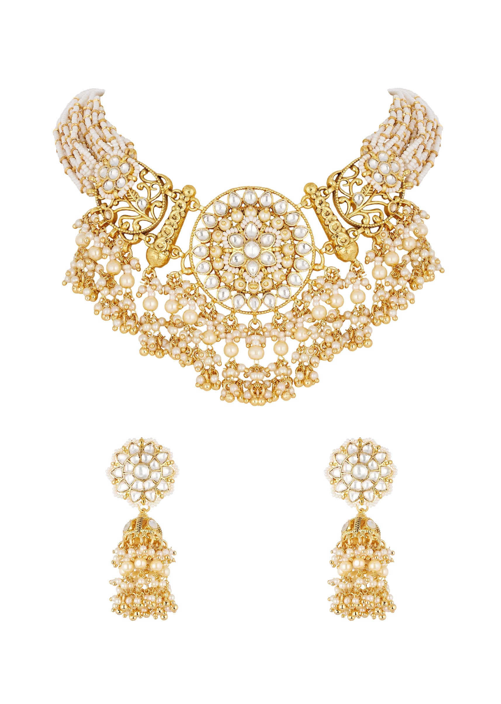 This traditional gold finish choker necklace set is crafted in mix metal and features a kundan style design with intricate filigree detailing. Accented with white simulated stones and finished with... More Product Details