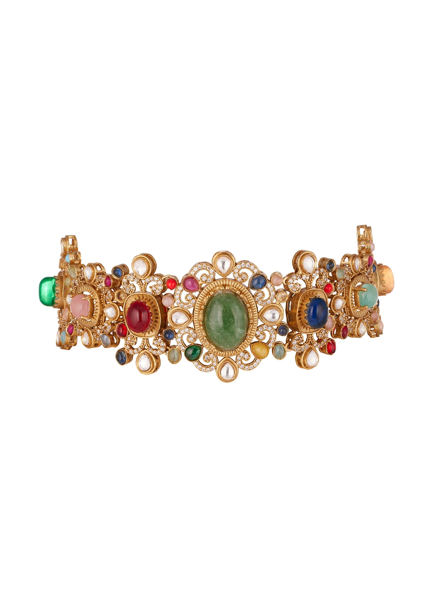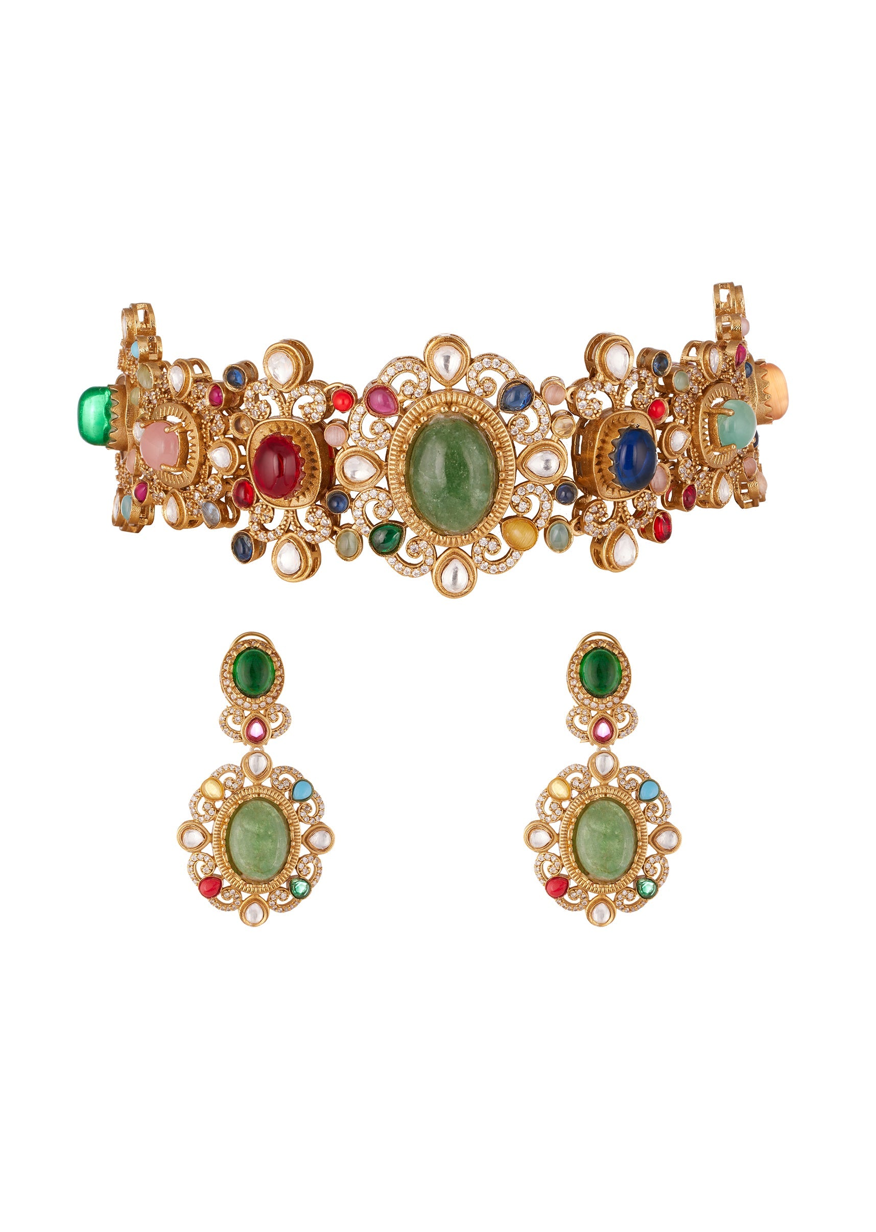 Gold Finish Choker Necklace Set With Kundan Work Clear Stones Navratna Dome Cut Detailing And Central Green Oval Stone