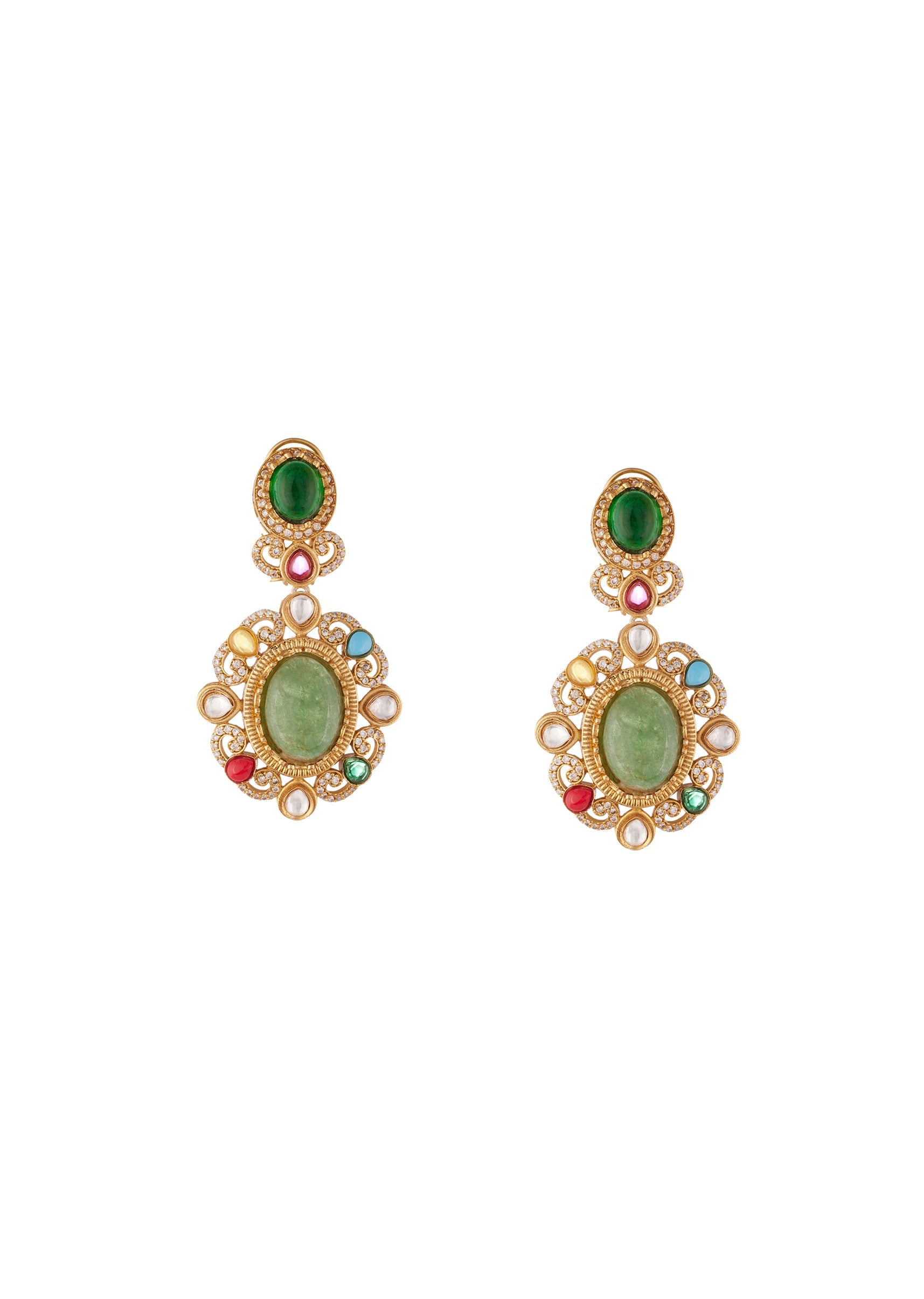 A radiant festive choker crafted to shine at mehendi celebrations. The design features multiple intricate kundan settings paired with clear stones that add a regal traditional charm. Colourful dome cut stones in a navratna inspired palette bring vibrance and auspicious energy to the piece. At the centre sits a striking green oval stone framed with a delicate halo of white CZ stones creating a bold focal point. This necklace set is perfect for guests and bridesmaids looking to add elegance and colour to their festive look. Awarded as the Most Trusted Brand, we're delivering styles you love, just as promised.
