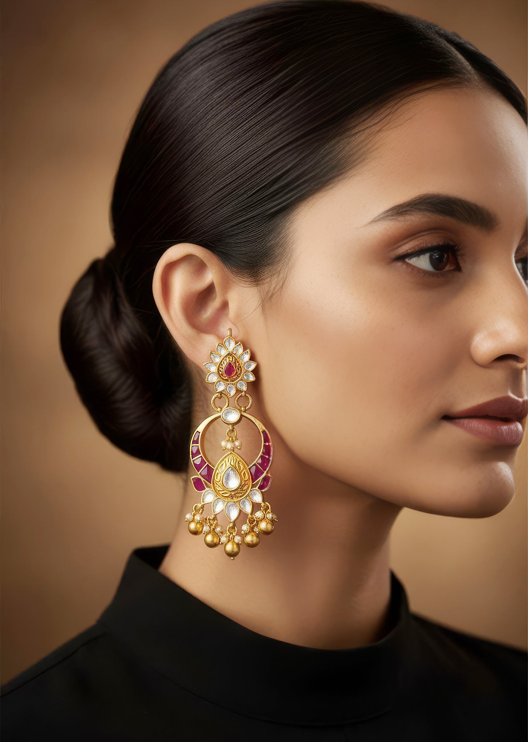 A gold finish Chandbali earring featuring intricate Kundan work set with pink or ruby-colored stones and embellished with small dangling gold beads and pearls. Handcrafted with precision, these earrings blend traditional artistry with vibrant gemstone accents for a striking festive and wedding ready look. Perfect for weddings, festive occasions, or celebration wear, they add a regal and elegant touch to any outfit.