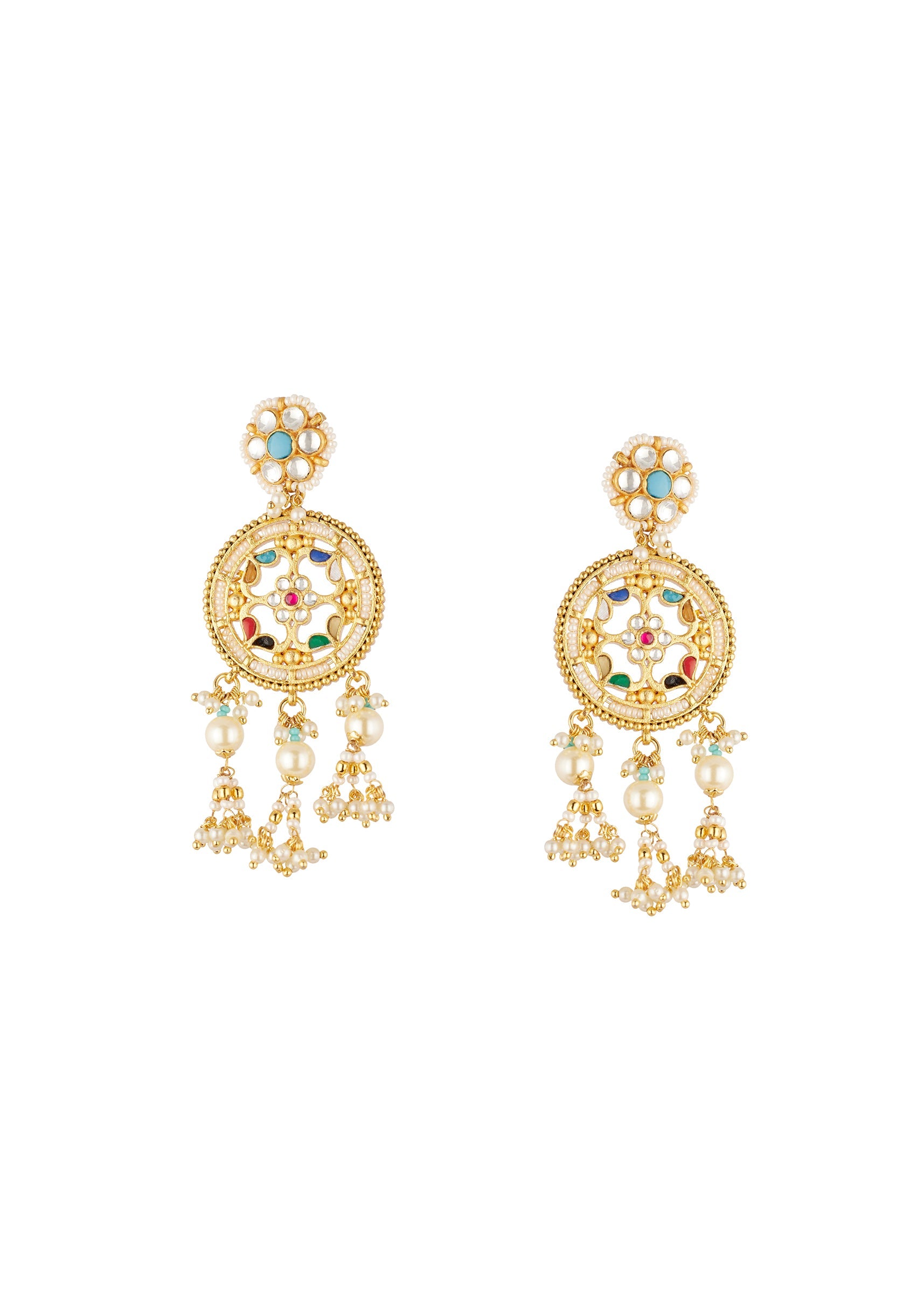 These gold finish earrings are crafted with traditional temple inspired motifs, detailed with vibrant green, purple, red, yellow and blue simulated stones. Faux pearl accents add a classic touch, enhancing... More Product Details