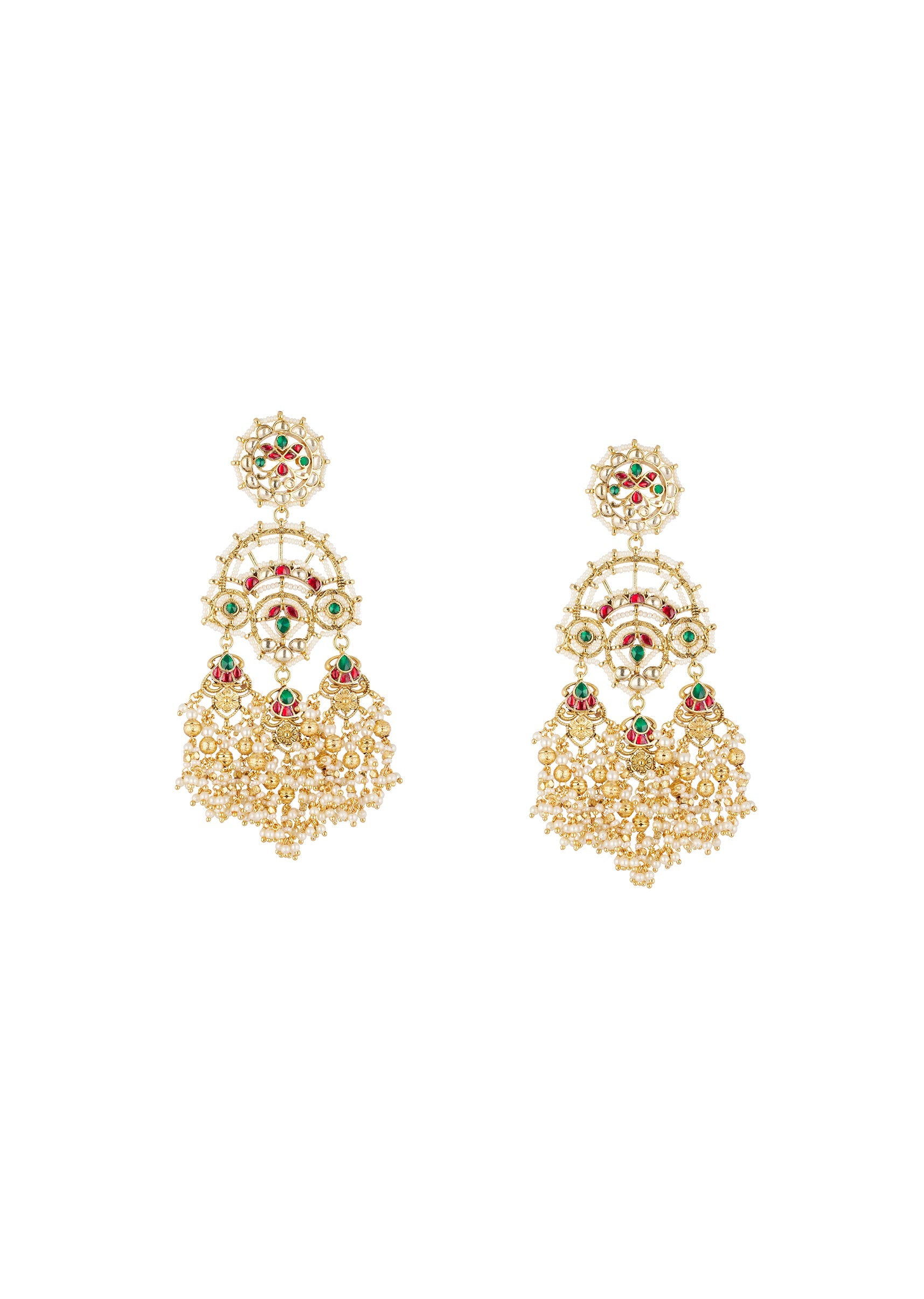 Gold Finish Earrings With Traditional Temple Style And Green And Red Simulated Stones And Faux Pearls Accents