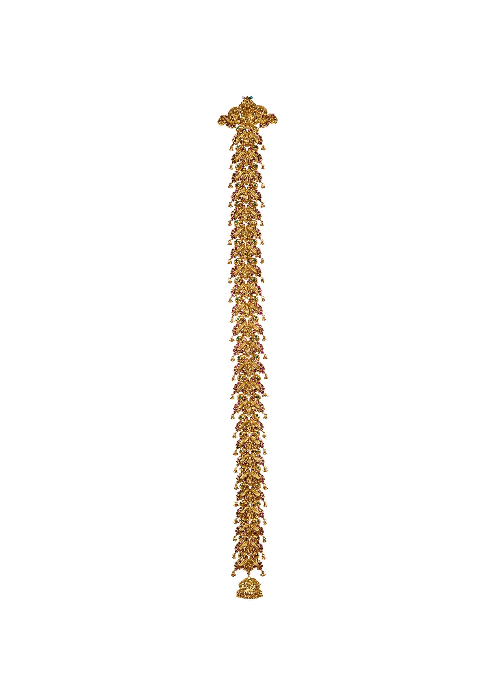 Style it with a silk saree or a festive lehenga to highlight the temple motifs and green and pink stone detailing.
