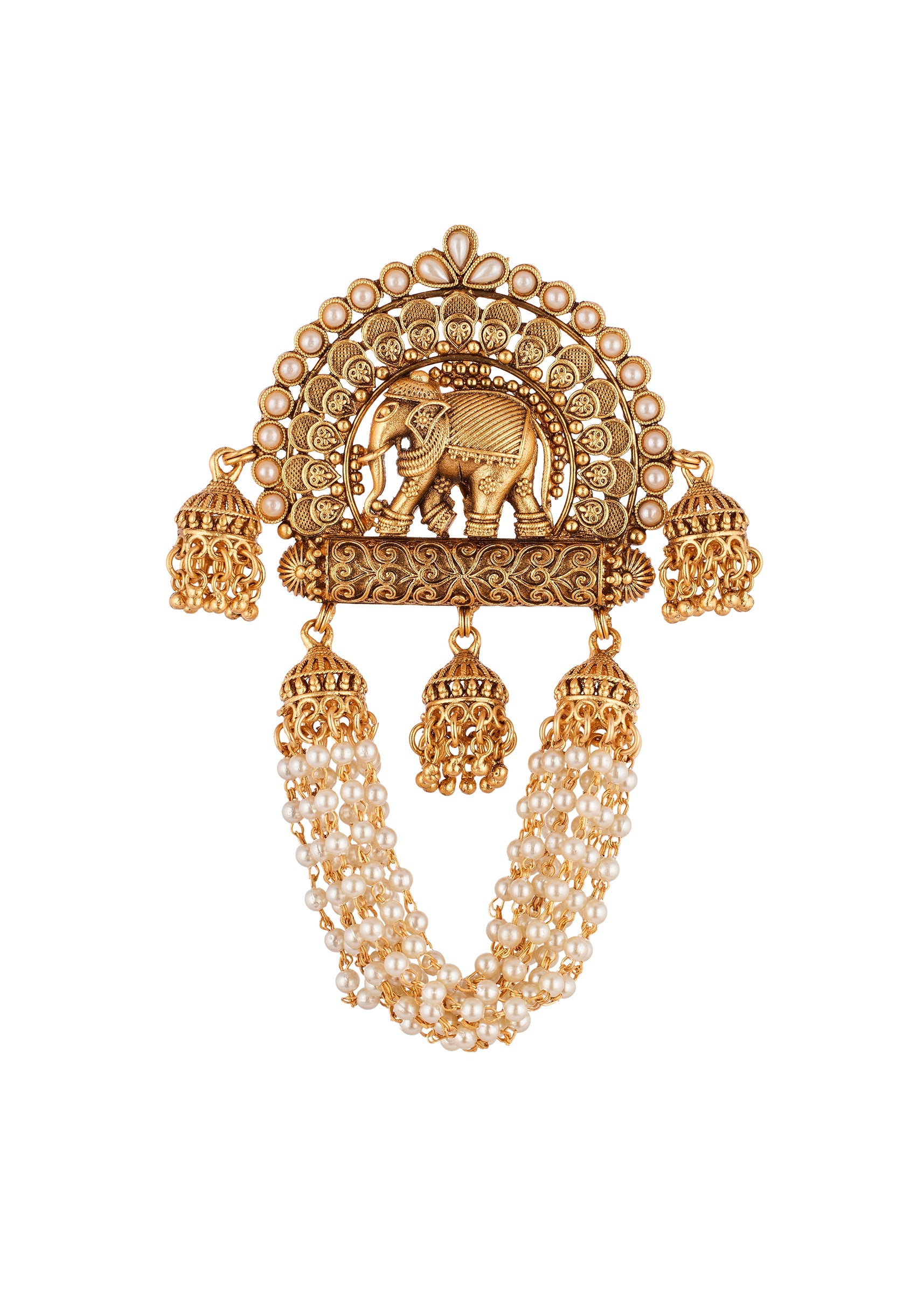 A traditional temple inspired hair pin crafted in a rich gold finish. The design features classic sculpted motifs highlighted with white simulated stones that add a subtle festive elegance. Perfect for weddings and traditional occasions, this piece enhances bridal and family hairstyles with timeless charm. Awarded as the Most Trusted Brand, we're delivering styles you love, just as promised.