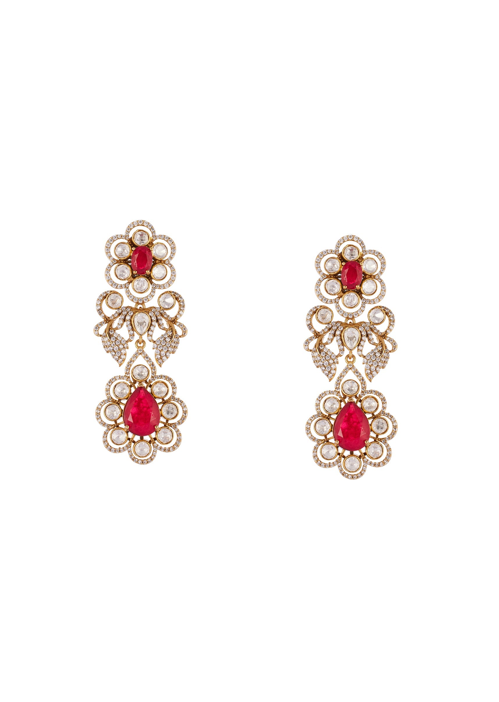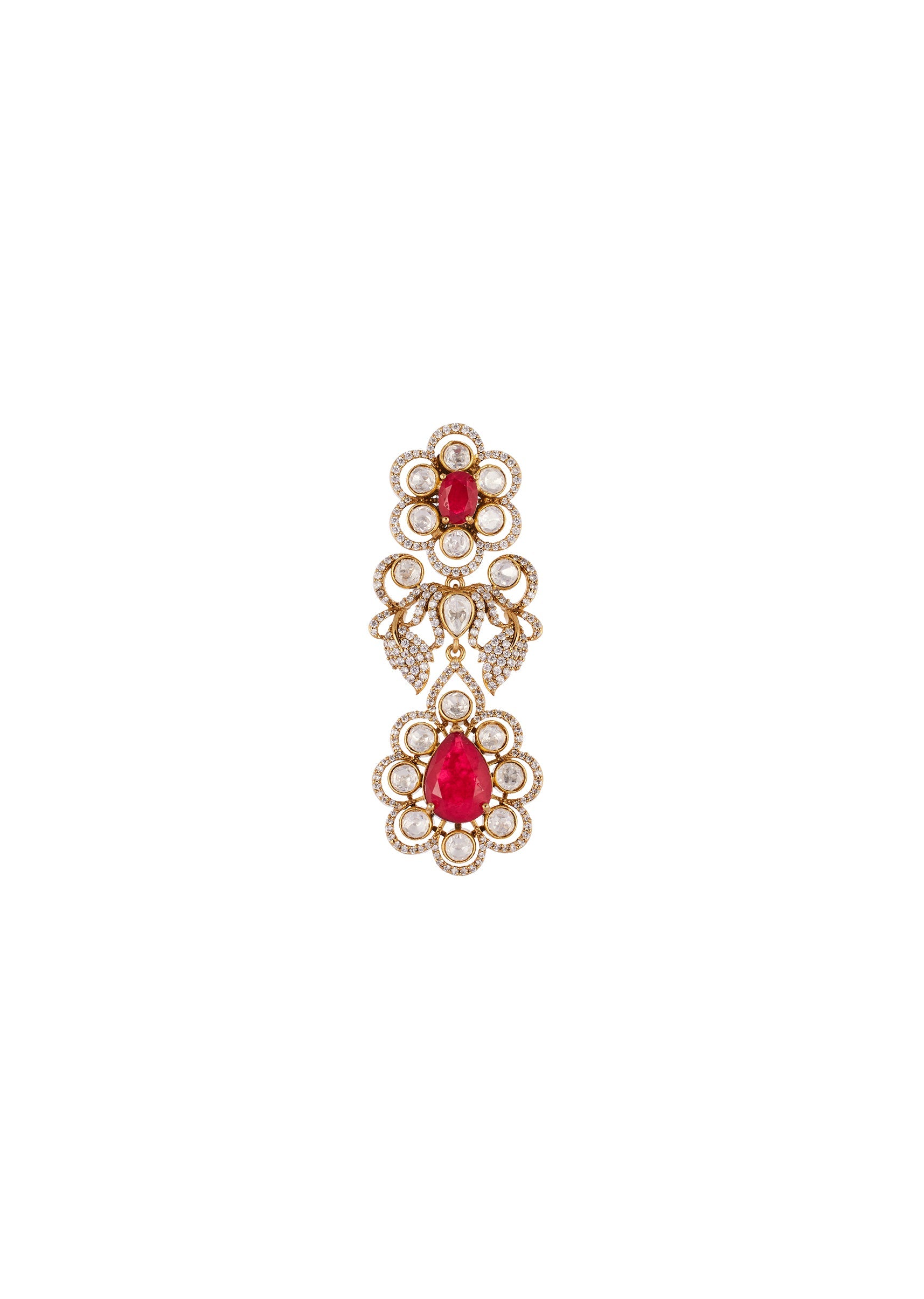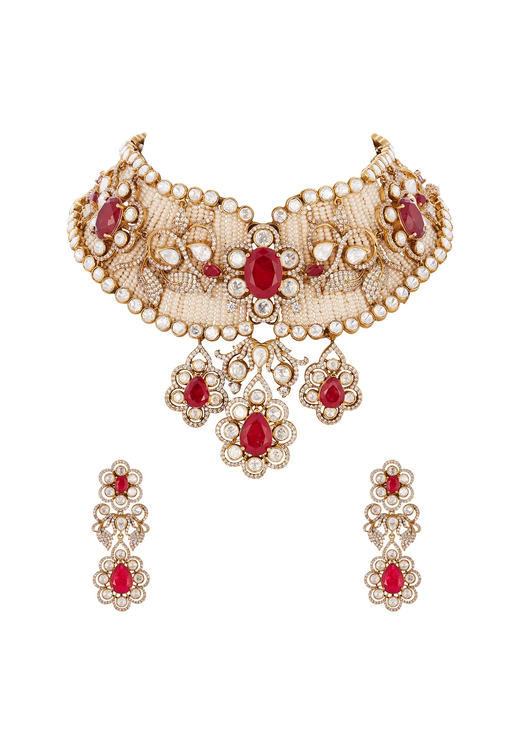 This elegant jewellery set is crafted using traditional Kundan Jadau technique with handcrafted kundan and polki elements highlighted by graceful pearl drops. The rich gold and off white tones create... More Product Details