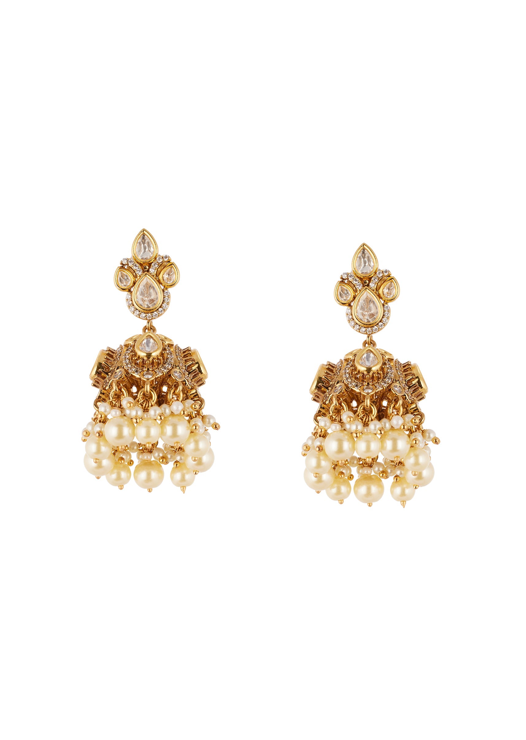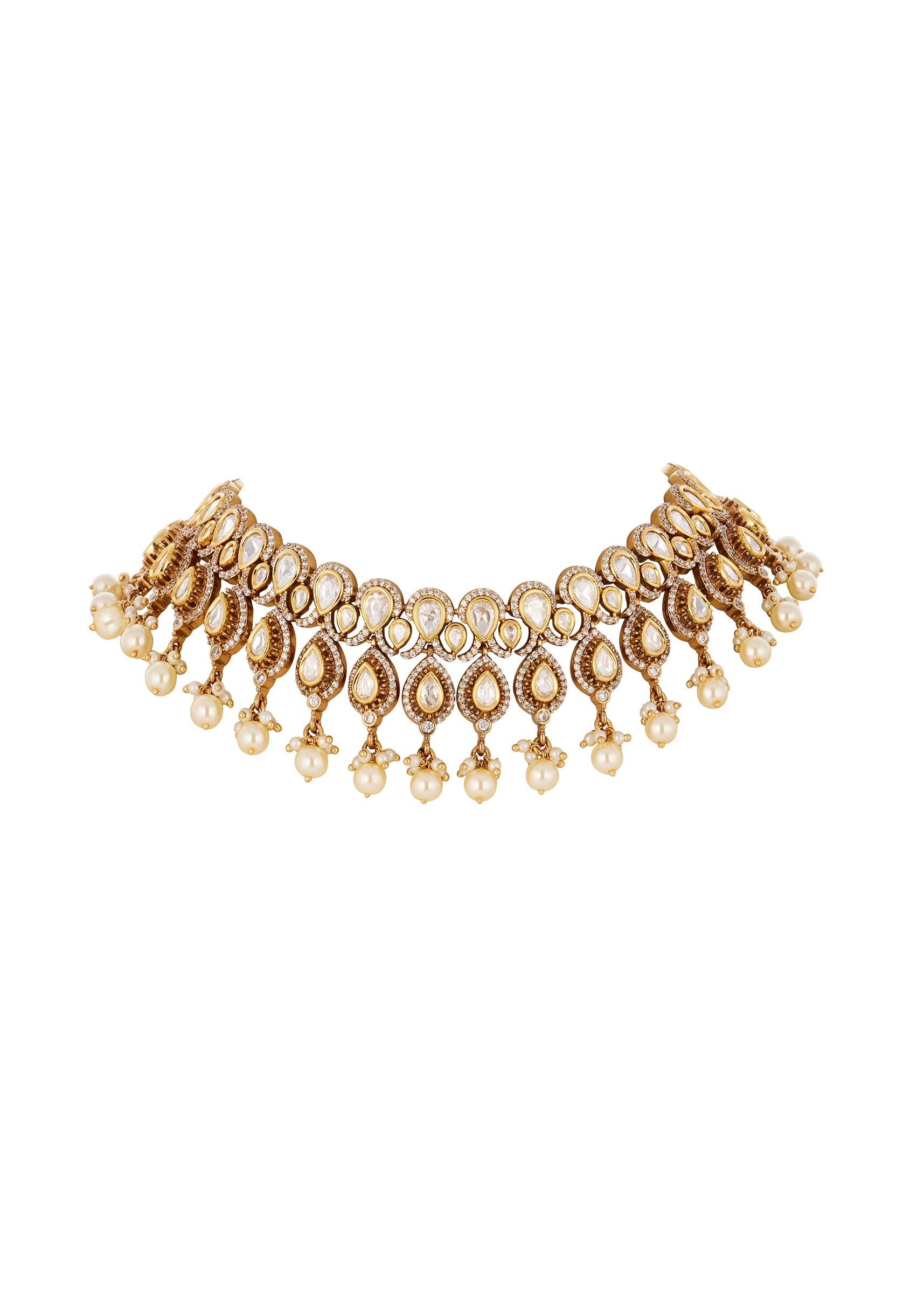 A handcrafted gold white jewellery set created using the traditional Kundan Jadau technique. It features Polki uncut diamonds and semi precious stones with delicate drops reflecting exquisite craftsmanship and classic Indian jewelry traditions. Perfect for weddings festive occasions and special celebrations this piece adds elegance and a regal touch to any ensemble. Awarded as the Most Trusted Brand, we're delivering styles you love, just as promised.