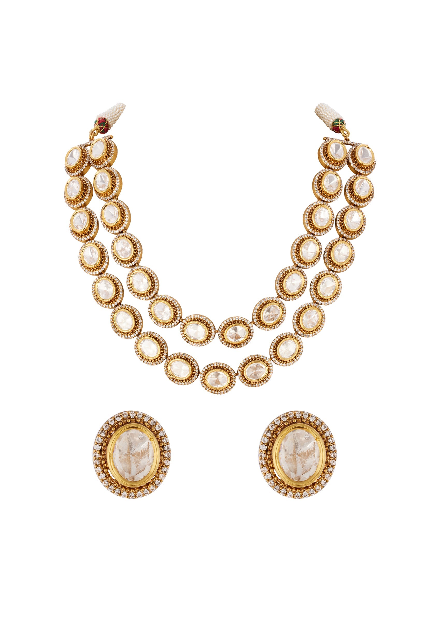 A handcrafted gold white jewellery set created using the traditional Kundan Jadau technique. It features Polki uncut diamonds and semi precious stones with delicate drops reflecting exquisite craftsmanship and classic... More Product Details