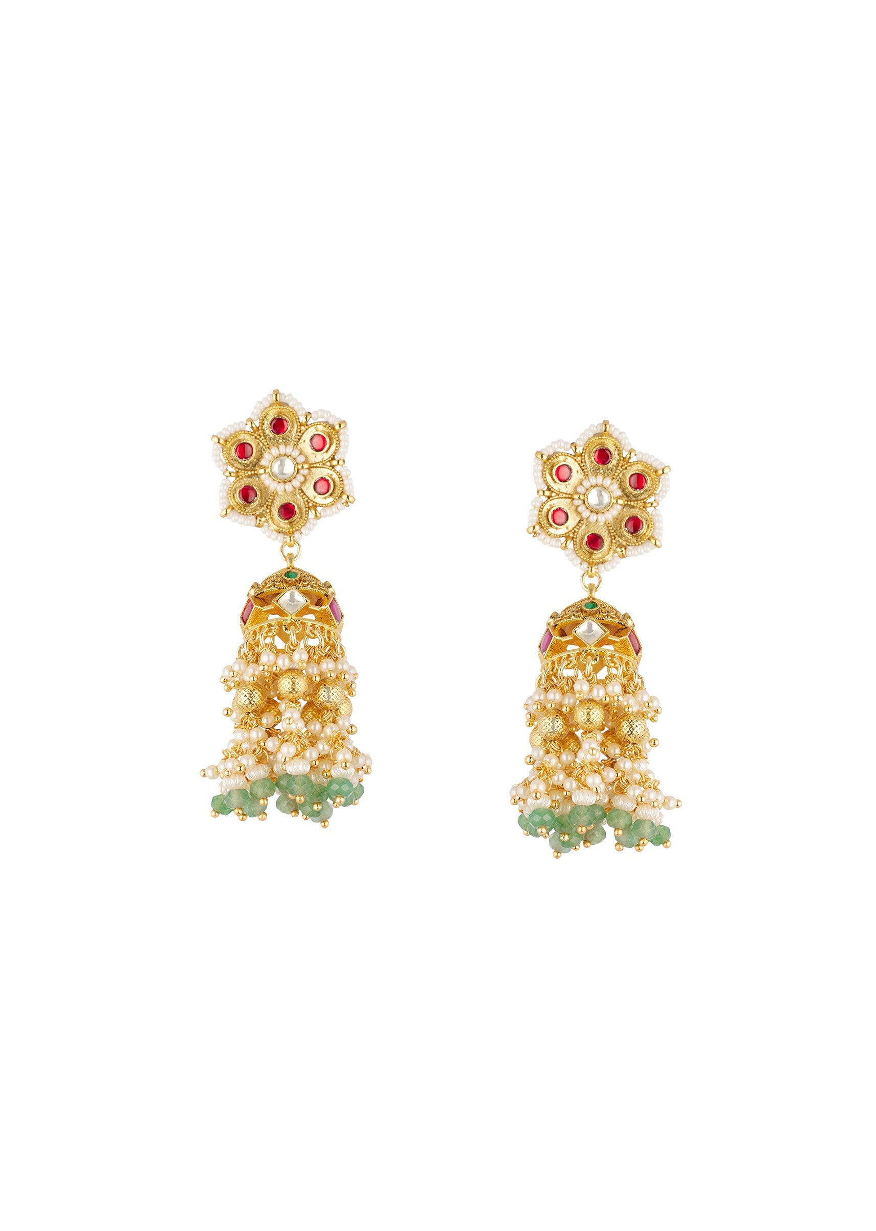 Gold Finish Jhumka Earrings In Mix Metal With Floral Stud And Green and White Bead Tassels
