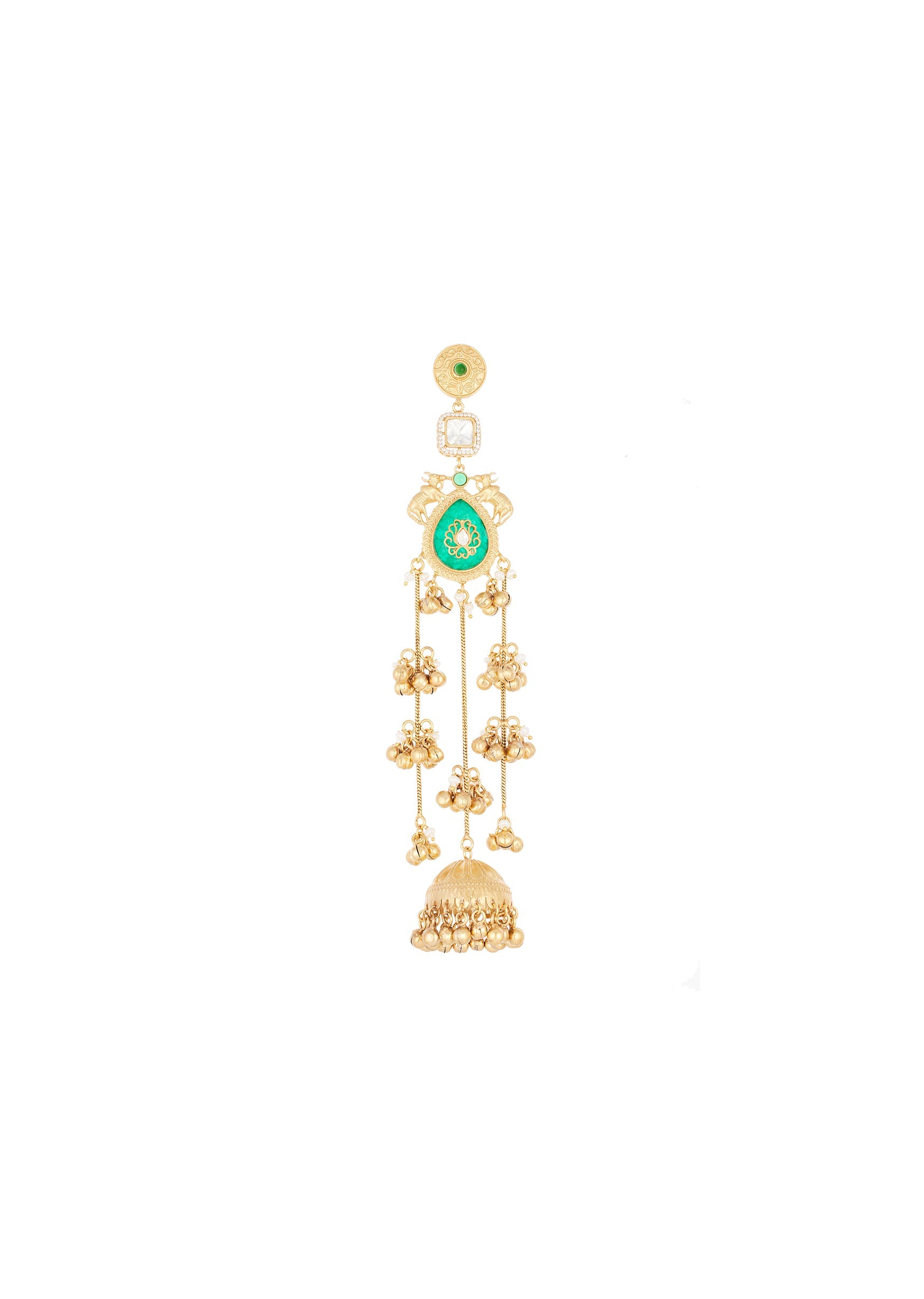 A stunning handcrafted jhumka designed with a vibrant green centre, delicate Kundan inspired detailing, and cascading multi tiered drops. Finished with an ornate dome and gold beads, this piece adds... More Product Details