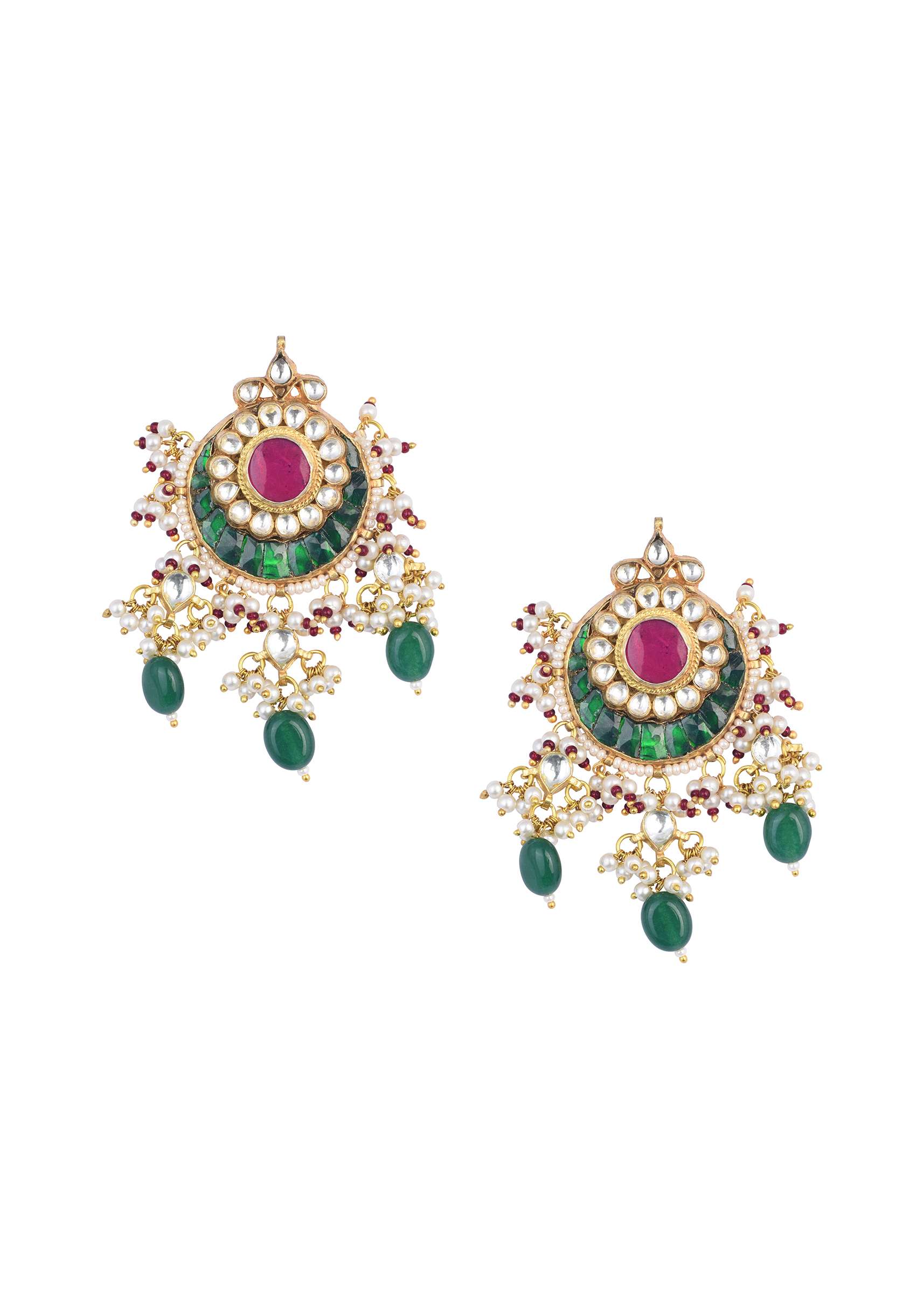 Gold Finish Kundan Chandbalis With Green Stone Drops