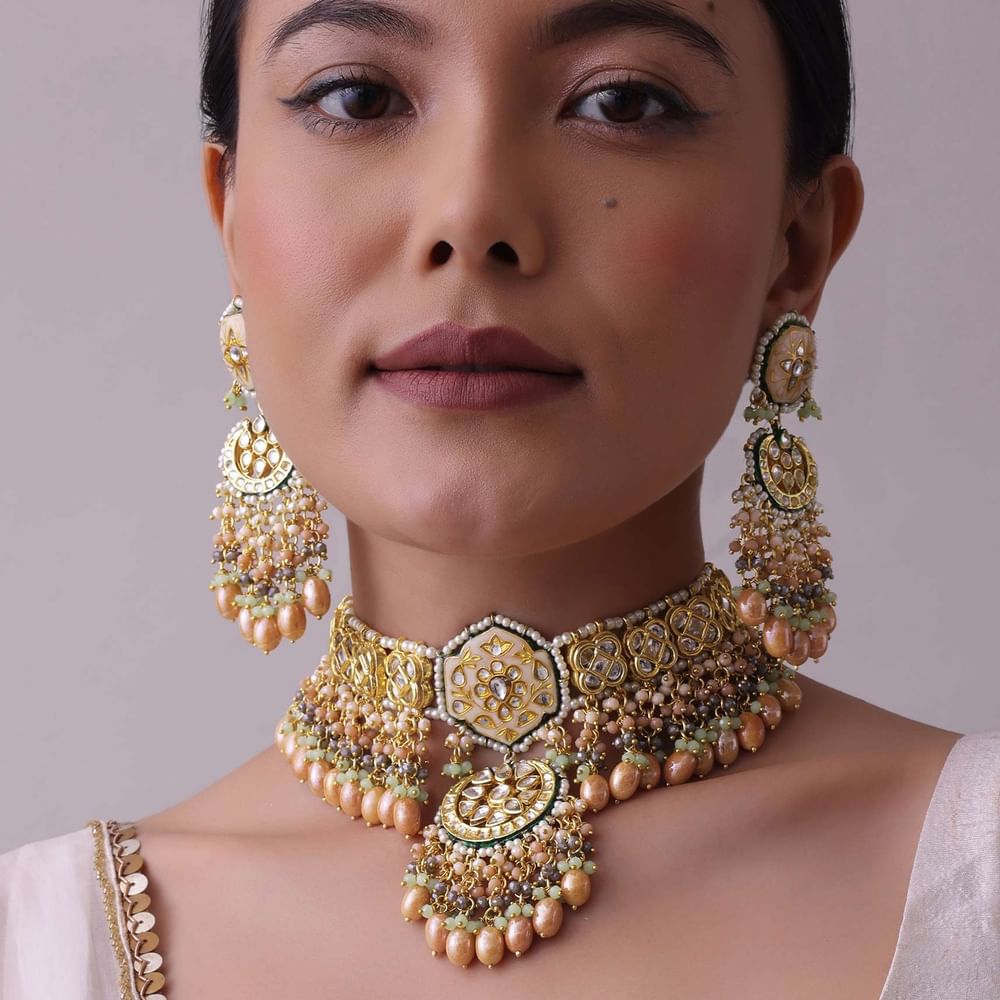 Introducing our gold-finish choker necklace and earring set, a stunning piece of jewelry that blends traditional and modern design elements. Crafted from high-quality mixed metal, this choker necklace set boasts intricate kundan work and colorful meenakari work. This set is a must-have for anyone who wants to make a statement with their jewelry.EVENT - Perfect for weddings, engagements, or parties.Avoid contact with water, chemicals, harsh liquids, perfumes, etc.Do not wear this piece of jewelry while showering, gymming, swimming, etc.Hard contact must be avoided completely.Please keep the product away from moisture and humidity when not in use.Baroque pearls and Natural stones can range from minor aberrations to distinctly ovoid, curved, pinched, or lumpy shapes.Slight variations in design may vary. Awarded as the Most Trusted Brand, we're delivering styles you love, just as promised.