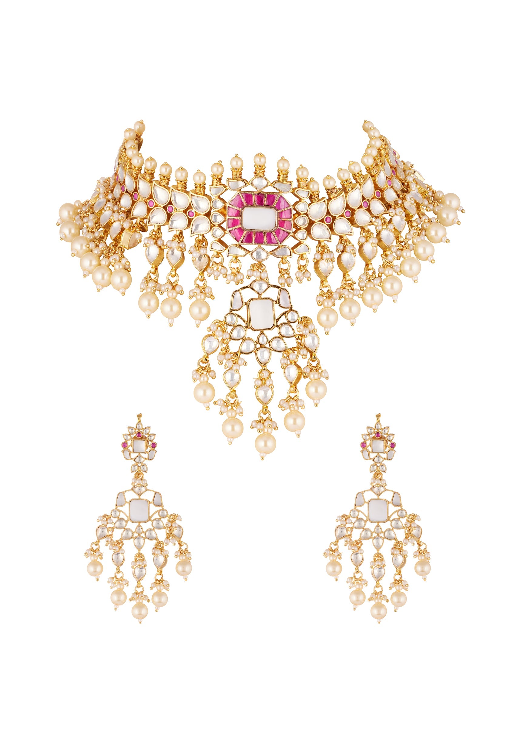 Gold Finish Kundan Choker Necklace Set With Pink White Stones And Heavy Pearl Danglers