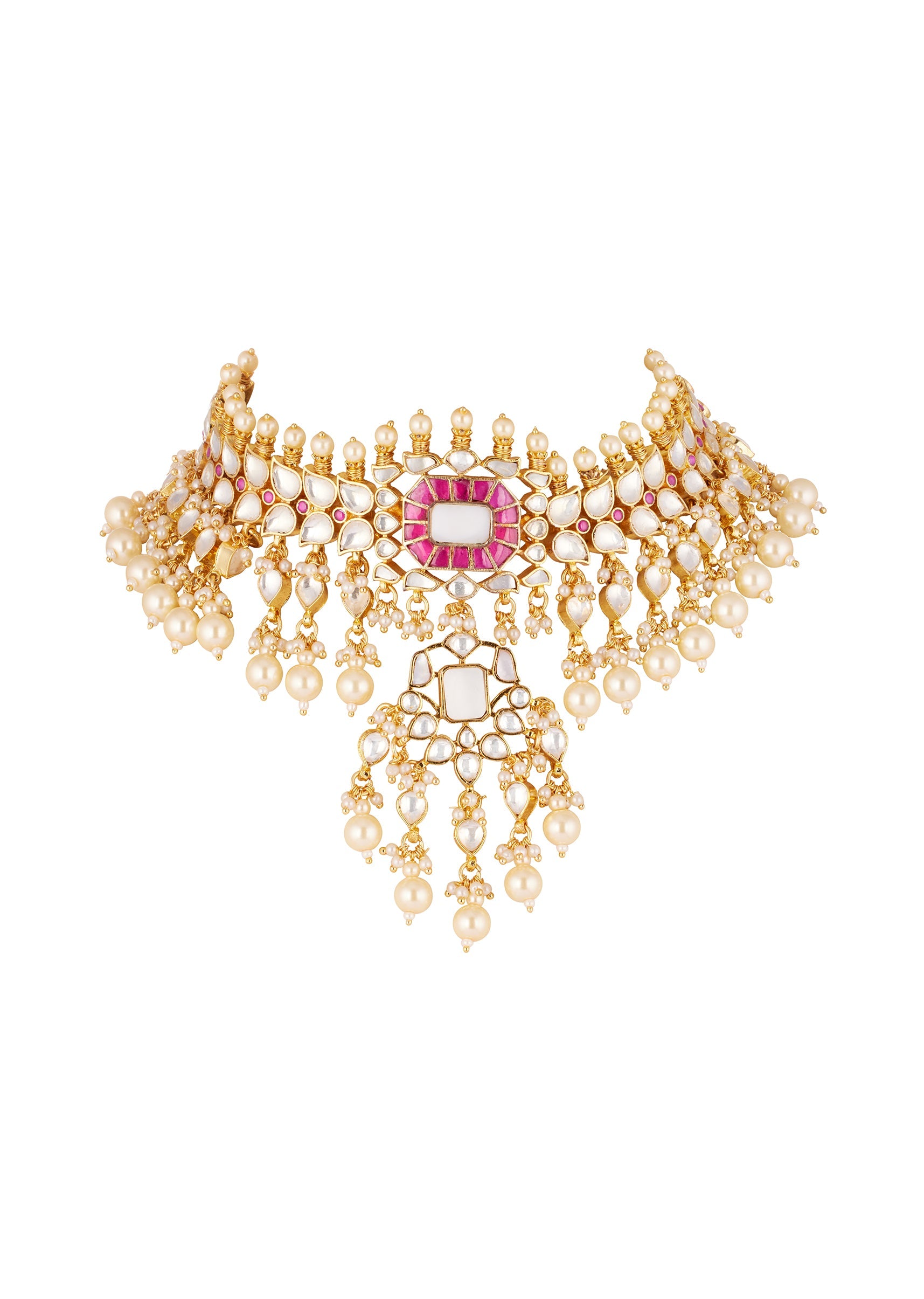 A regal bridal choker designed for wedding haldi and mehendi functions. The piece features intricate kundan work set with pink and white stones and is adorned with heavy pearl dangles... More Product Details