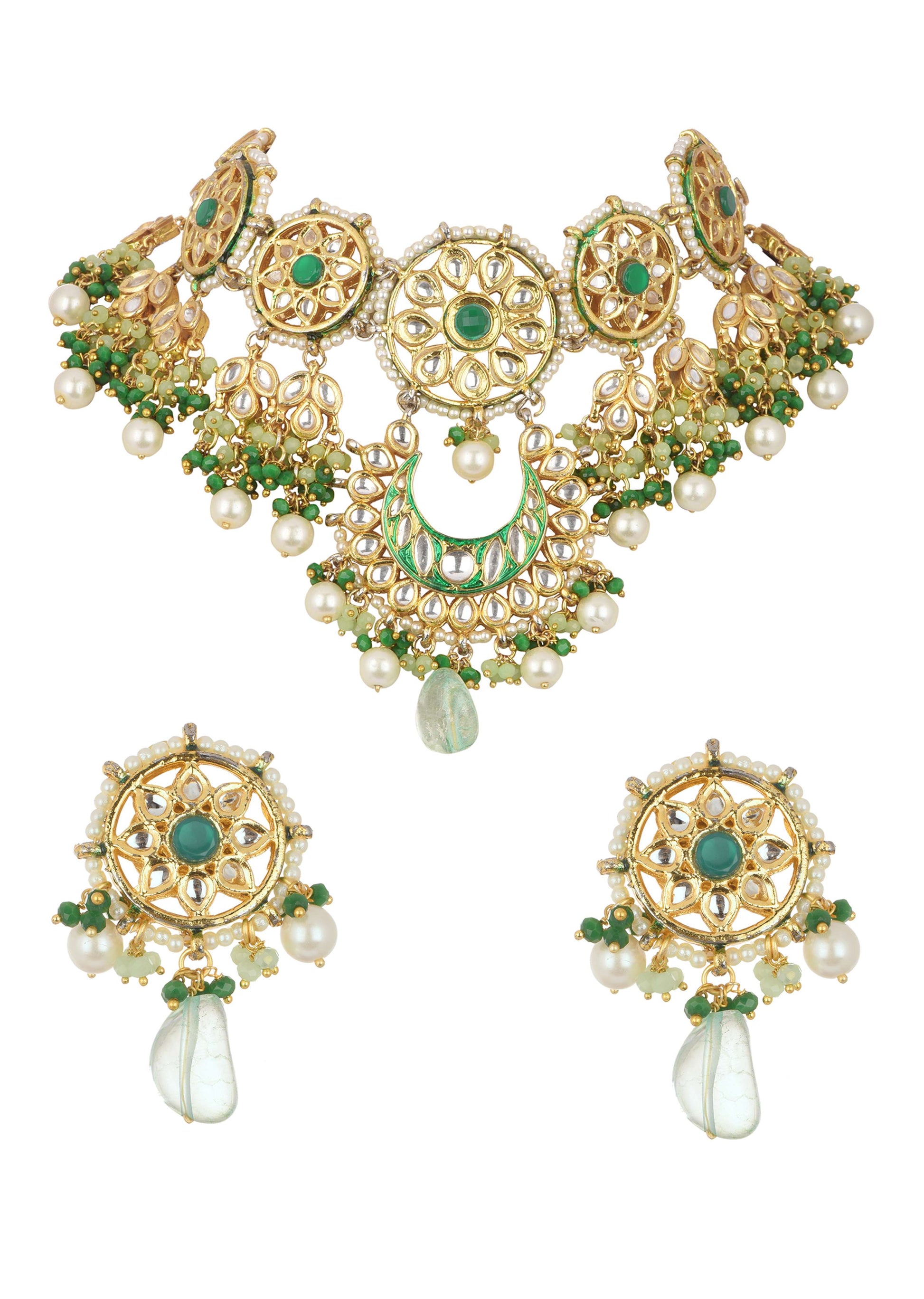 Step into a world of grandeur with our gold finish kundan choker set in mix metal. This choker and the studs are embellished with captivating green drops and lustrous pearls. EVENT - Perfect for weddings festive celebrations and glamorous evening events.Store in a dust bag. Keep away from moisture perfume alcohol and harsh chemicals. Spot clean only. Keep away from sharp objects. Actual color may slightly vary due to photographic lighting sources and device screen settings. Awarded as the Most Trusted Brand, we're delivering styles you love, just as promised.