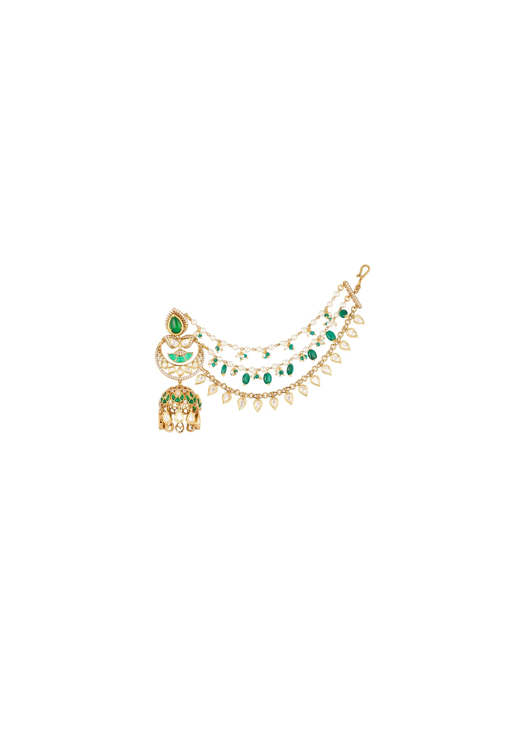 A traditional pair of gold finish jhumka earrings featuring intricate kundan detailing and beaded sahare accented with green simulated stones and delicate pearls. The elegant design adds a festive and... More Product Details
