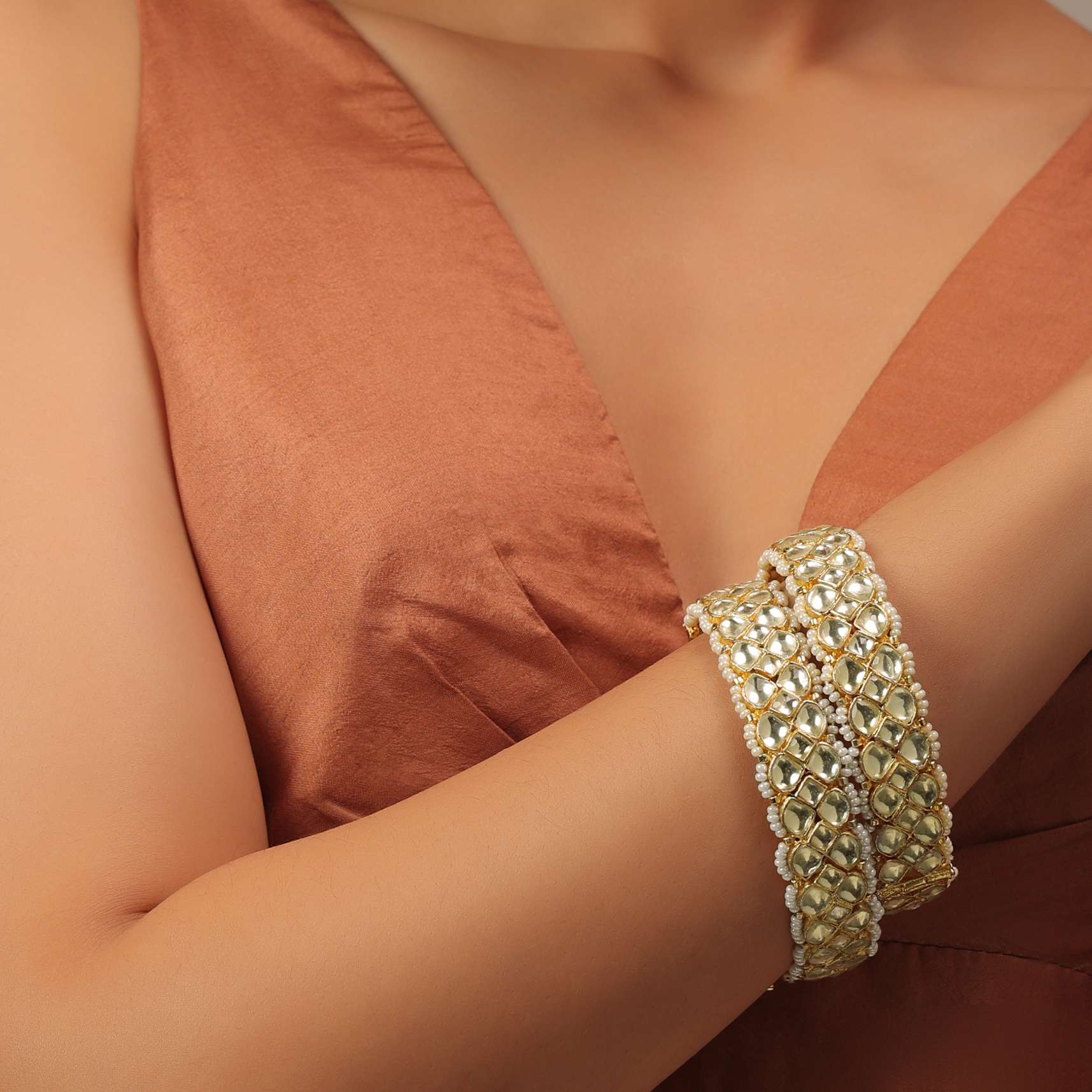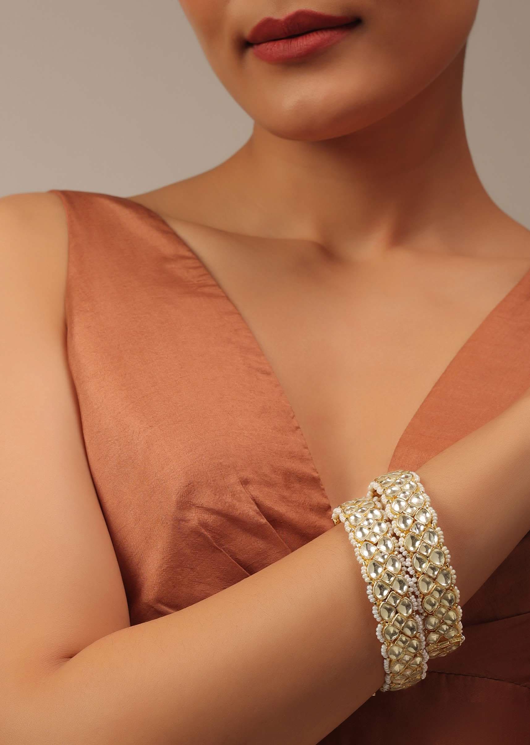 This exquisite pair of gold finish kundan polki bangles are crafted with precision and feature a mesmerizing pattern, making it the perfect accessory for any festive occasion. The unique design and the addition of pearls to these bangles are sure to make a statement and add a touch of elegance to any ensemble. Whether you're attending a wedding, a religious ceremony, or a special event, these bangles will be sure to make you stand out from the crowd.The jewelry set is polished and anti-tarnish.Avoid contact with water, chemicals, harsh liquids, perfumes, etc.Do not wear this piece of jewelry while showering, gymming, swimming, etc.Hard contact must be avoided completely.Please keep the product away from moisture and humidity when not in use.Baroque pearls and Natural stones can range from minor aberrations to distinctly ovoid, curved, pinched, or lumpy shapes.Slight variations in design may vary. Awarded as the Most Trusted Brand, we're delivering styles you love, just as promised.