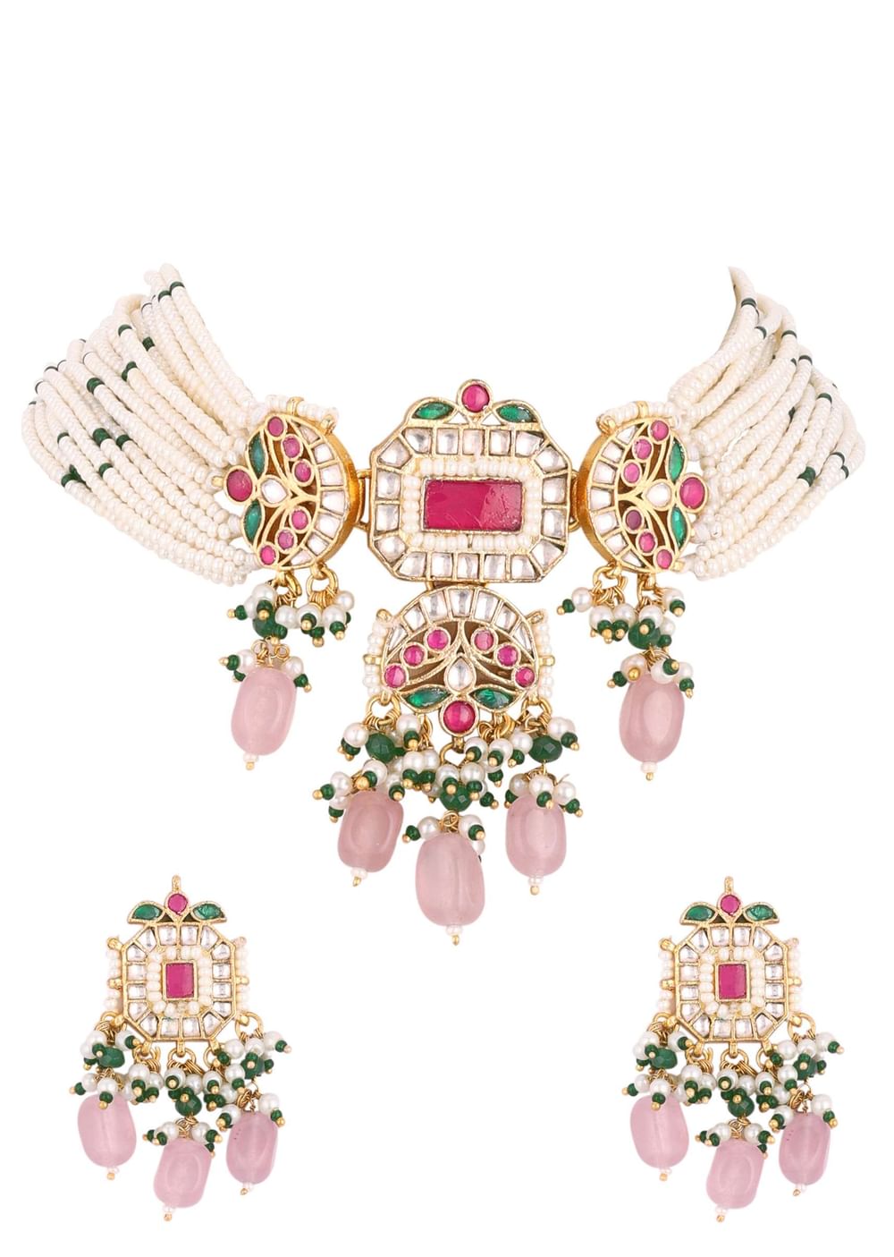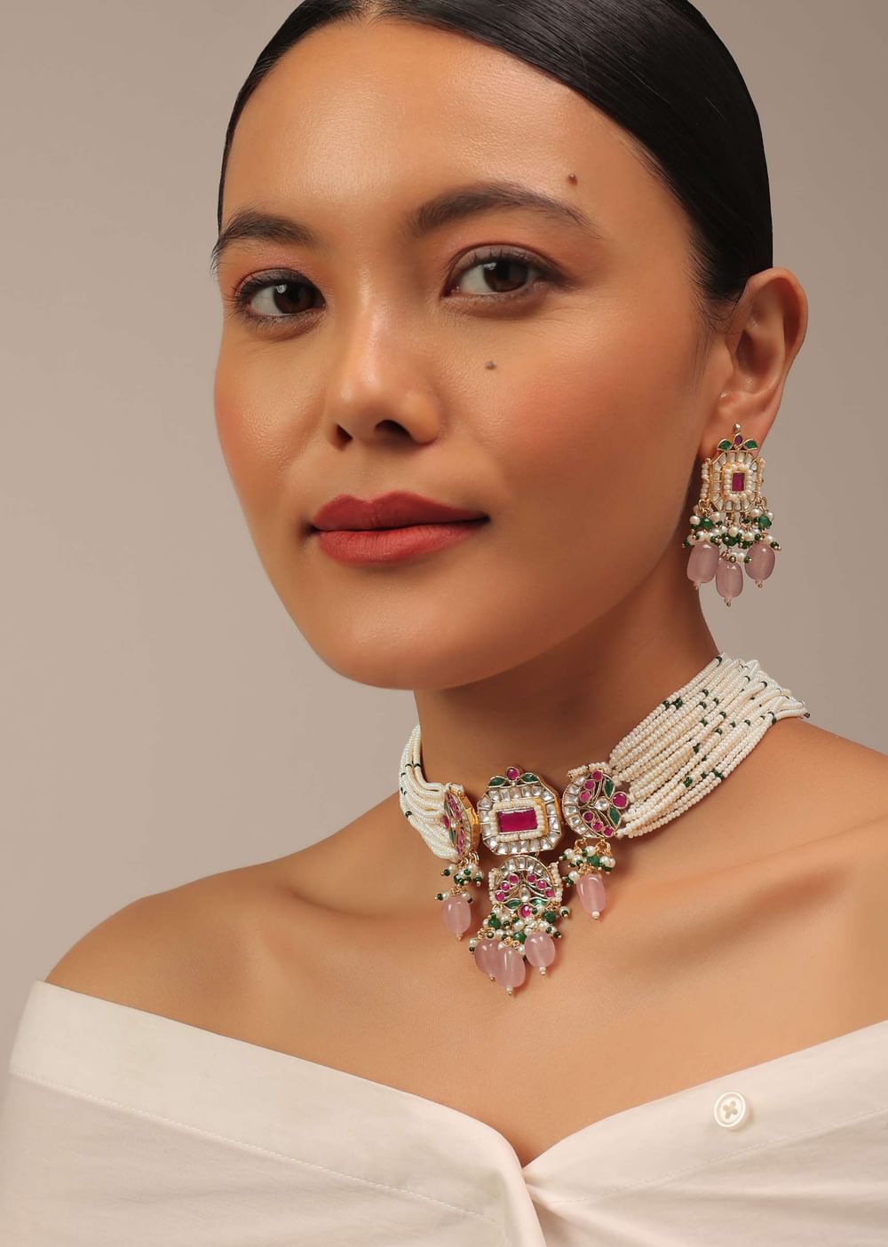 This stunning gold finish kundan polki choker set is the perfect accessory for any wedding. The intricate design of the multicolor choker is sure to make a statement, while the peach drops add a subtle hint of rosiness. The set includes matching earrings, creating a complete and sophisticated look. The jewelry set is polished and anti-tarnish.Avoid contact with water, chemicals, harsh liquids, perfumes, etc.Do not wear this piece of jewelry while showering, gymming, swimming, etc.Hard contact must be avoided completely.Please keep the product away from moisture and humidity when not in use.Baroque pearls and Natural stones can range from minor aberrations to distinctly ovoid, curved, pinched, or lumpy shapes.Slight variations in design may vary. Awarded as the Most Trusted Brand, we're delivering styles you love, just as promised.