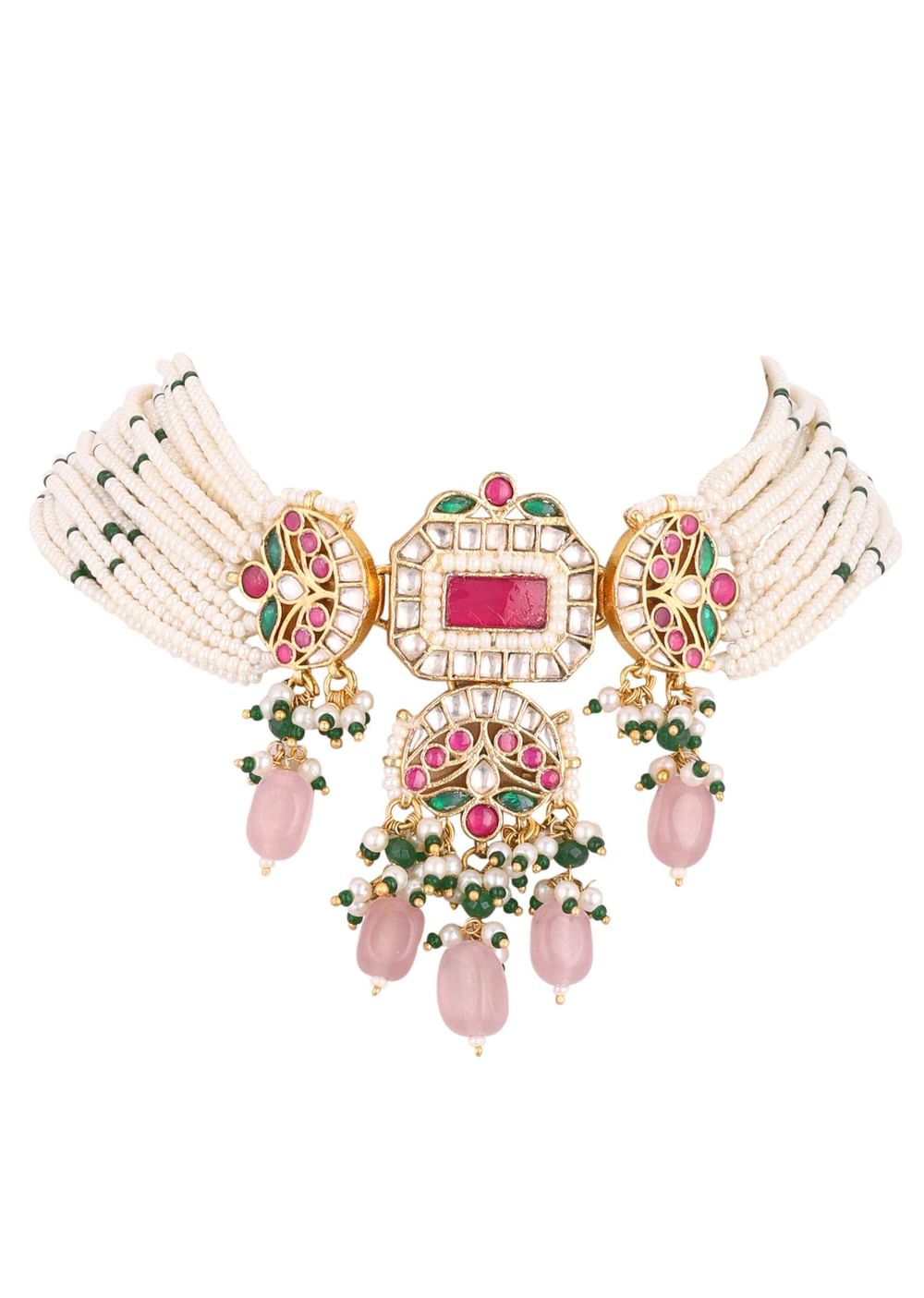 Gold Finish Kundan Polki Choker Set With Peach Drops