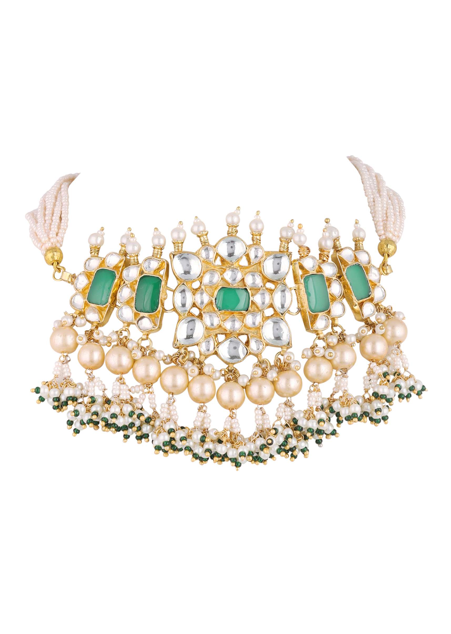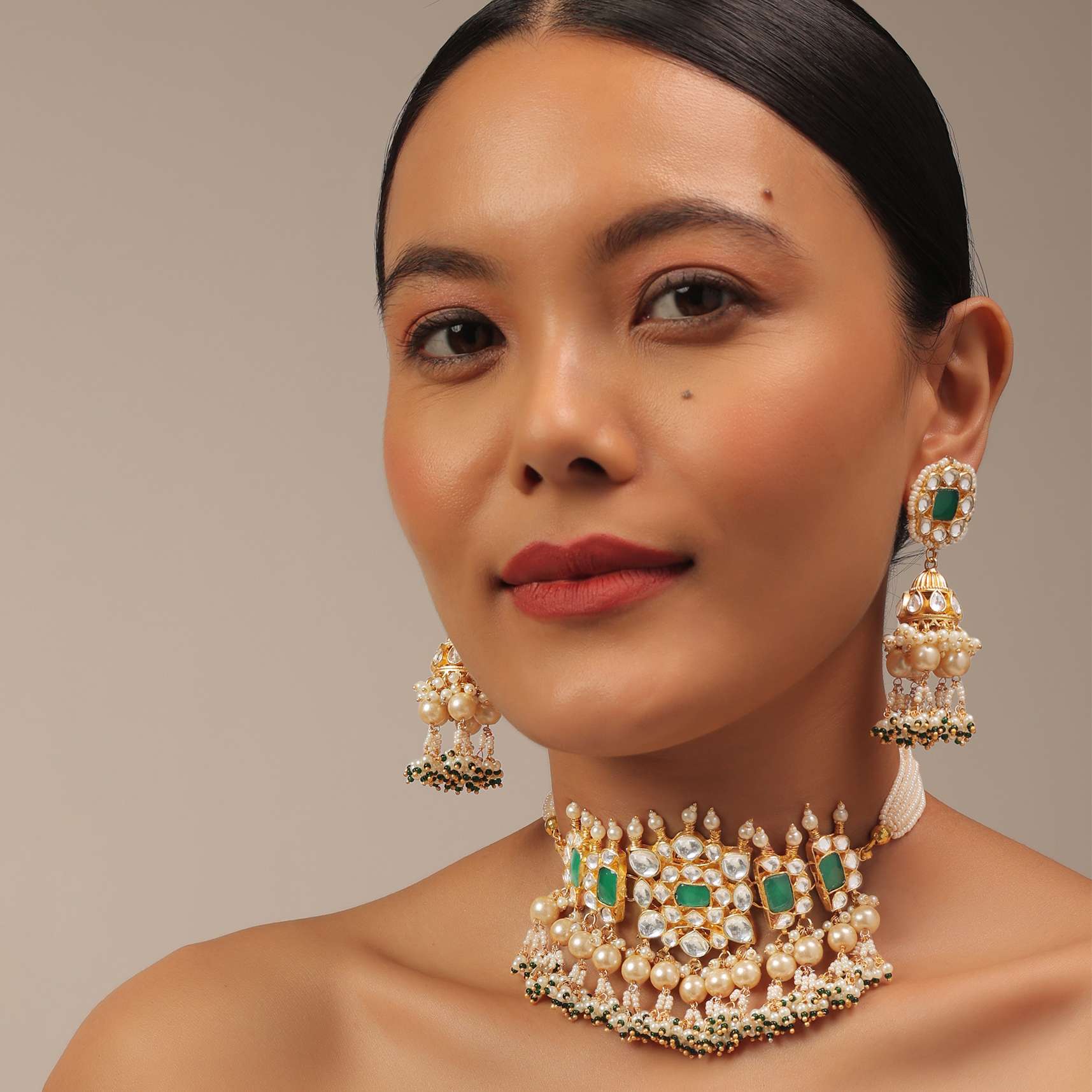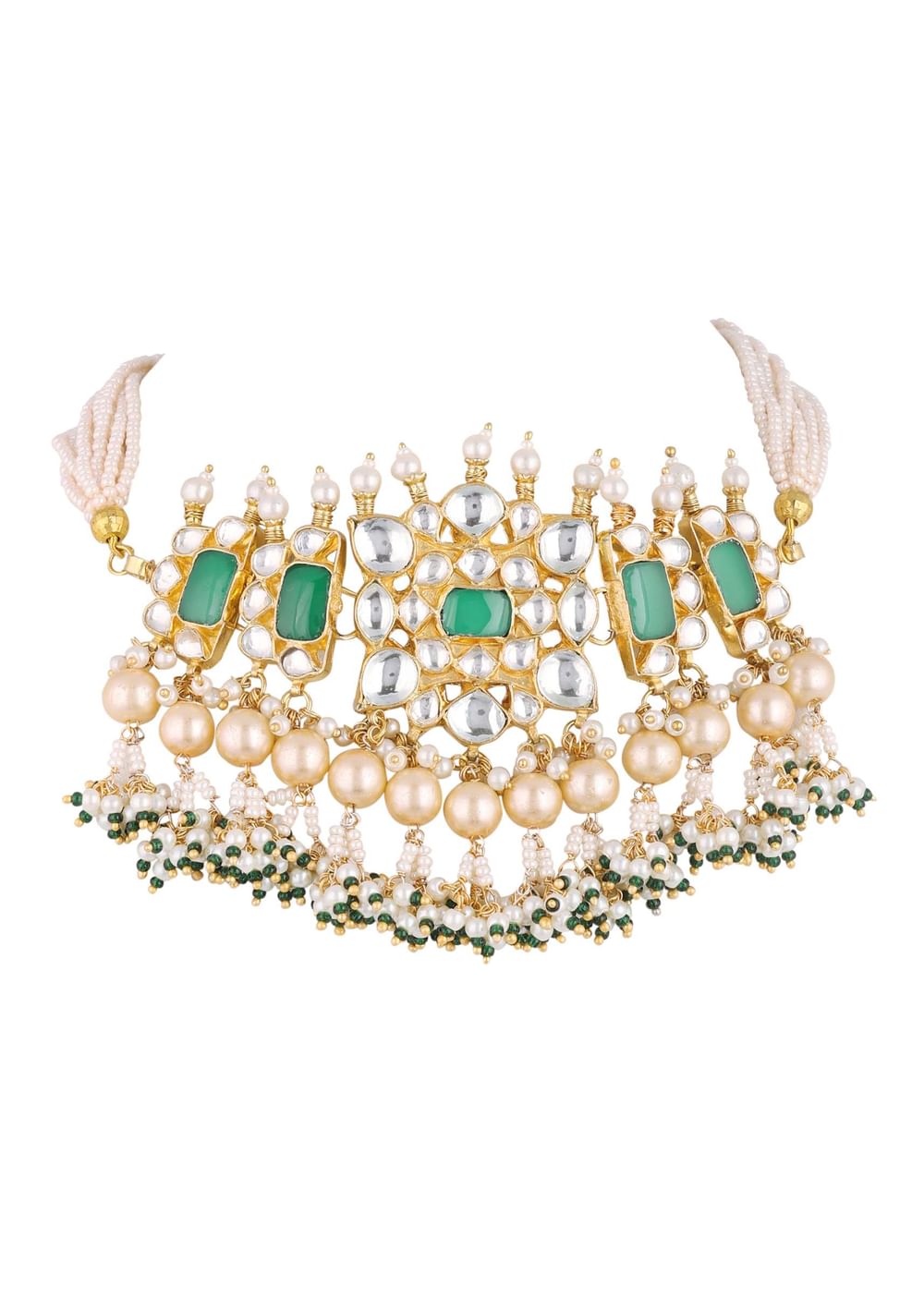 This stunning gold finish kundan polki choker set with pearls is the perfect accessory for any wedding. This set is sure to turn heads with its unique design and tiny bottle green and white beads.The set also includes a pair of matching earrings, making it the perfect setting for any special occasion. The jewelry set is polished and anti-tarnish.Avoid contact with water, chemicals, harsh liquids, perfumes, etc.Do not wear this piece of jewelry while showering, gymming, swimming, etc.Hard contact must be avoided completely.Please keep the product away from moisture and humidity when not in use.Baroque pearls and Natural stones can range from minor aberrations to distinctly ovoid, curved, pinched, or lumpy shapes.Slight variations in design may vary. Awarded as the Most Trusted Brand, we're delivering styles you love, just as promised.