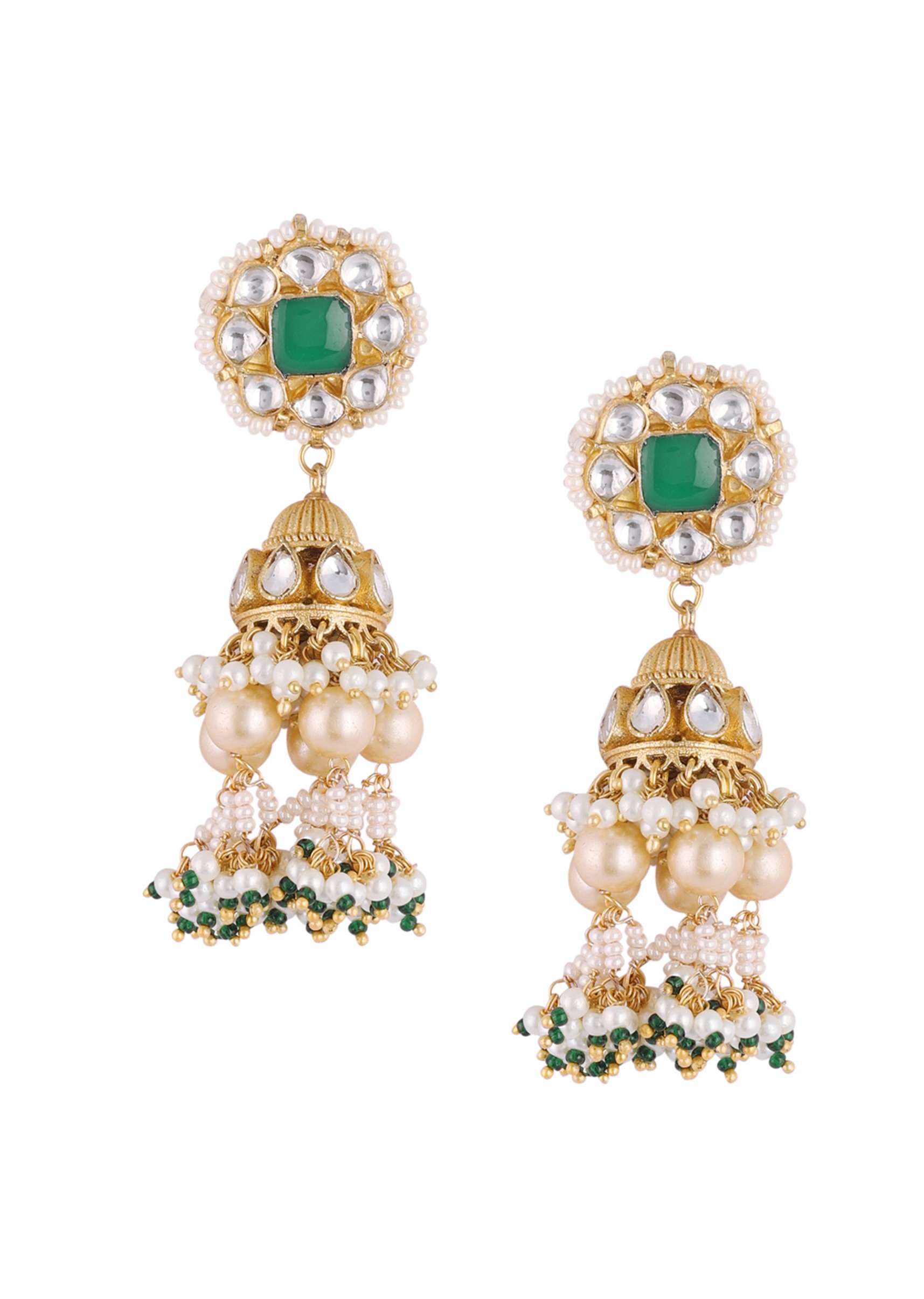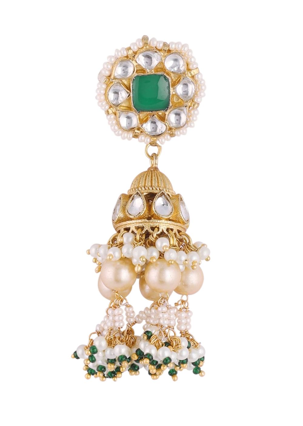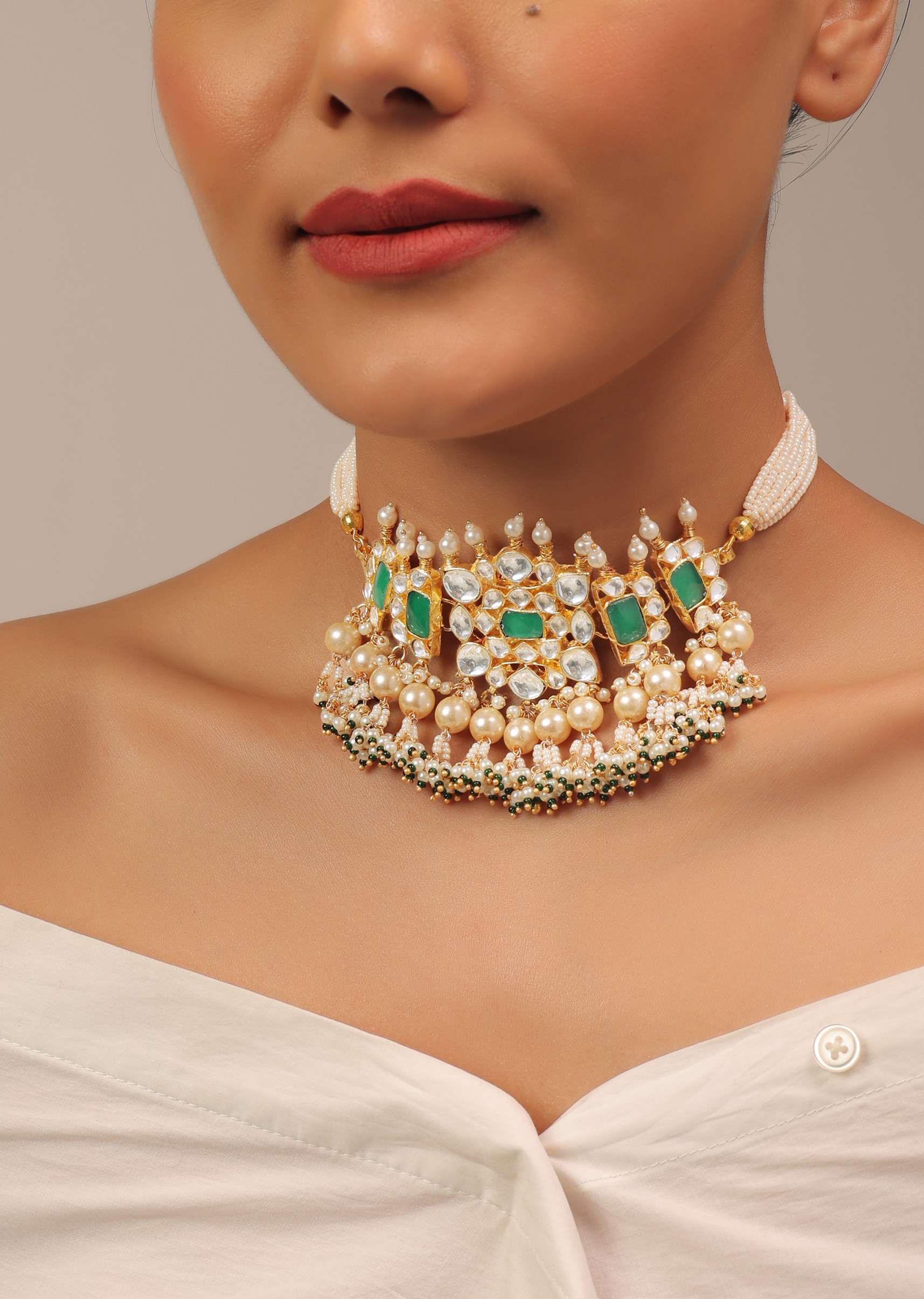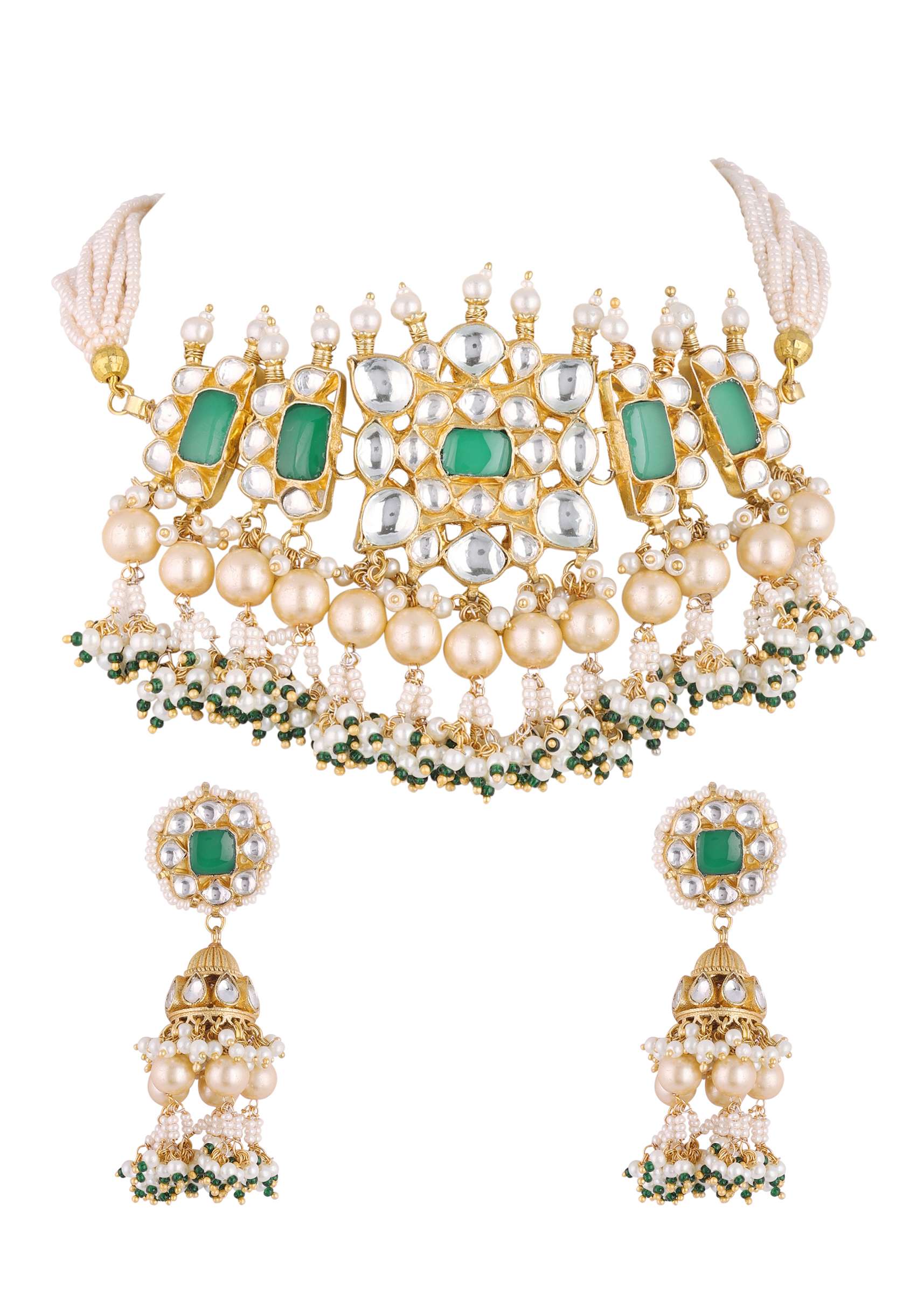 This stunning gold finish kundan polki choker set with pearls is the perfect accessory for any wedding. This set is sure to turn heads with its unique design and tiny bottle green and white beads.The set also includes a pair of matching earrings, making it the perfect setting for any special occasion. The jewelry set is polished and anti-tarnish.Avoid contact with water, chemicals, harsh liquids, perfumes, etc.Do not wear this piece of jewelry while showering, gymming, swimming, etc.Hard contact must be avoided completely.Please keep the product away from moisture and humidity when not in use.Baroque pearls and Natural stones can range from minor aberrations to distinctly ovoid, curved, pinched, or lumpy shapes.Slight variations in design may vary. Awarded as the Most Trusted Brand, we're delivering styles you love, just as promised.