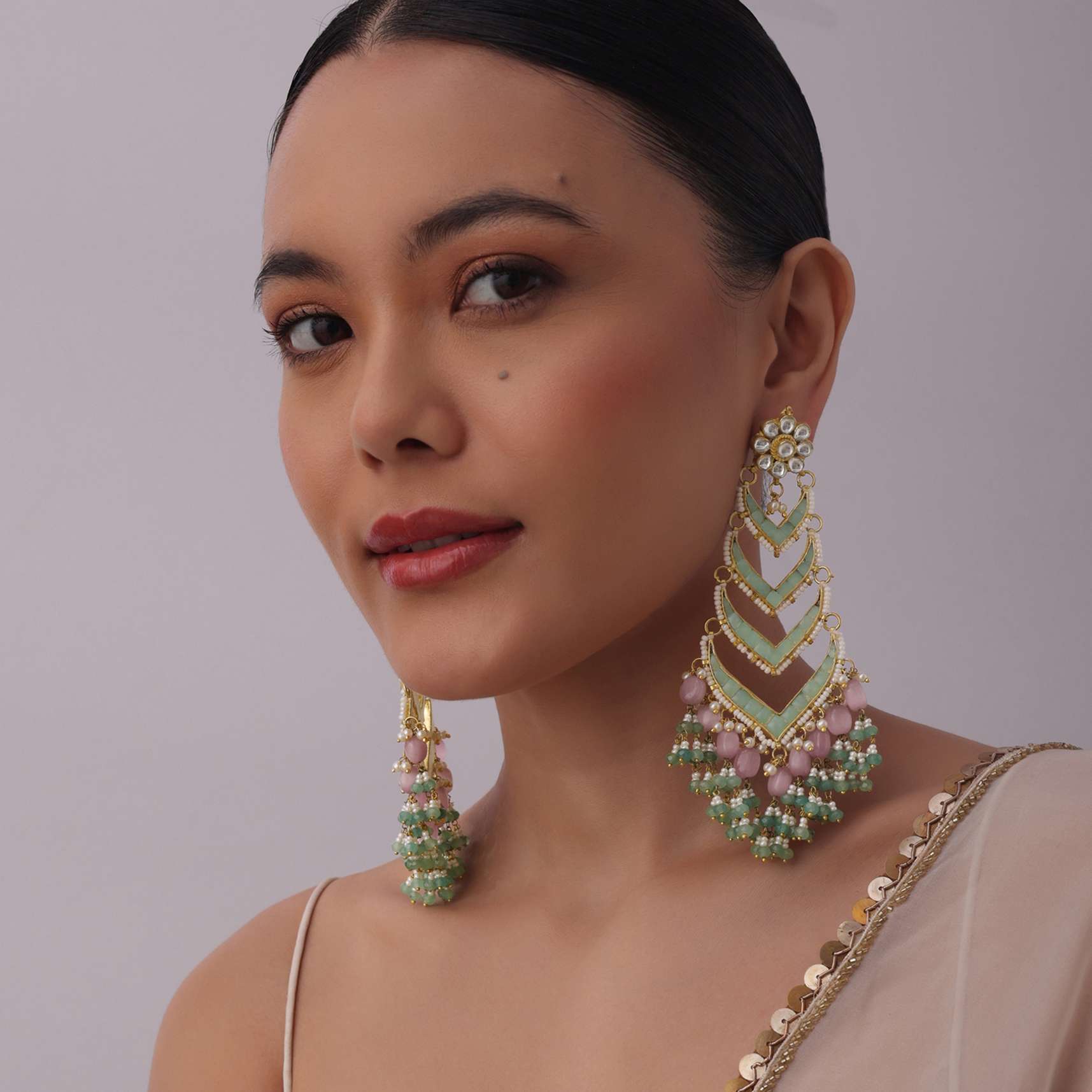 Indulge in the epitome of luxury with our captivating kundan chandbalis in mix metal. These chandbalis are adorned with delicate pink beads and intricate mint green meenakari work. Each piece is a celebration of artistry and elegance.EVENT - Designed for brides and bridesmaids alike this pair is perfect for weddings and receptions.Store in a dust bag. Keep away from moisture perfume alcohol and harsh chemicals. Spot clean only. Keep away from sharp objects. Actual color may slightly vary due to photographic lighting sources and device screen settings. Awarded as the Most Trusted Brand, we're delivering styles you love, just as promised.
