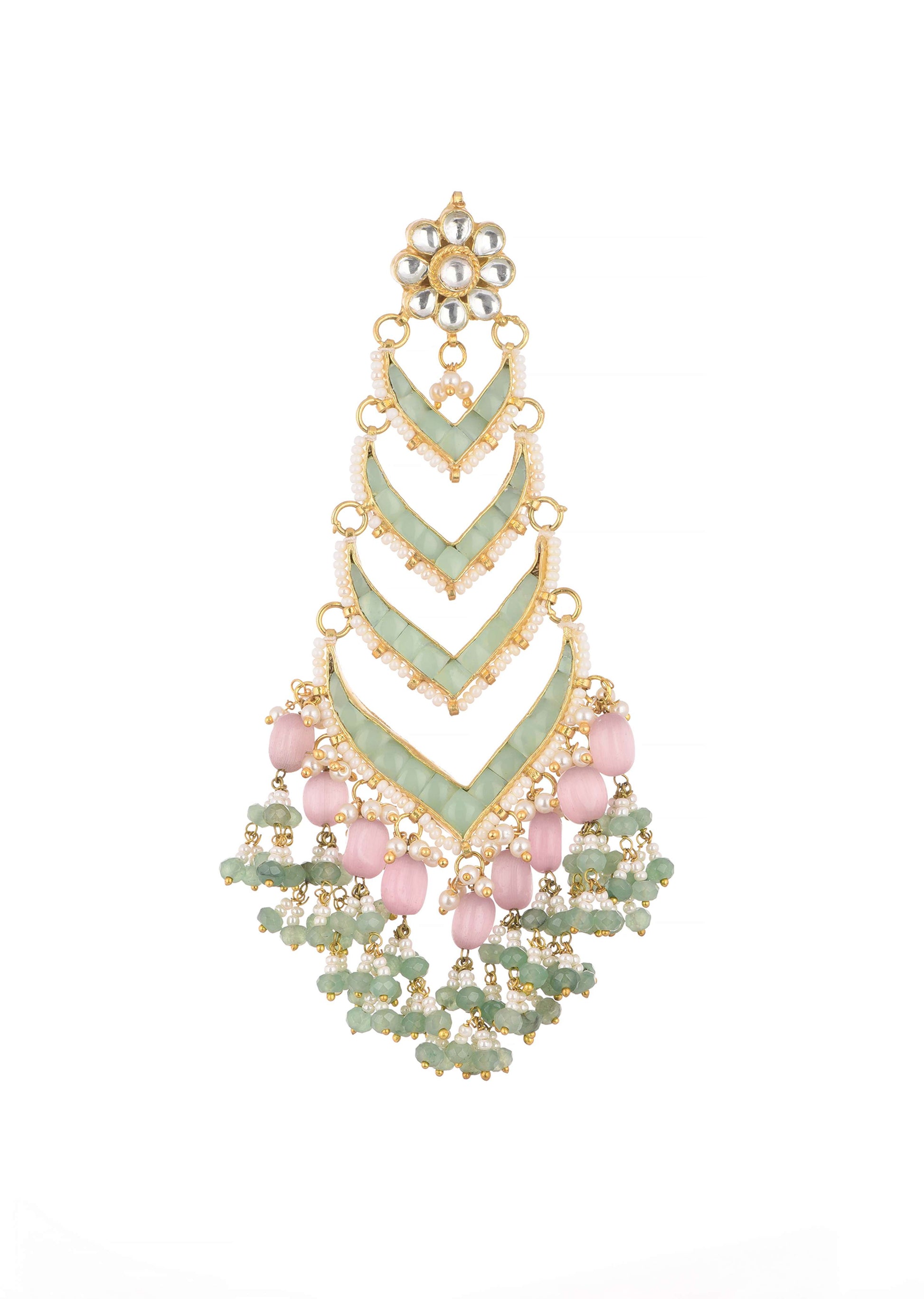 Indulge in the epitome of luxury with our captivating kundan chandbalis in mix metal. These chandbalis are adorned with delicate pink beads and intricate mint green meenakari work. Each piece... More Product Details