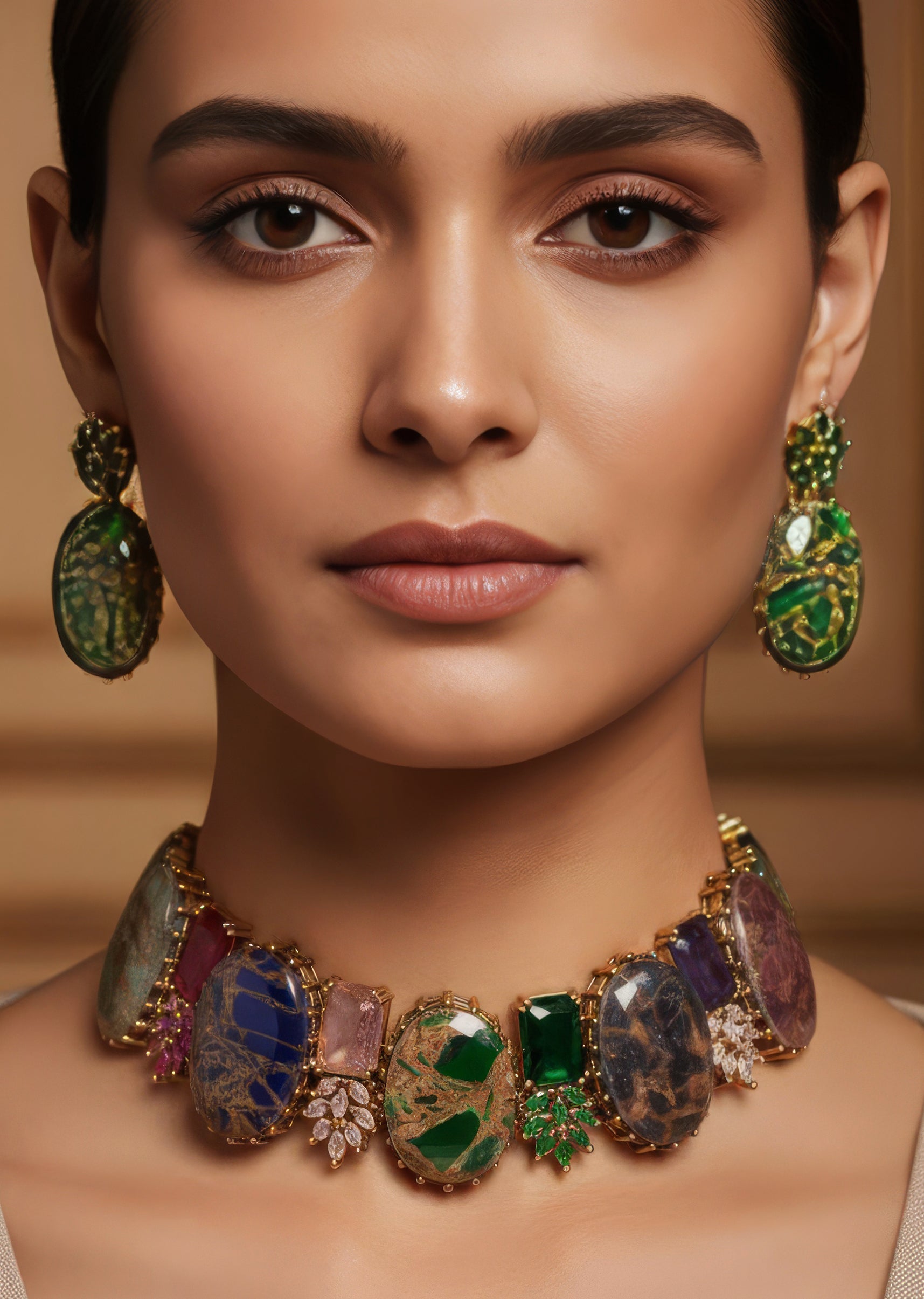 A vibrant festive choker crafted to elevate sangeet and mehendi looks as a wedding guest. The design features large oval cabochon stones in mixed colors and marbled patterns creating a bold eye catching appeal. The multi stone arrangement adds depth and richness while maintaining a traditional yet contemporary charm. This statement necklace is perfect for pairing with elegant lehengas or festive gowns for a standout look.