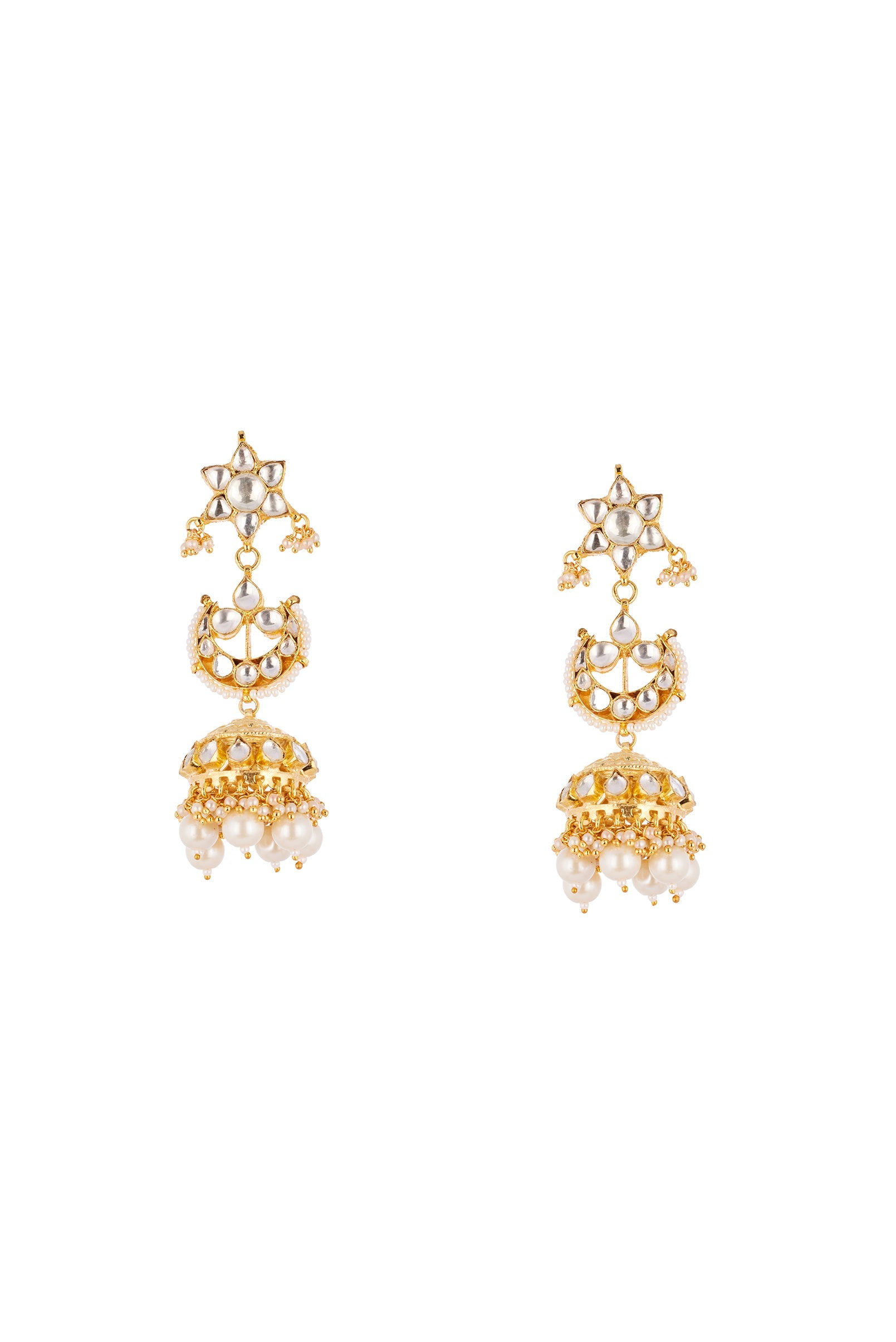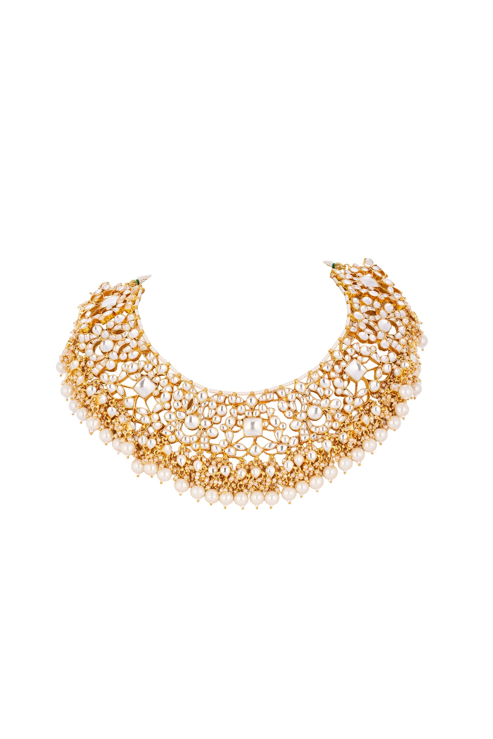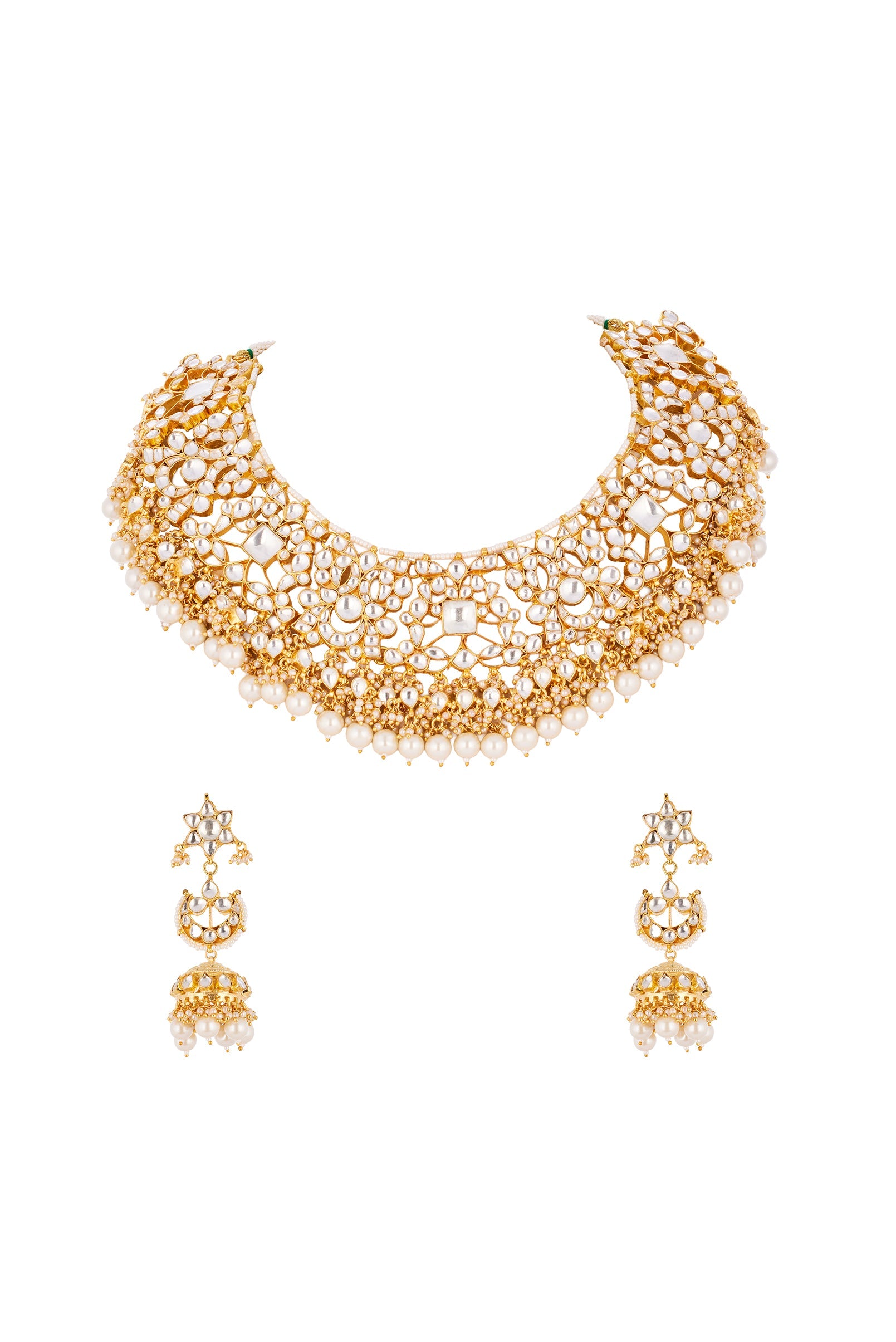 This gold off white necklace set is crafted using traditional Kundan Polki in classic Jadau technique, finished with soft pearl drops for a regal bridal appeal. Handcrafted with intricate detailing, this statement piece is perfect for weddings and grand bridal occasions, adding timeless elegance to the overall look.