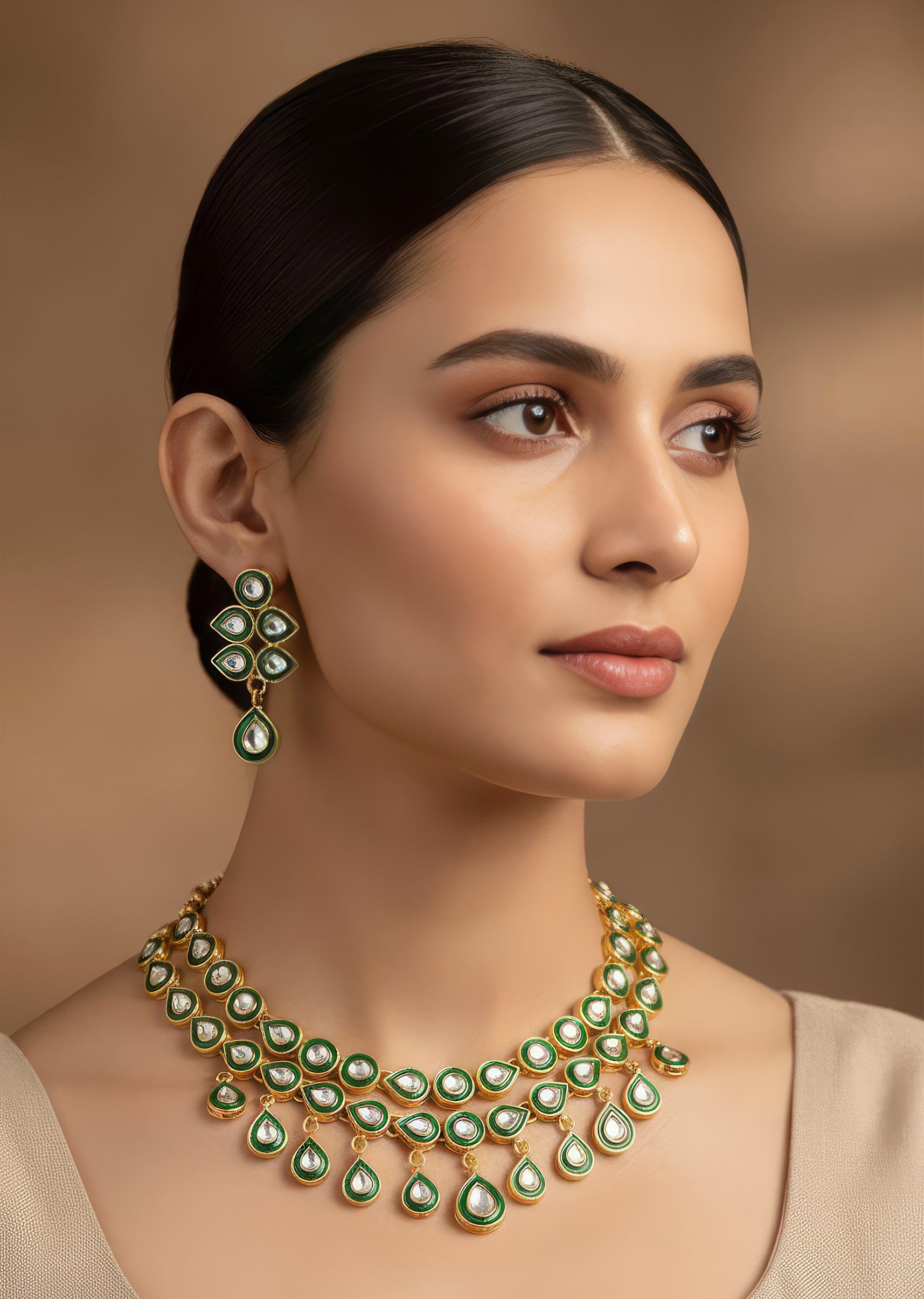 A vibrant celebration of heritage craftsmanship, this gold finish necklace set showcases uncut Kundan Polki meticulously set in the traditional Kundan Jadau technique. Accented with rich green tones and intricate meenakari work, the piece reflects timeless Indian artistry. Handcrafted by skilled artisans, the combination of radiant Polki, classic gold, and enamel detailing creates a regal statement ideal for festive and wedding ensembles. Coordinating earrings complete the set with elegance.