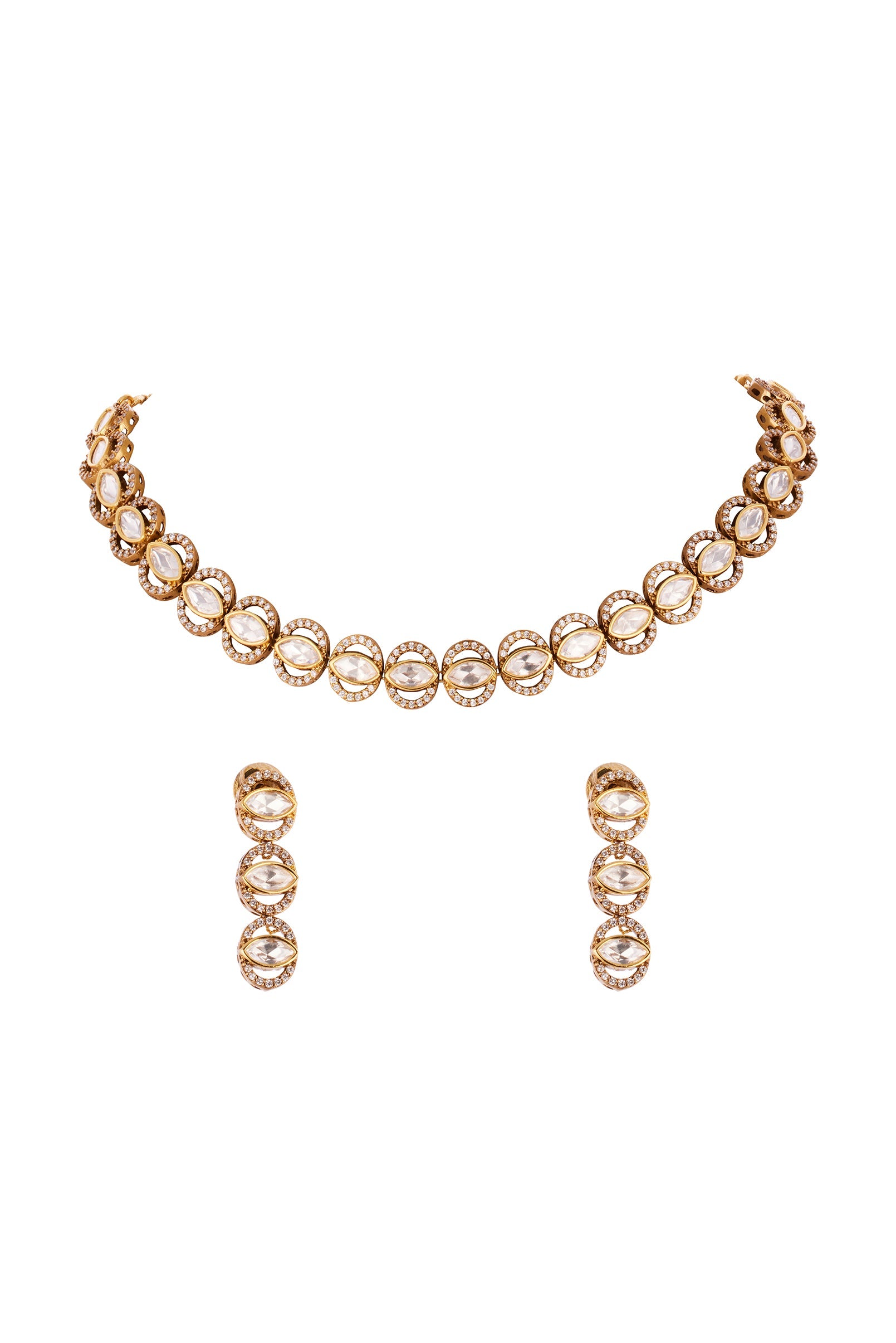 A timeless gold and white necklace set crafted with Polki uncut diamonds using the traditional Kundan Jadau technique. Handcrafted with artisanal precision, this elegant piece brings a classic radiance to... More Product Details