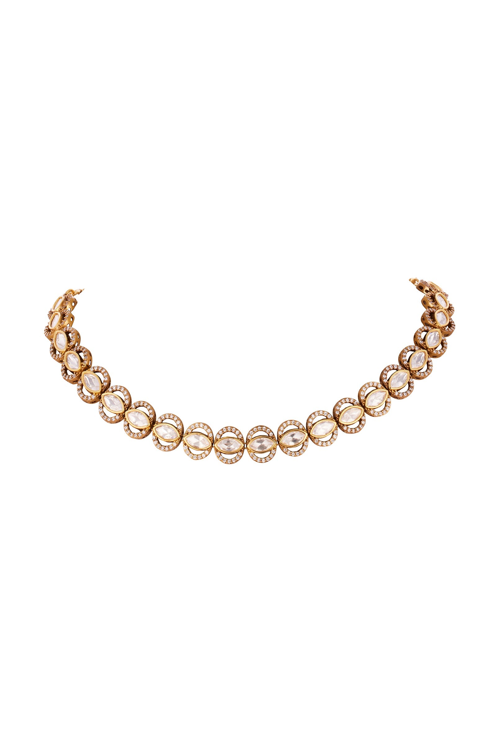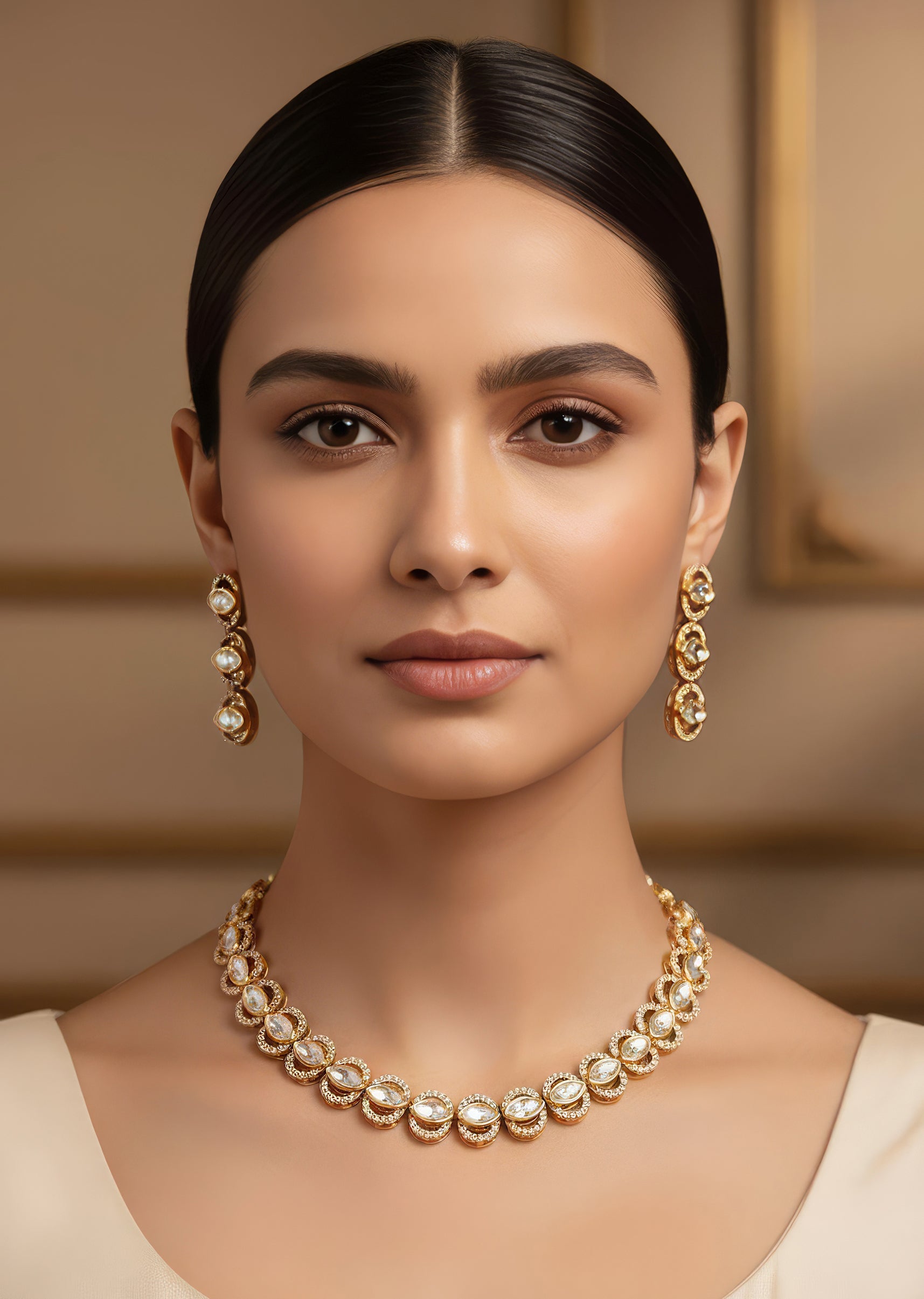 A timeless gold and white necklace set crafted with Polki uncut diamonds using the traditional Kundan Jadau technique. Handcrafted with artisanal precision, this elegant piece brings a classic radiance to festive celebrations, adding an effortless touch of heritage charm to your look.