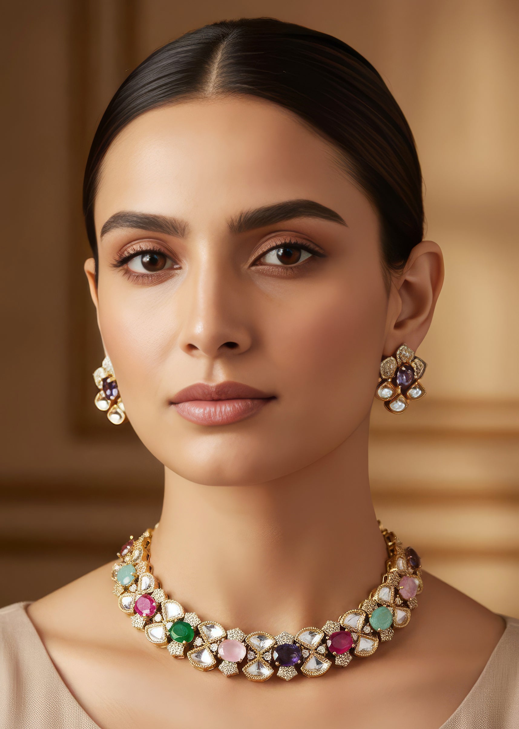 An exquisite blend of regal hues, this gold finish necklace set features uncut Polki set in the traditional Kundan Jadau technique. Handcrafted by skilled artisans, the necklace highlights striking tanzanite accents that bring a refined purple glow to the design. The harmony of warm gold tones, radiant Polki, and rich tanzanite creates a luxurious statement that beautifully complements festive and wedding ensembles. Coordinating earrings complete the set for an elegant, cohesive look.