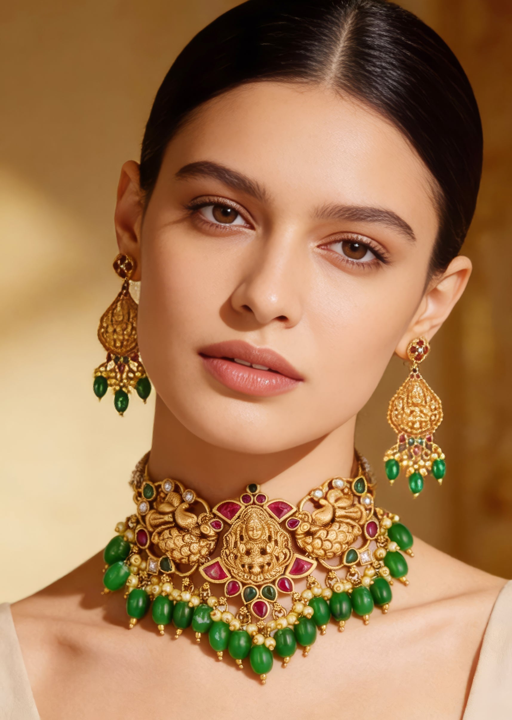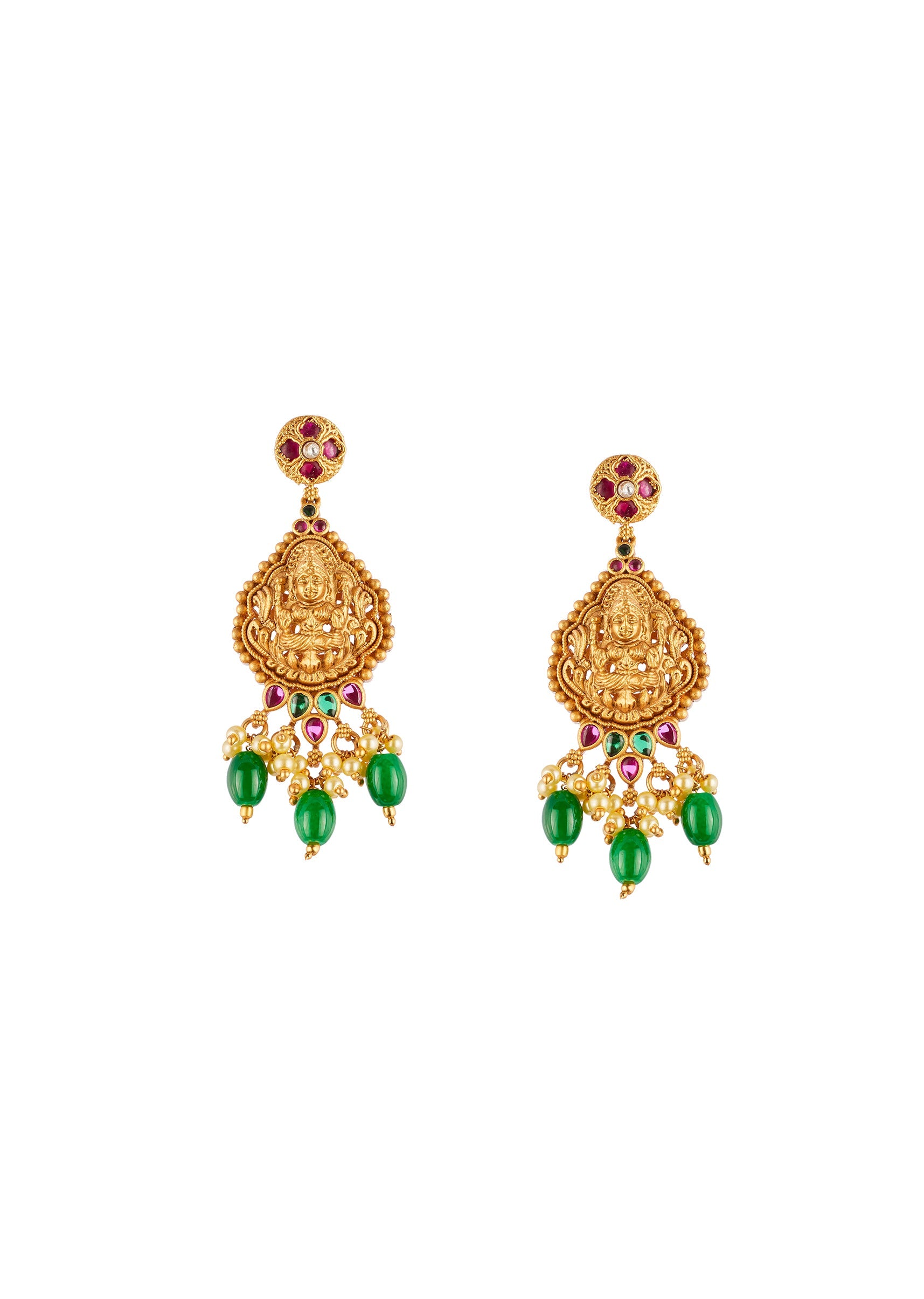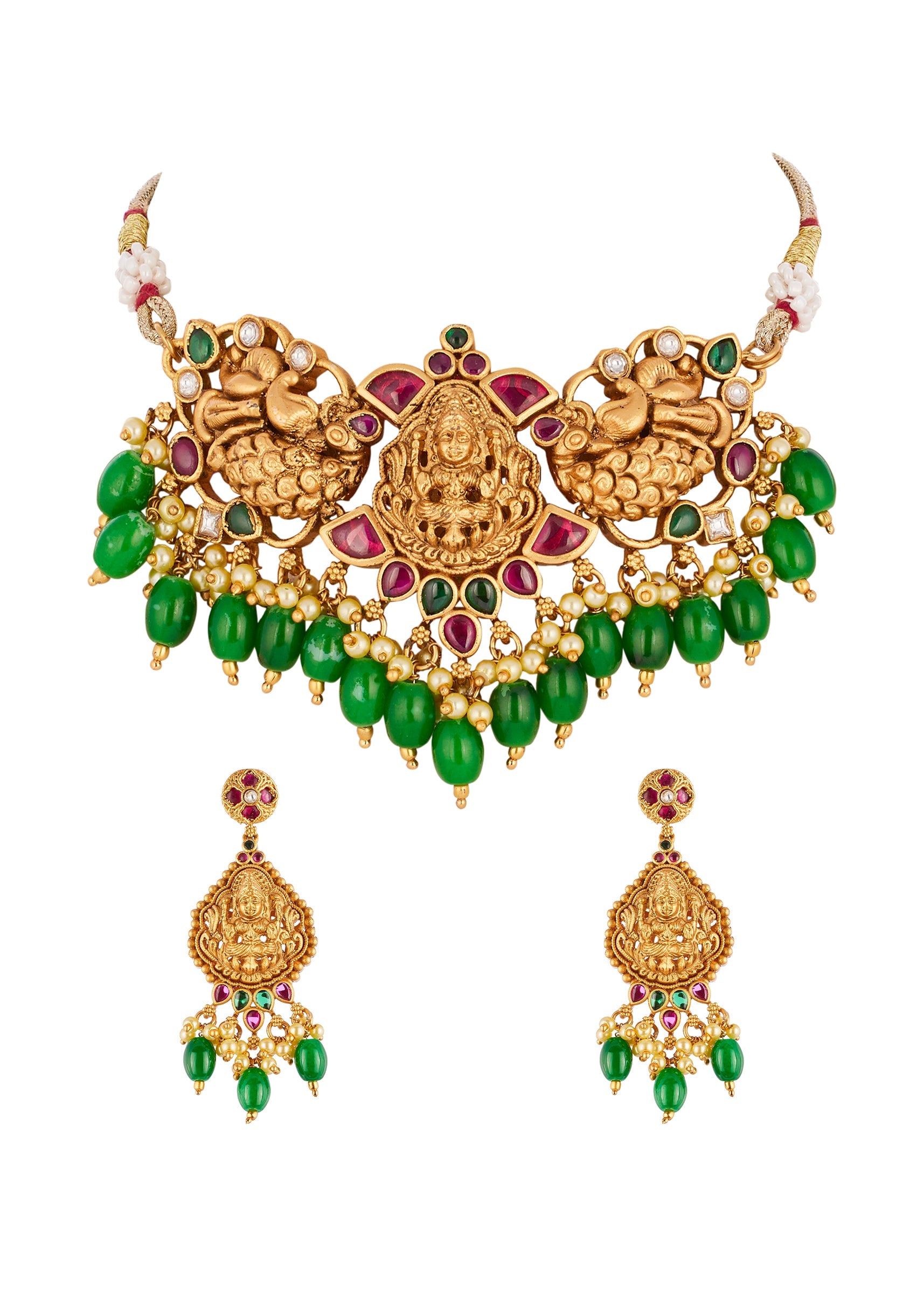 A stunning gold necklace set featuring intricately crafted temple motifs accented with pink and green simulated stones. The detailed craftsmanship and vibrant stones add a festive and elegant charm, making... More Product Details