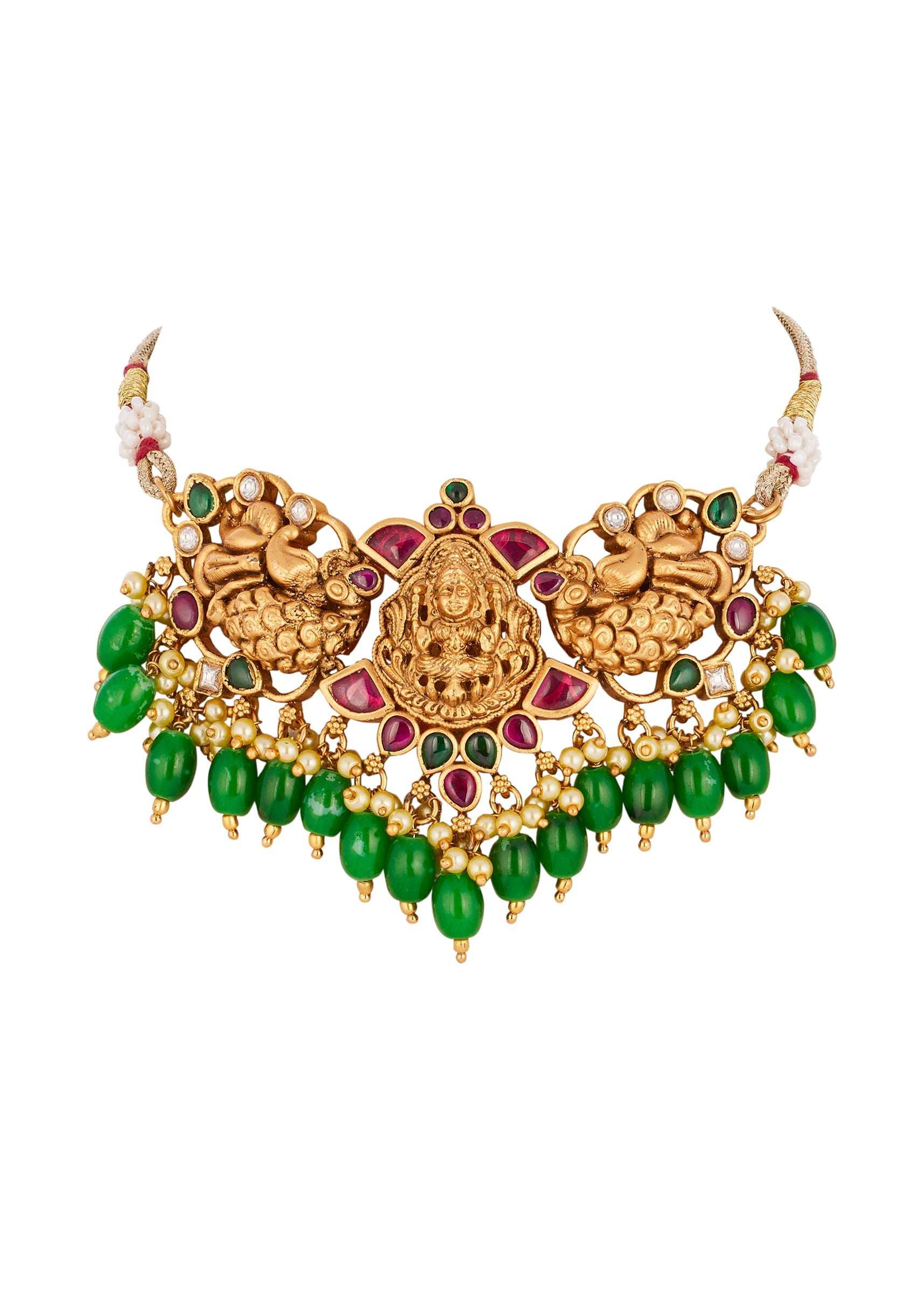 A stunning gold necklace set featuring intricately crafted temple motifs accented with pink and green simulated stones. The detailed craftsmanship and vibrant stones add a festive and elegant charm, making it perfect for weddings and celebratory occasions. Awarded as the Most Trusted Brand, we're delivering styles you love, just as promised.