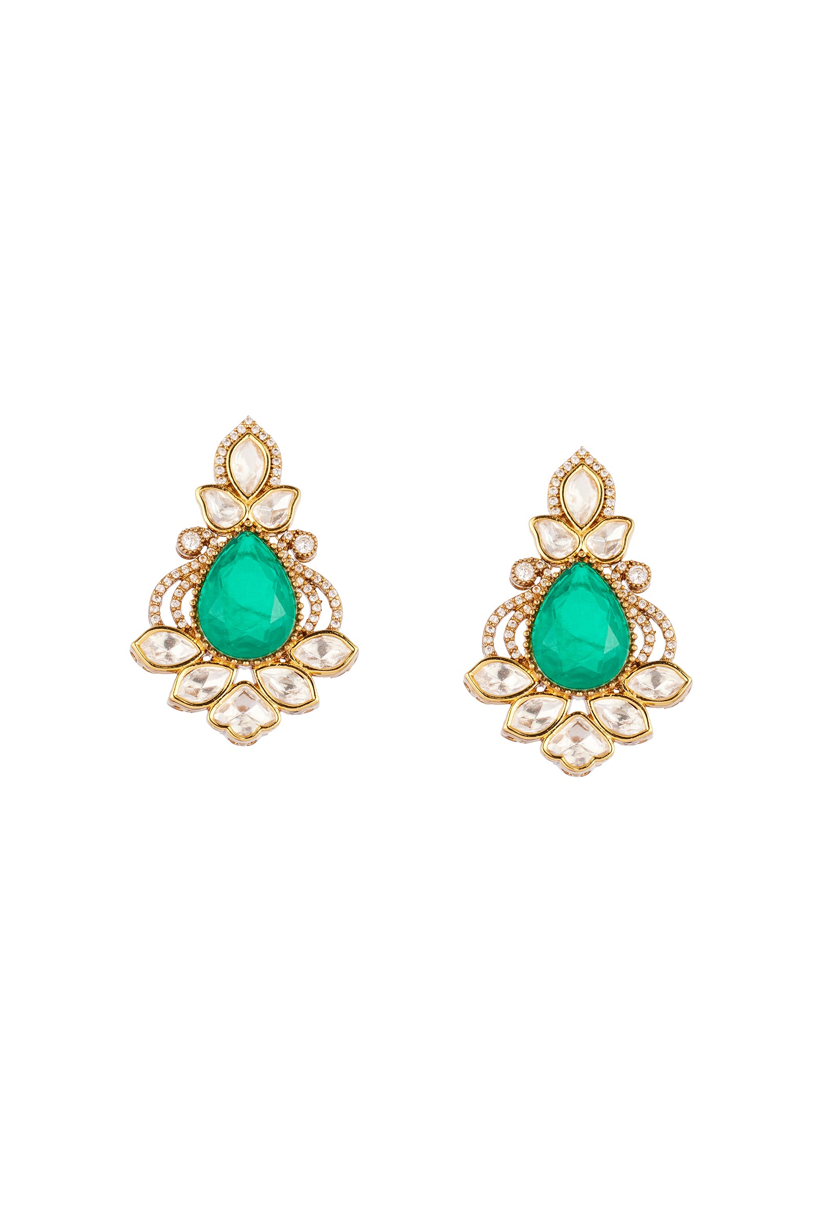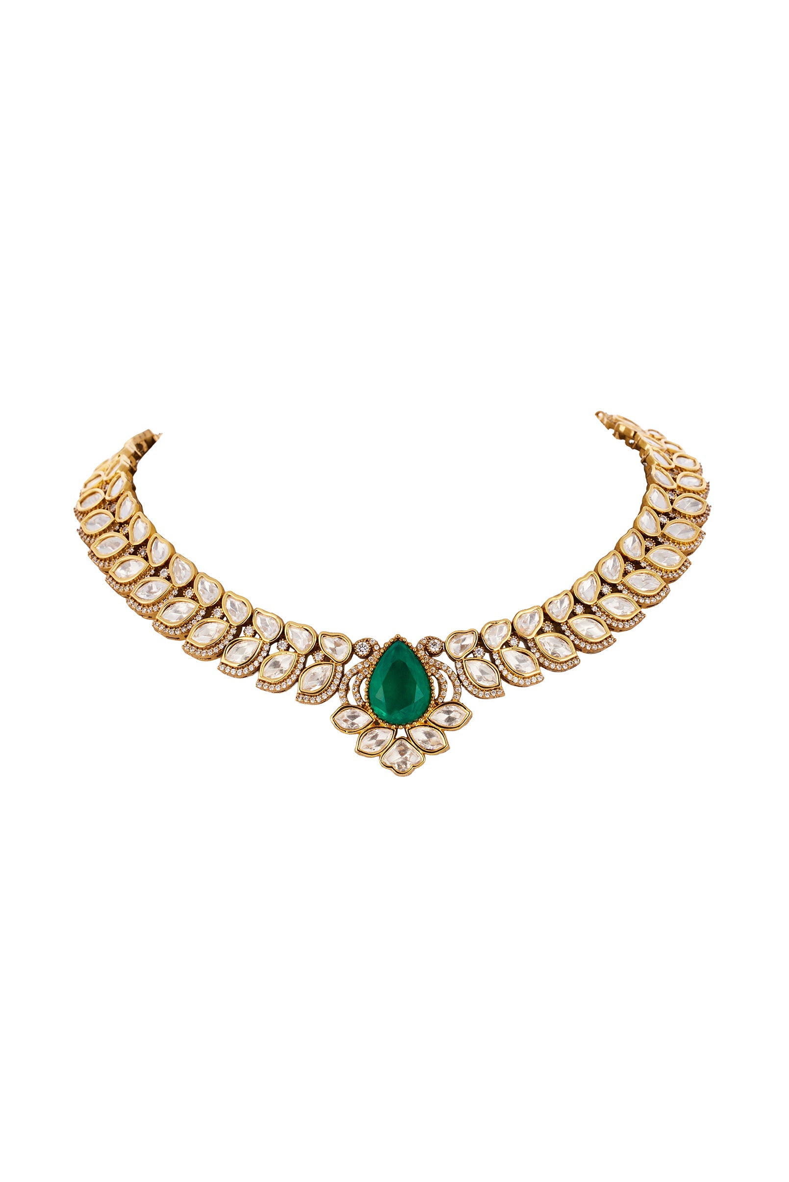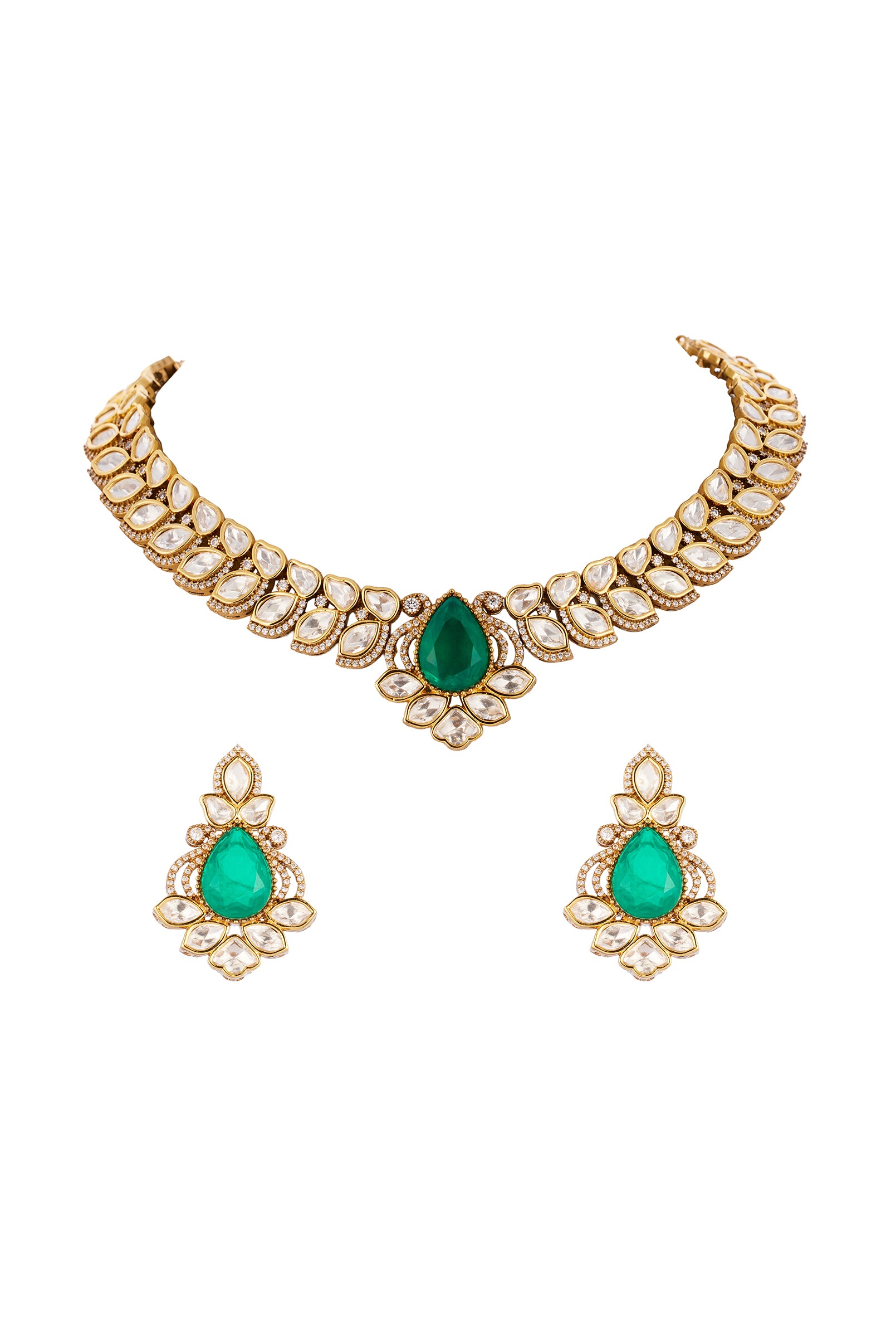 Designed in true Kalki jewelry style this green gold jewelry set is a statement piece for festive haldi mehendi and wedding celebrations as a stylish guest. The set showcases the use of Polki uncut diamonds set in the traditional Kundan Jadau with semi precious emerald accents adding a rich contrast of sparkle and regal green. Handcrafted to reflect heritage Indian artistry it brings together intricate detailing and a luxurious finish ensuring you look radiant and occasion ready. Awarded as the Most Trusted Brand, we're delivering styles you love, just as promised.