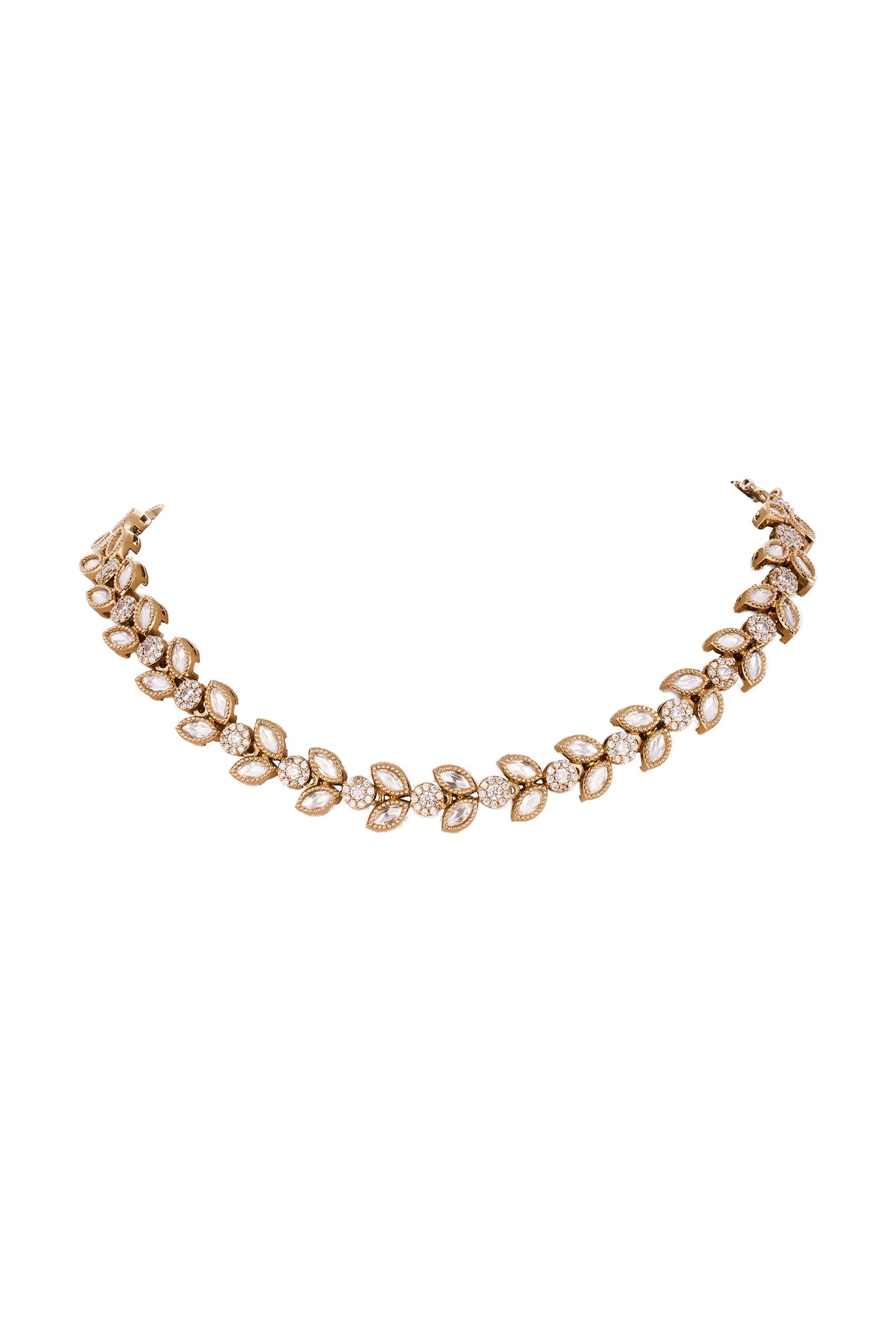 A timeless gold and white necklace set adorned with Polki crafted using the traditional Kundan Jadau technique. Handcrafted by skilled artisans, this piece blends heritage detailing with elegant radiance, making it ideal for festive celebrations, weddings, engagements, and occasions where refined charm is desired.