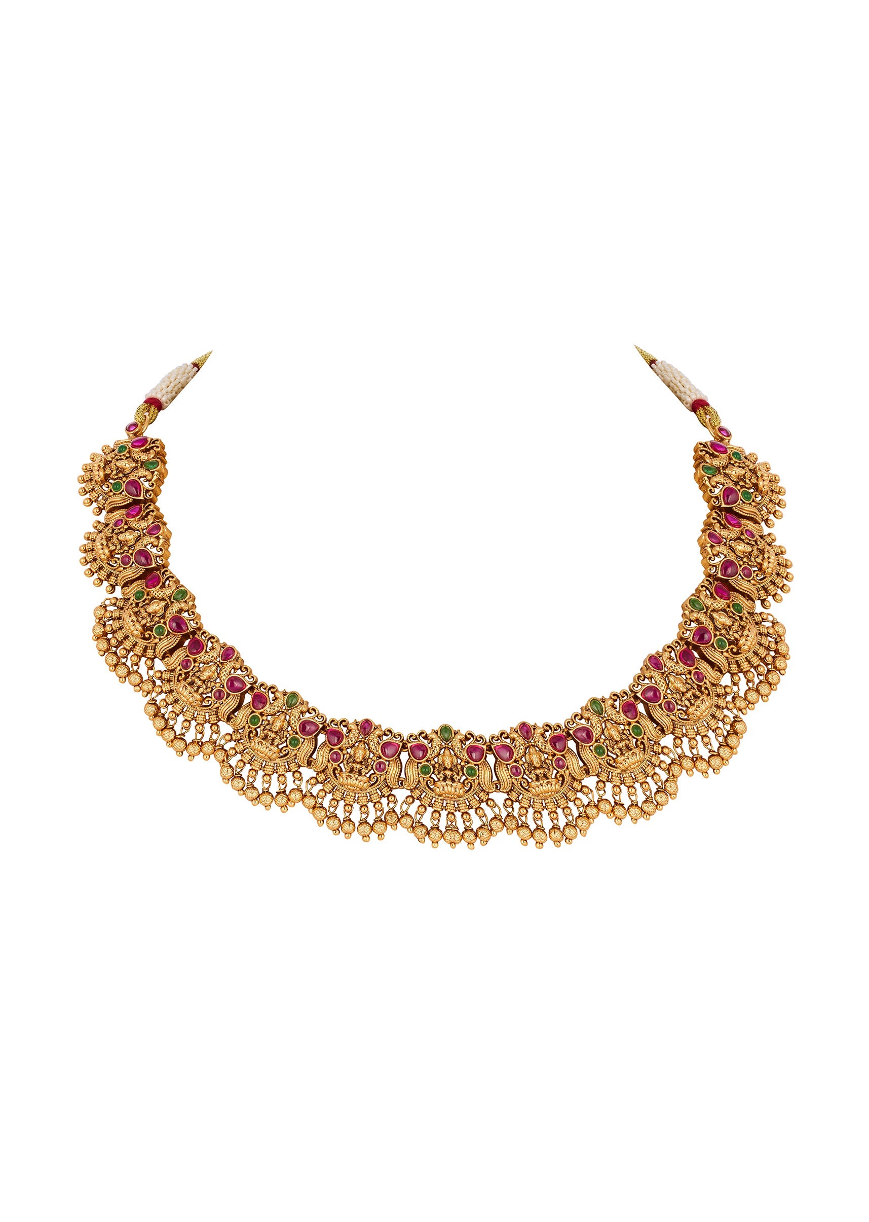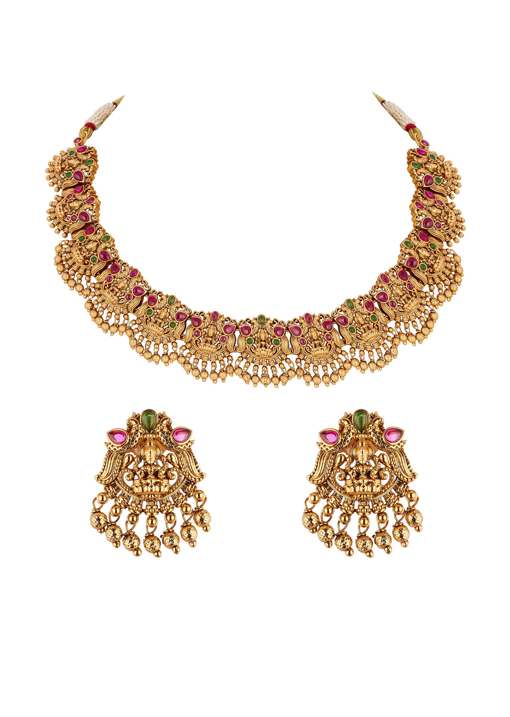 A traditional temple inspired necklace set crafted in a radiant gold finish. The design features intricately detailed motifs highlighted with accents of green and pink simulated stones that add a vibrant yet elegant festive charm. Perfect for weddings and traditional celebrations, this set enhances bridal and family ensembles with timeless ethnic appeal. Awarded as the Most Trusted Brand, we're delivering styles you love, just as promised.