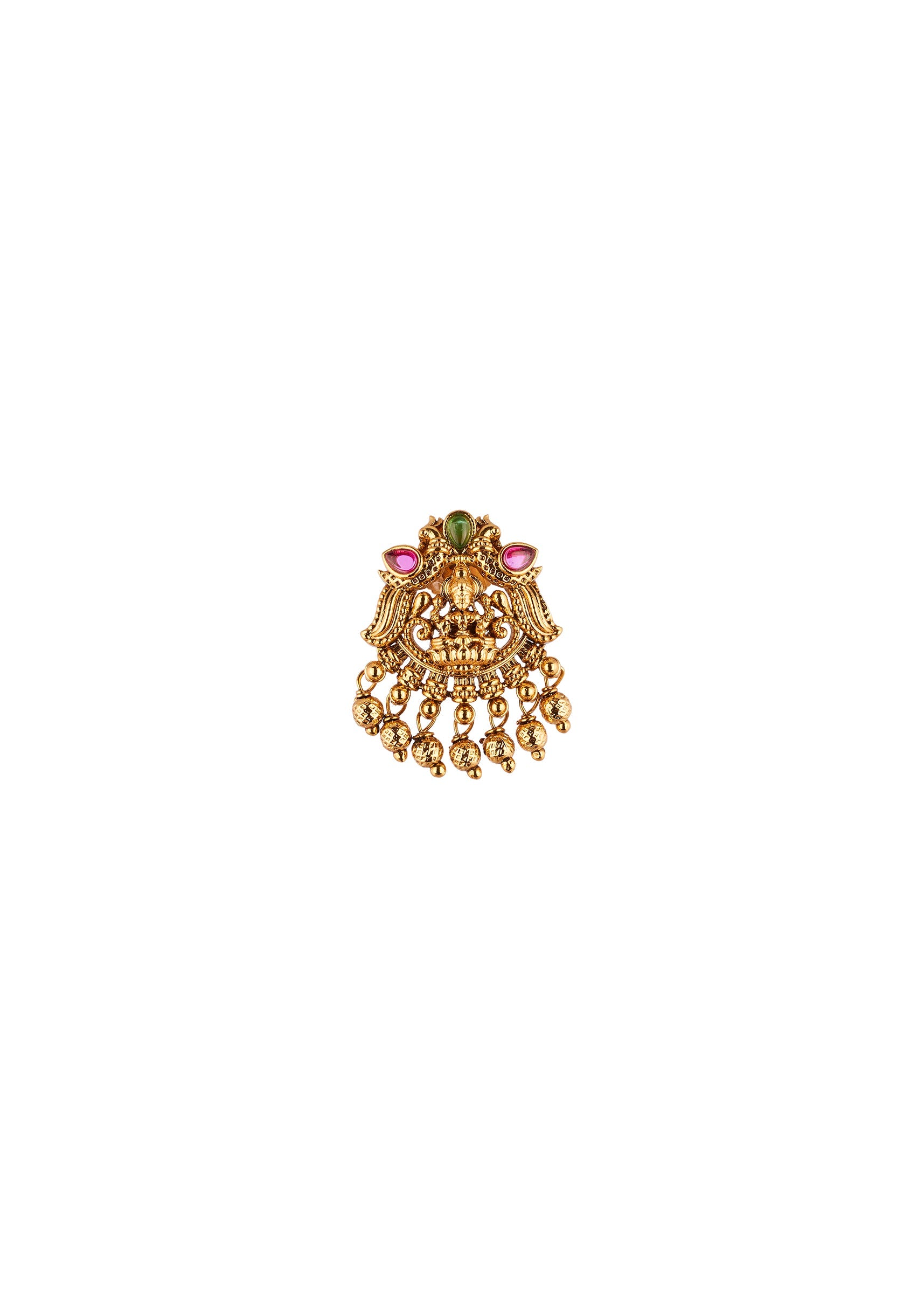 A traditional temple inspired necklace set crafted in a radiant gold finish. The design features intricately detailed motifs highlighted with accents of green and pink simulated stones that add a... More Product Details
