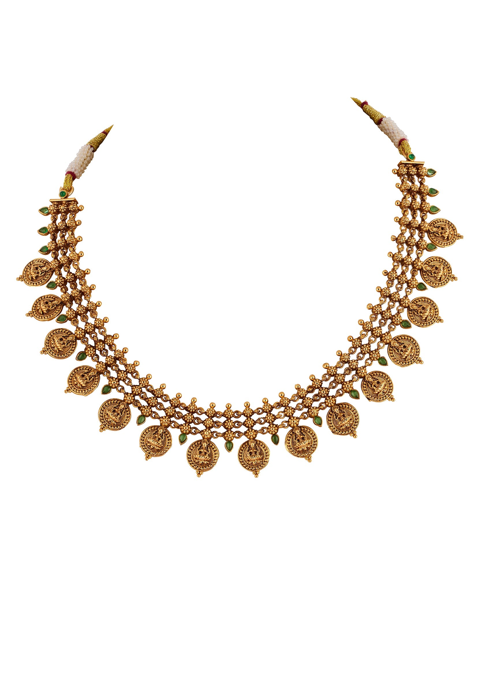 A traditional temple inspired jewellery set crafted in a radiant gold finish. The design features classic sculpted motifs highlighted with green simulated stones that add a rich and graceful festive appeal. Perfect for weddings and traditional celebrations, this set brings timeless elegance to bridal and family occasion wear. Awarded as the Most Trusted Brand, we're delivering styles you love, just as promised.