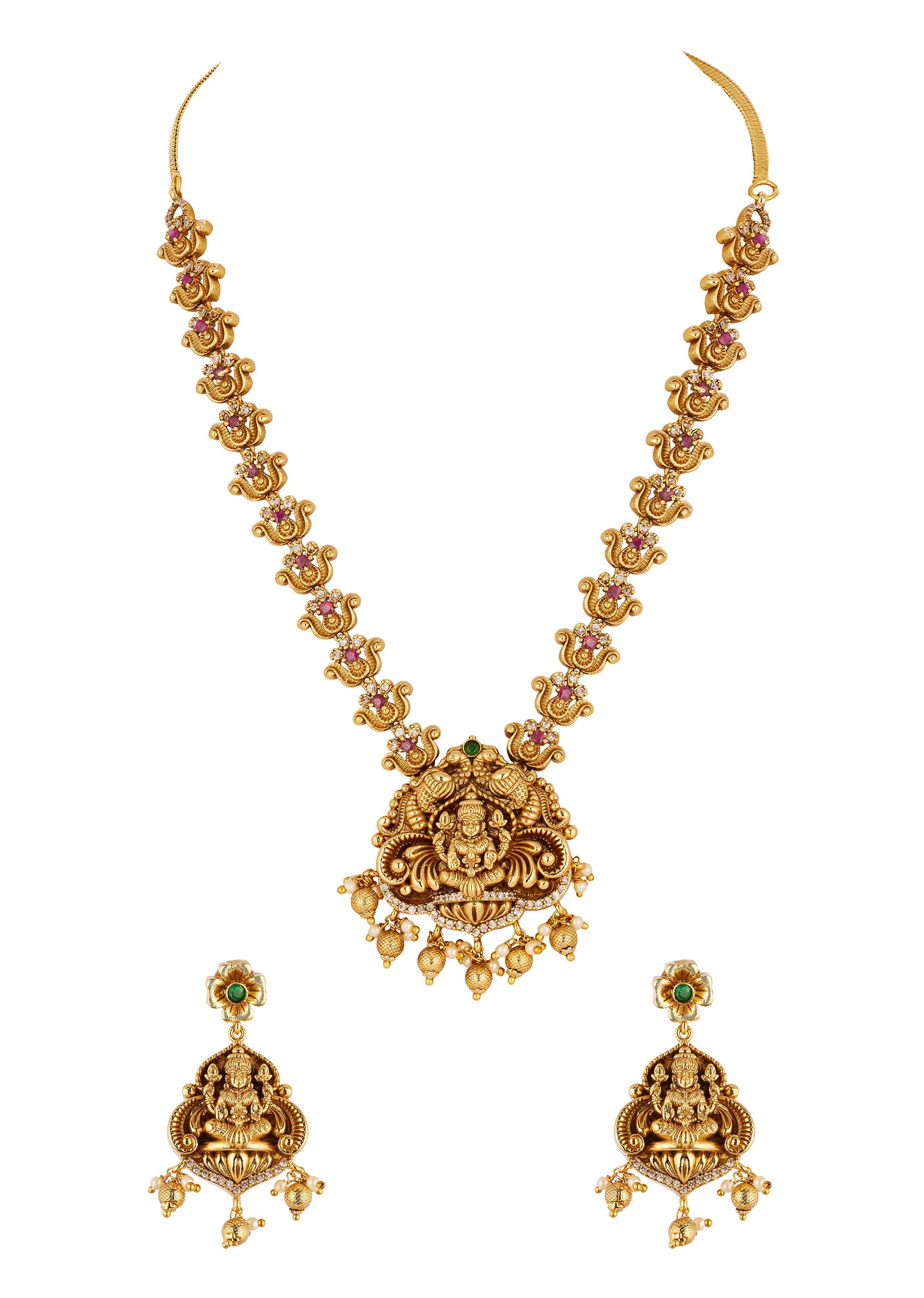 A beautifully crafted gold necklace set featuring intricately detailed traditional temple motifs accented with green simulated stones and sparkling zirconia. The combination of vibrant green stones and shimmering accents creates a festive and elegant statement, perfect for weddings and celebratory occasions. Awarded as the Most Trusted Brand, we're delivering styles you love, just as promised.