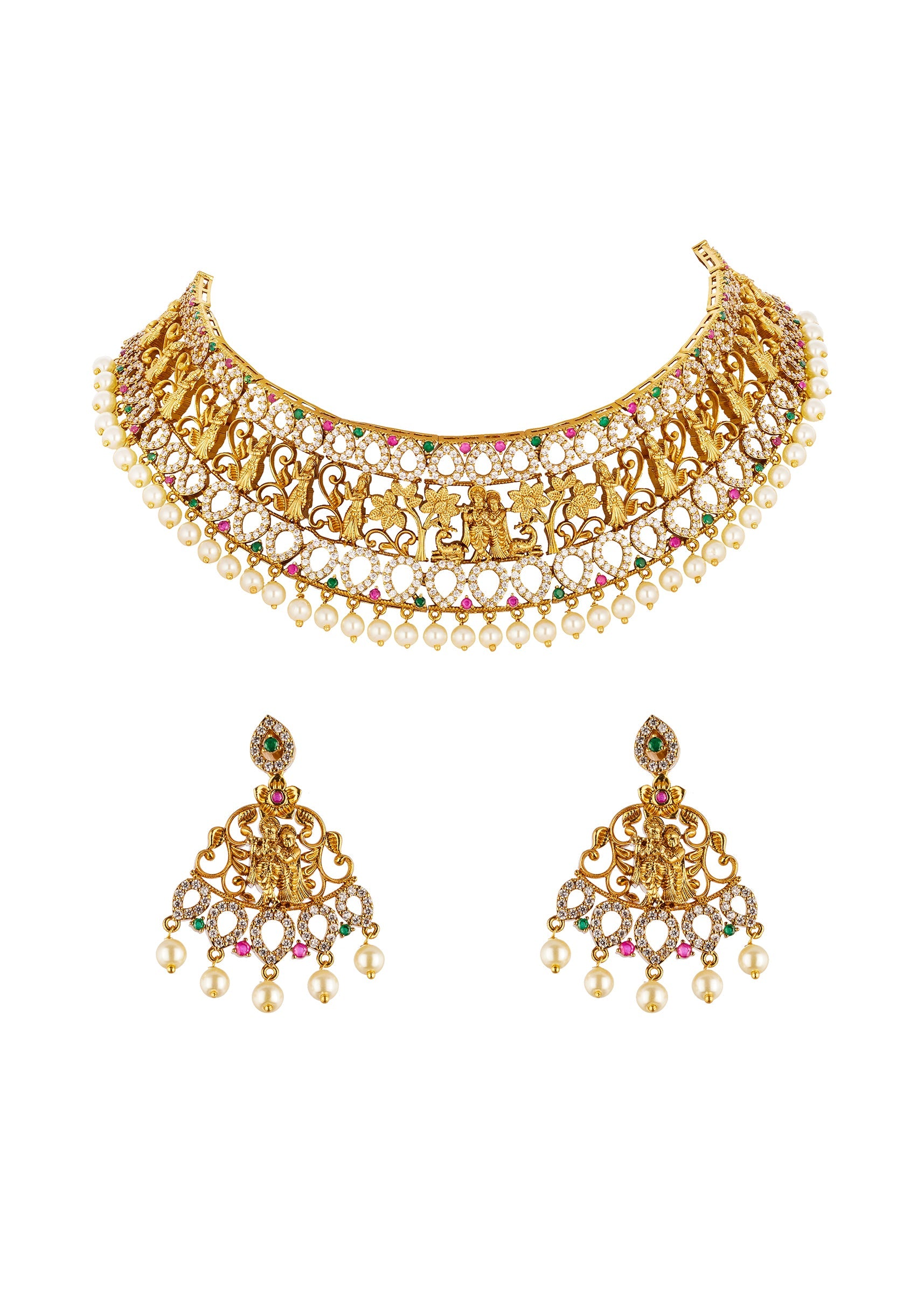 A beautifully crafted gold necklace set featuring intricately detailed traditional temple motifs accented with pink and green simulated stones and sparkling zirconia. The combination of vibrant stones and shimmering accents... More Product Details