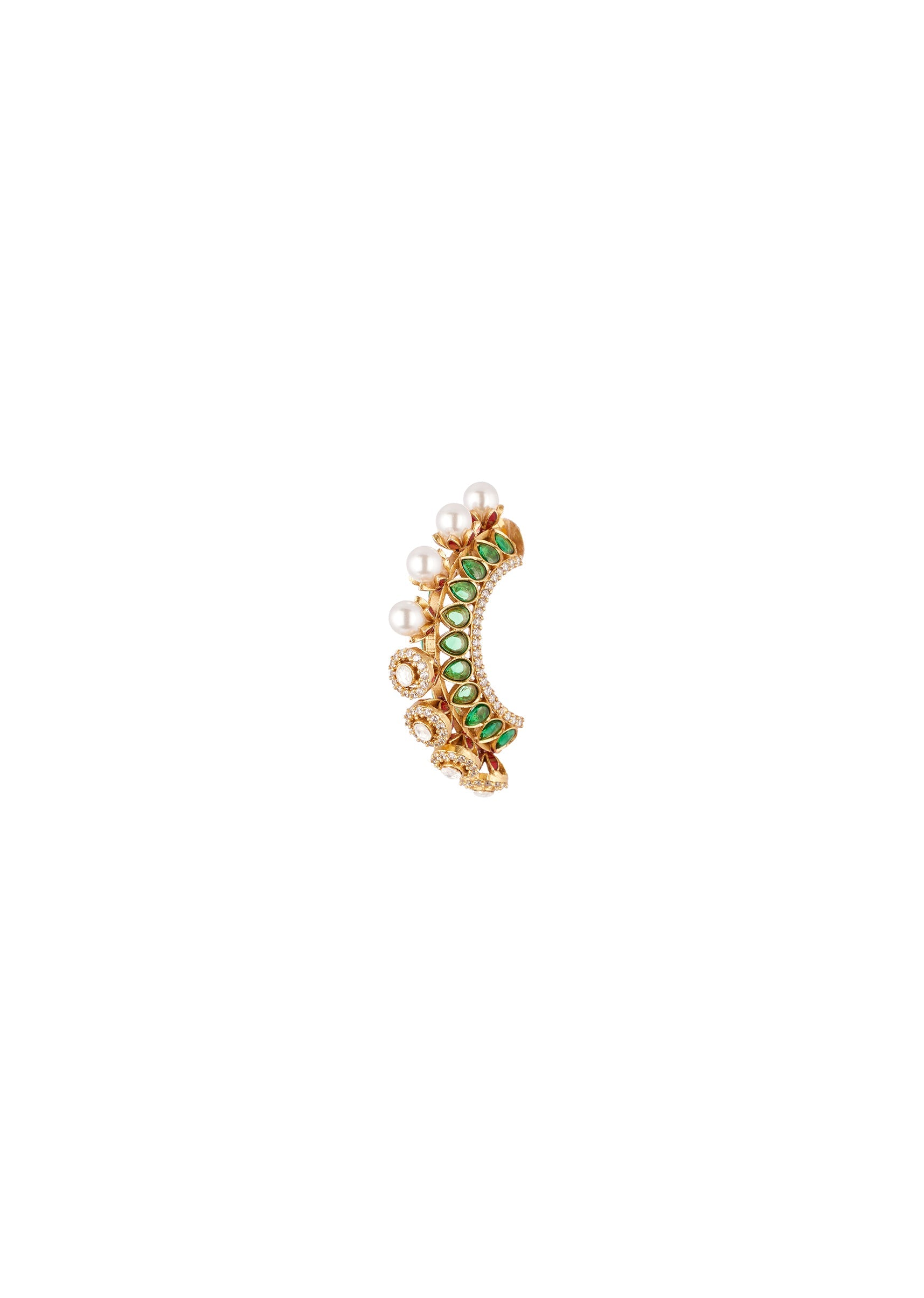 Gold Finish Ornate C Hoop Earrings With Green Decorative Stones and Simulated Pearls