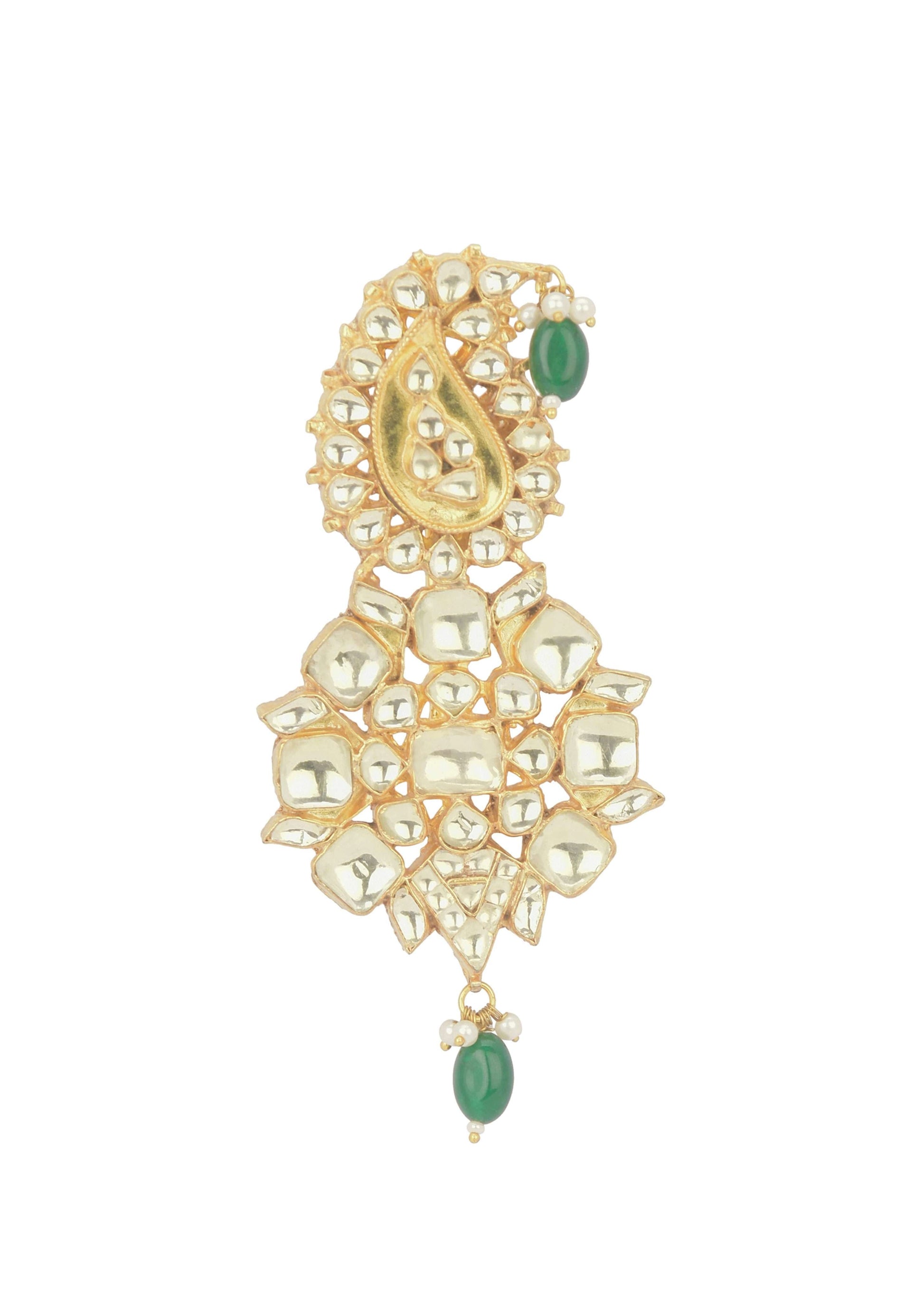 Gold Finish Paisley Kalgi With Kundan And Green Bead Drops