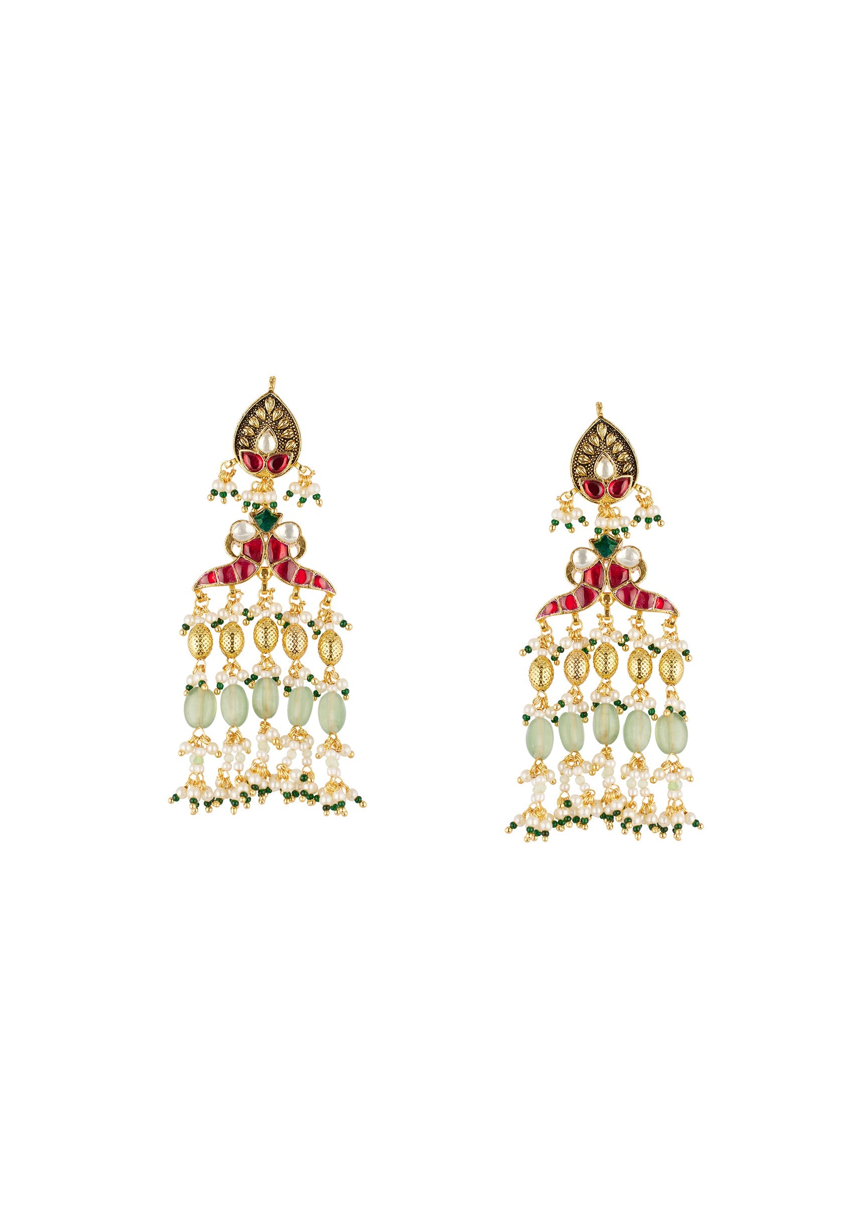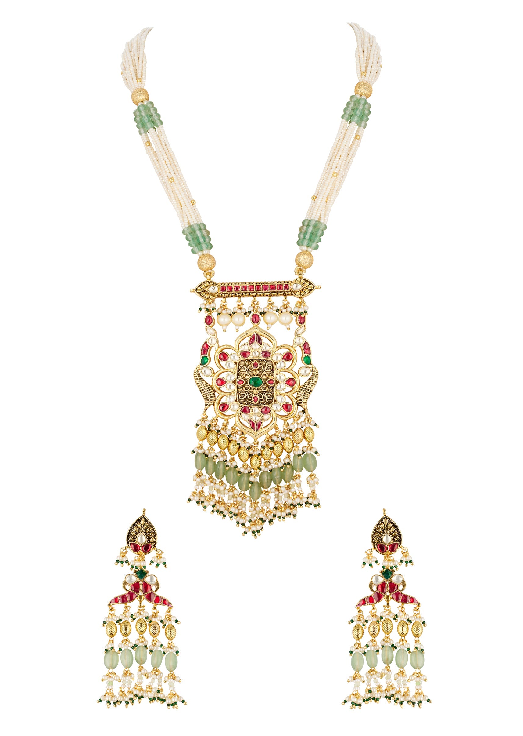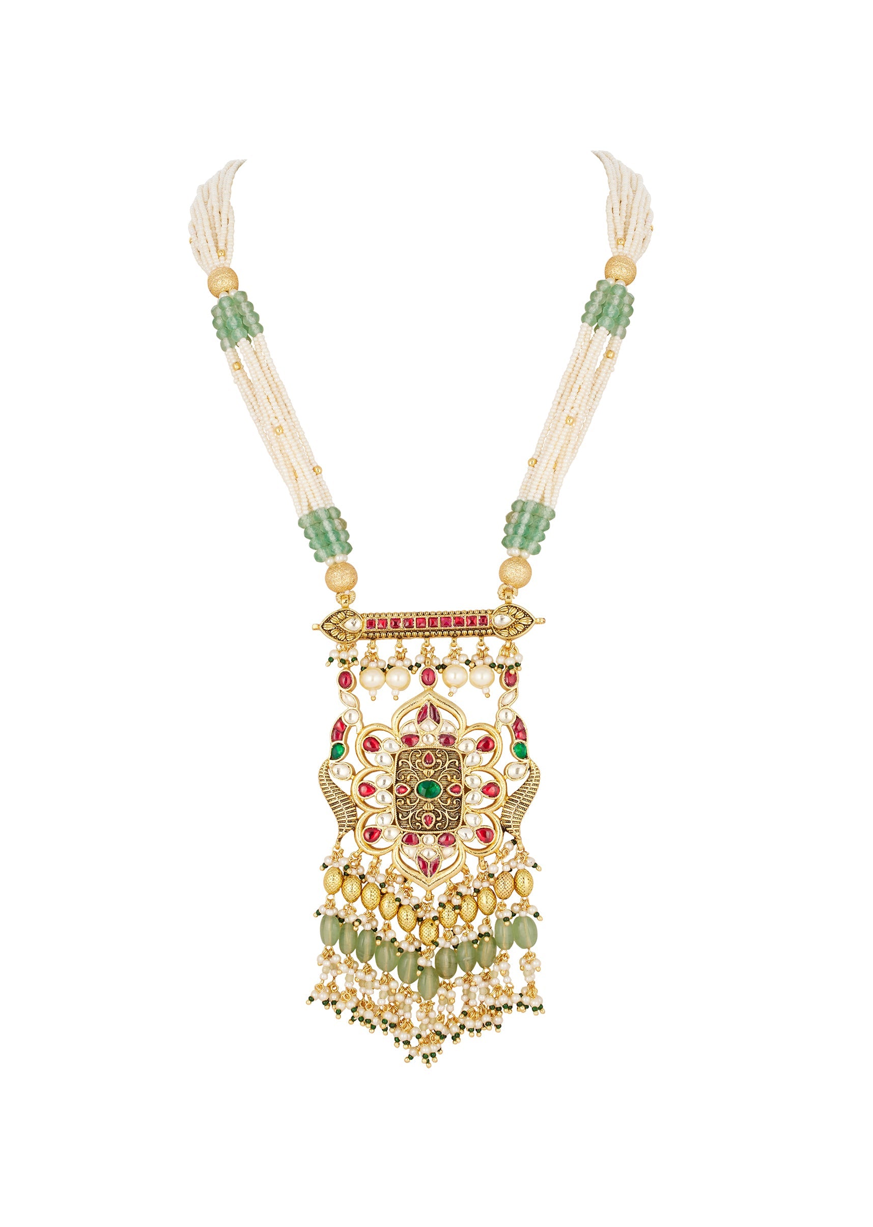 This traditional gold finish Rani Haar necklace set is crafted in mix metal and features a temple inspired design adorned with green and red simulated stones and delicate faux pearls.... More Product Details