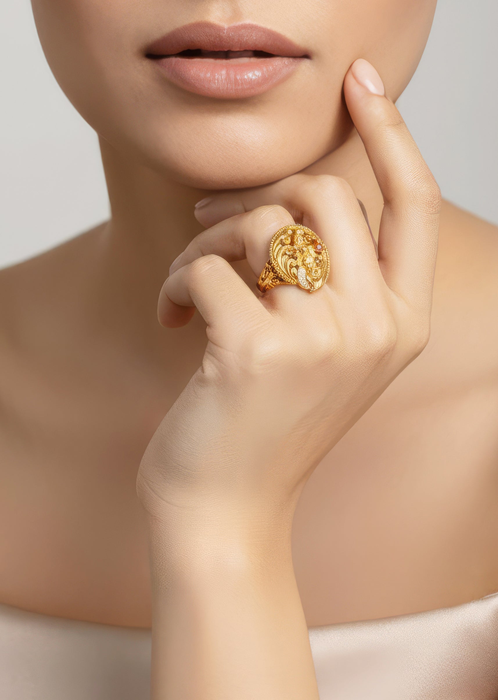 A traditional temple inspired ring crafted in a radiant gold finish. The design features intricate temple motifs accented with simulated pink and white stones that add a festive and elegant charm. Perfect for weddings and special occasions, this ring enhances bridal and family looks with timeless ethnic appeal.