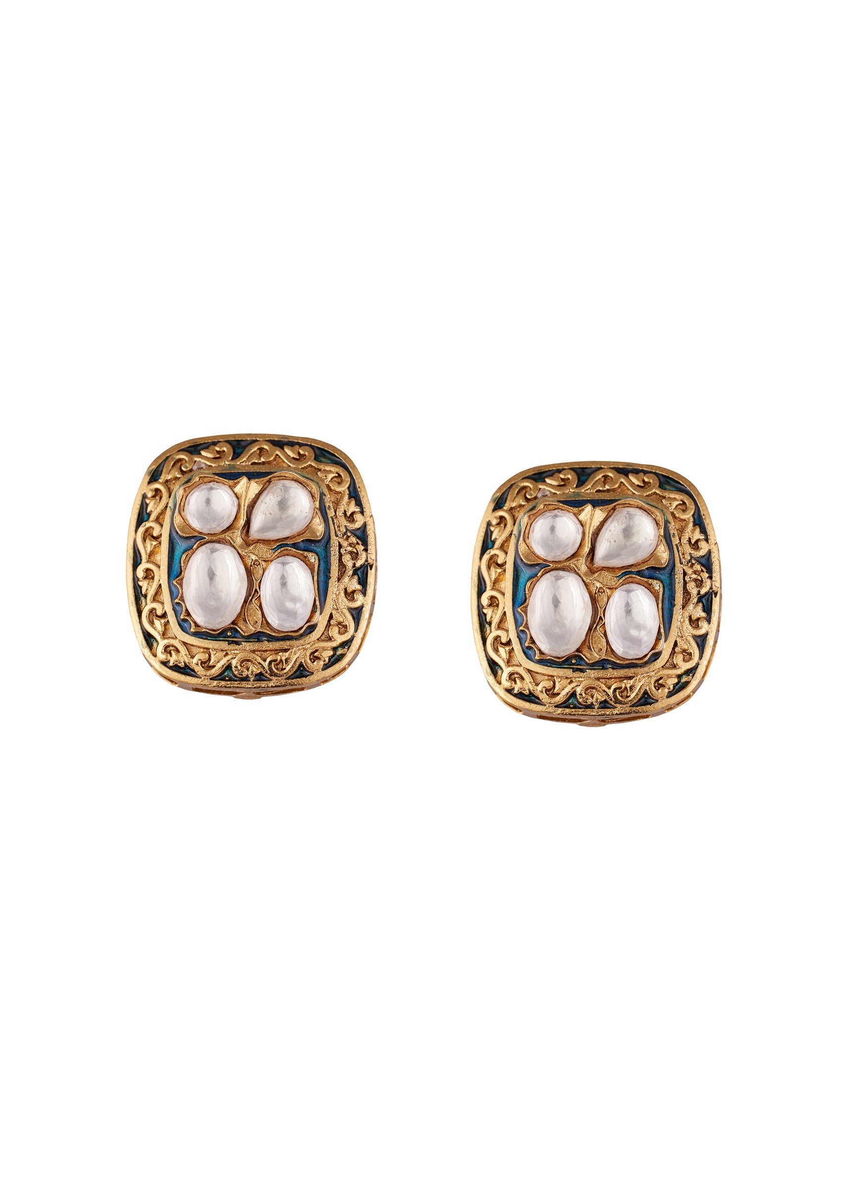 Gold Finish Square Stud Earrings With Blue Enamel Ornate Border And Kundan Set White Stones