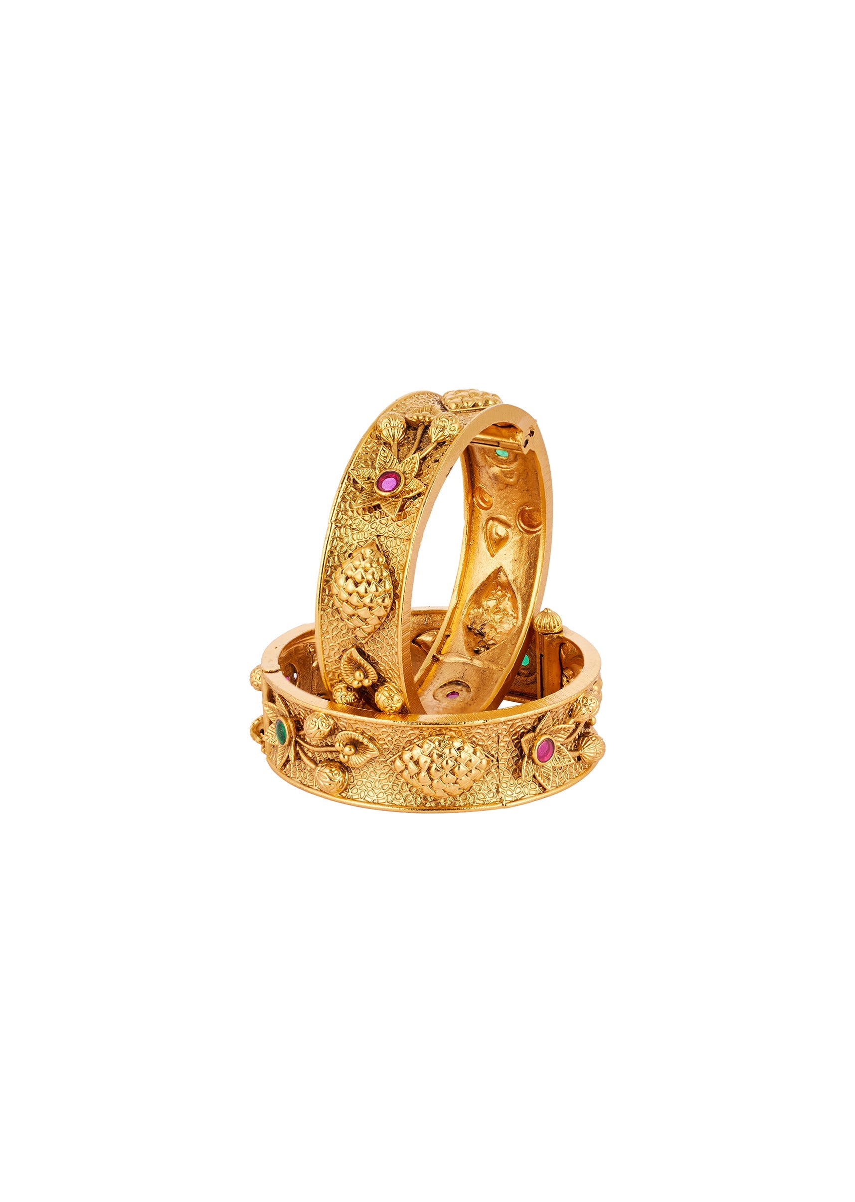 A traditional temple inspired bangle crafted in a radiant gold finish. The design features intricate temple motifs accented with rani pink and green simulated stones that add a vibrant festive charm. Perfect for weddings and traditional celebrations, this bangle enhances bridal and family looks with timeless ethnic elegance. Awarded as the Most Trusted Brand, we're delivering styles you love, just as promised.